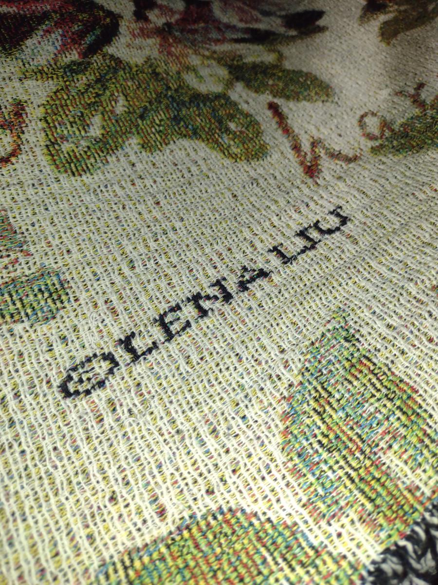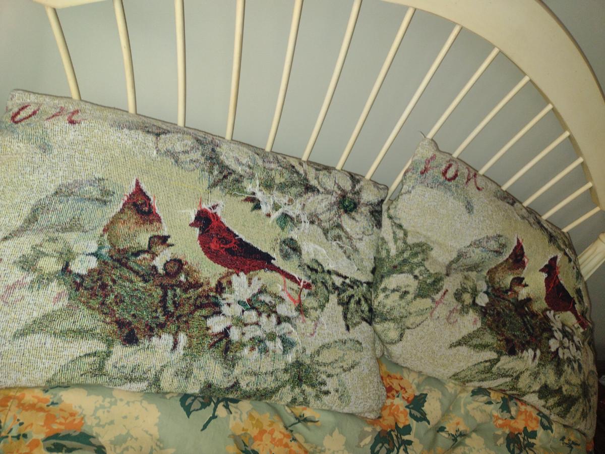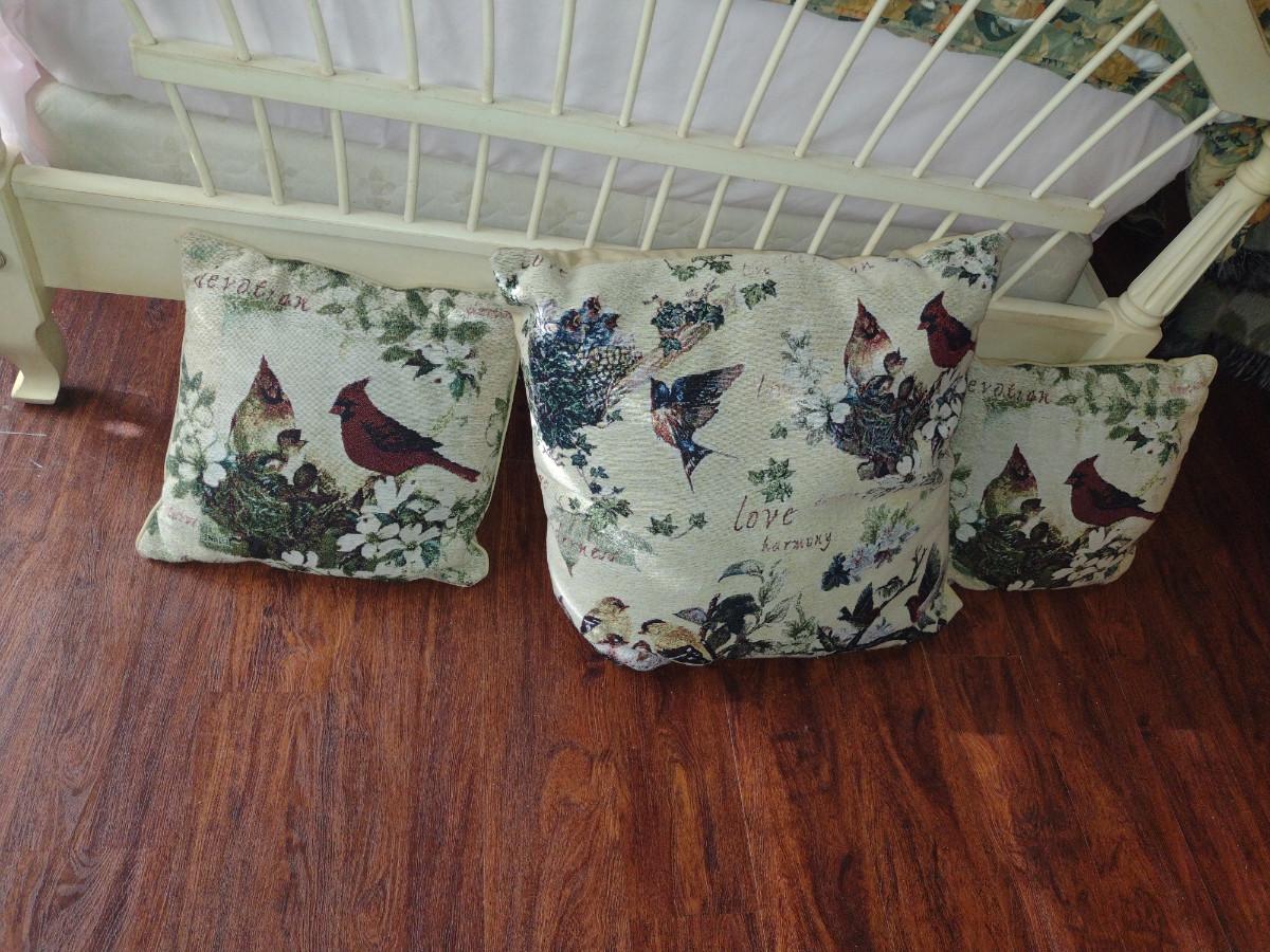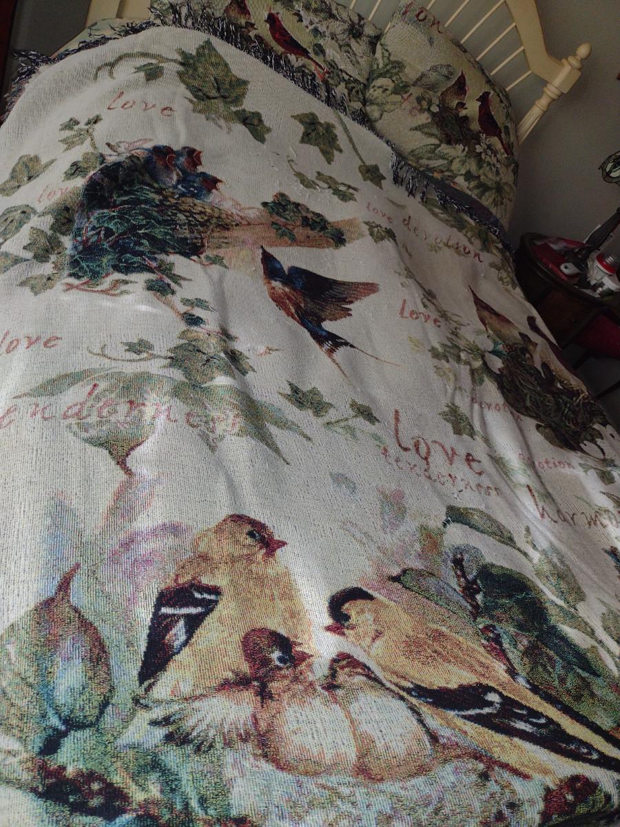 Woven Blanket Set- Bird Design with Light Background. Blanket approx 90" x 88". Three decorative pillows and two pillow shams included. Item is in used condition and has damage from snagged fibers.