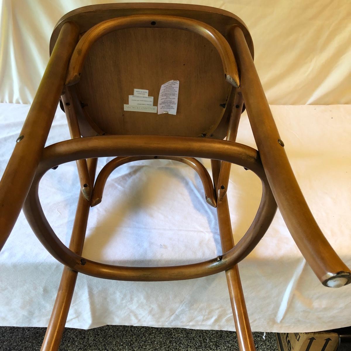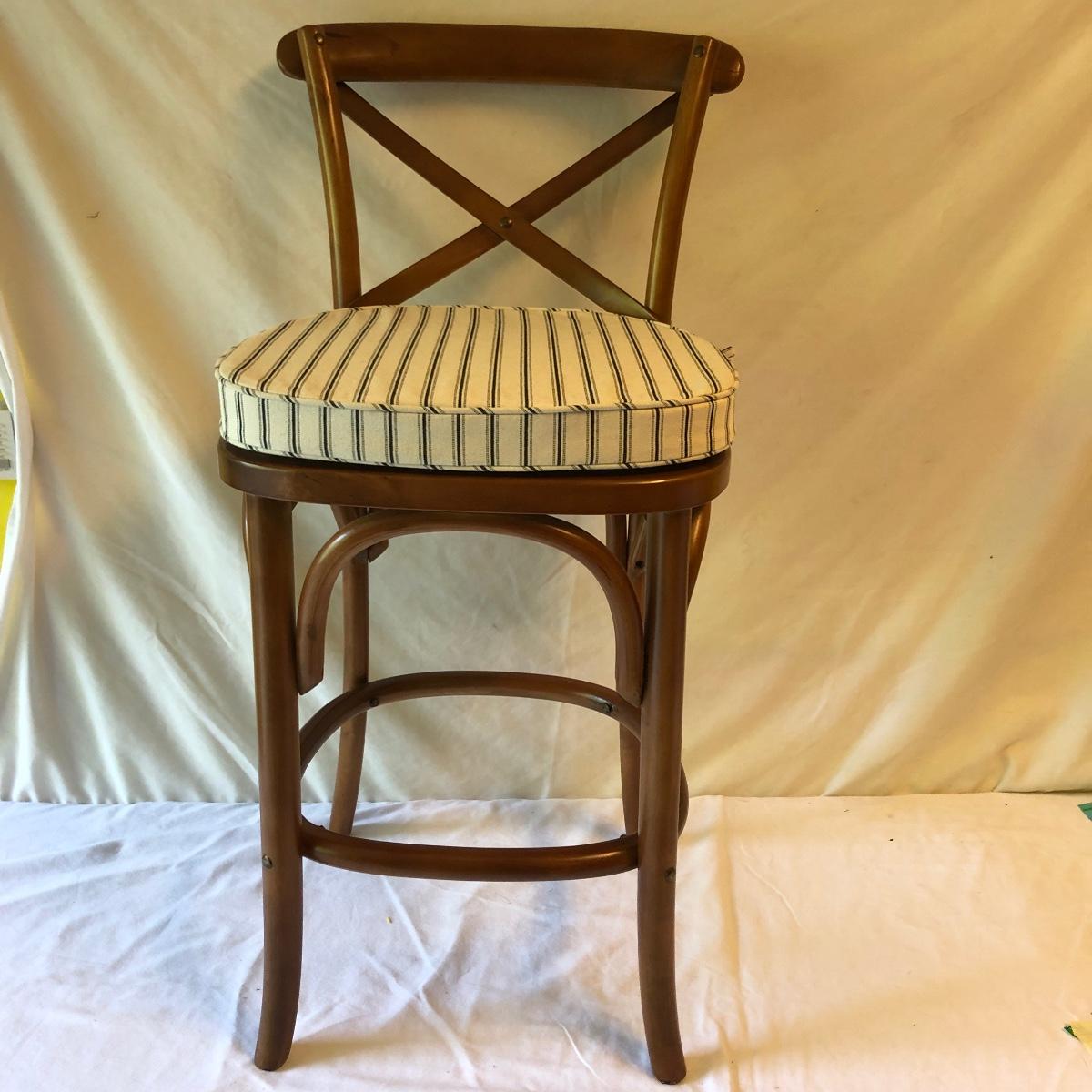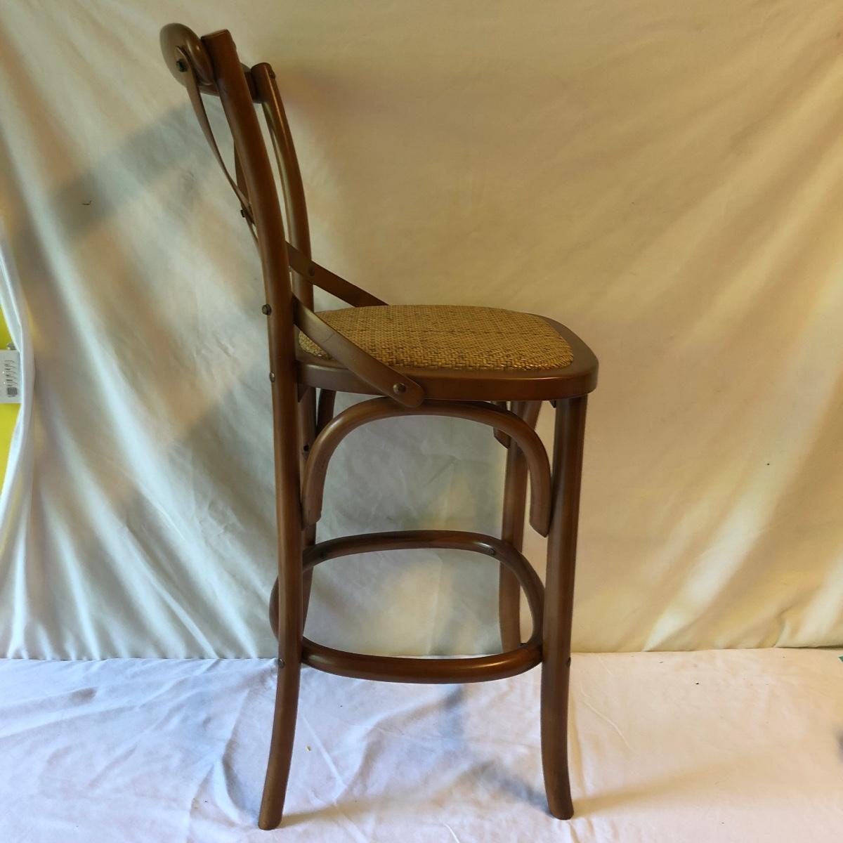 Lot includes a wooden counter height woven cane bottom chair with a seat cushion. Chair measures 16” x 16” x 36” with a seat height of 24”.