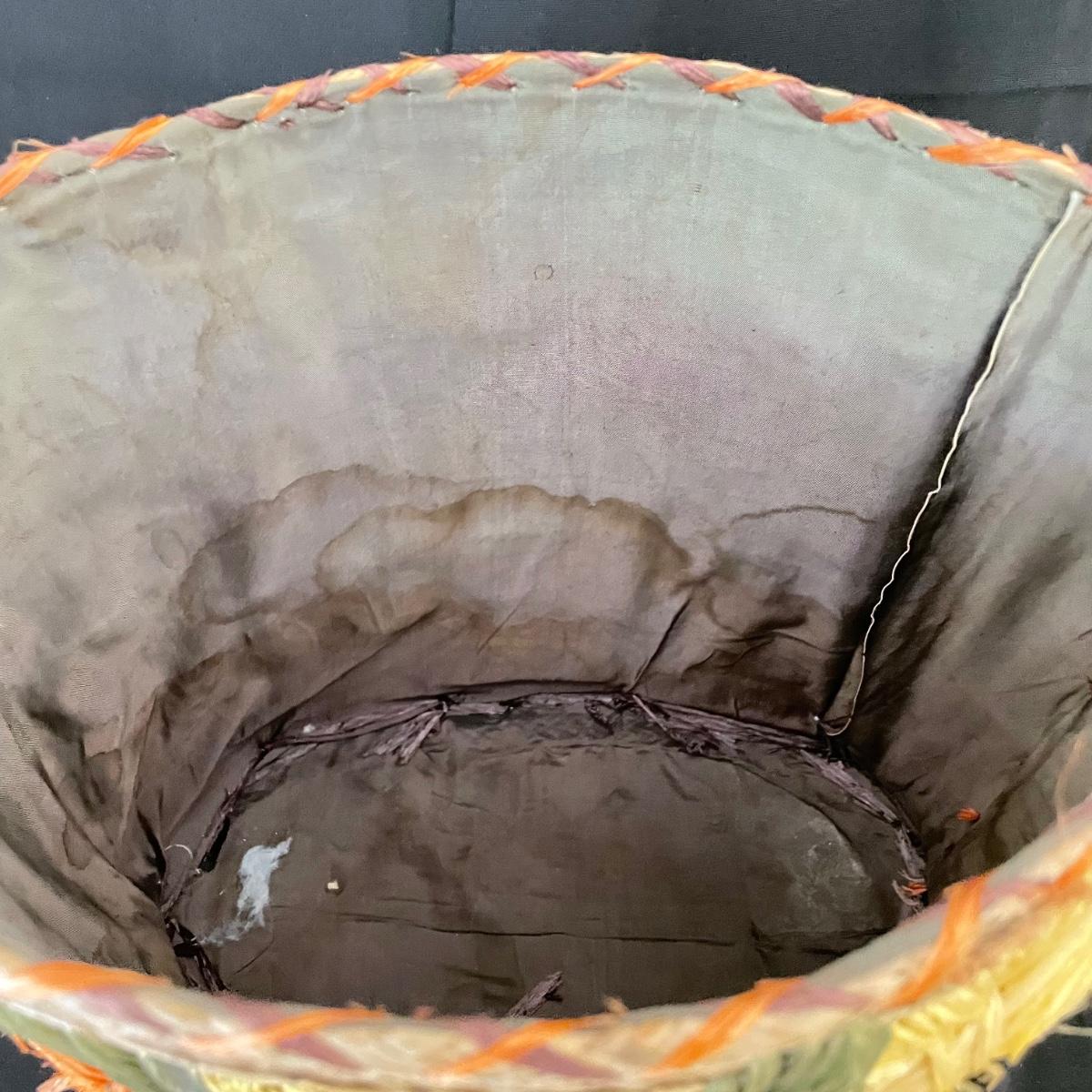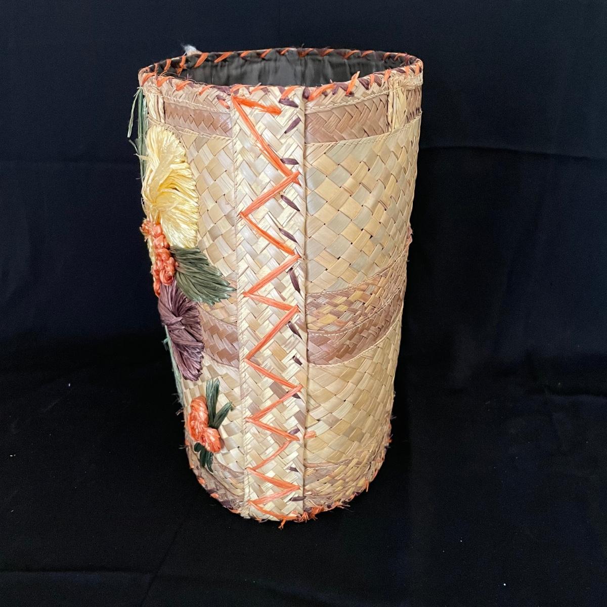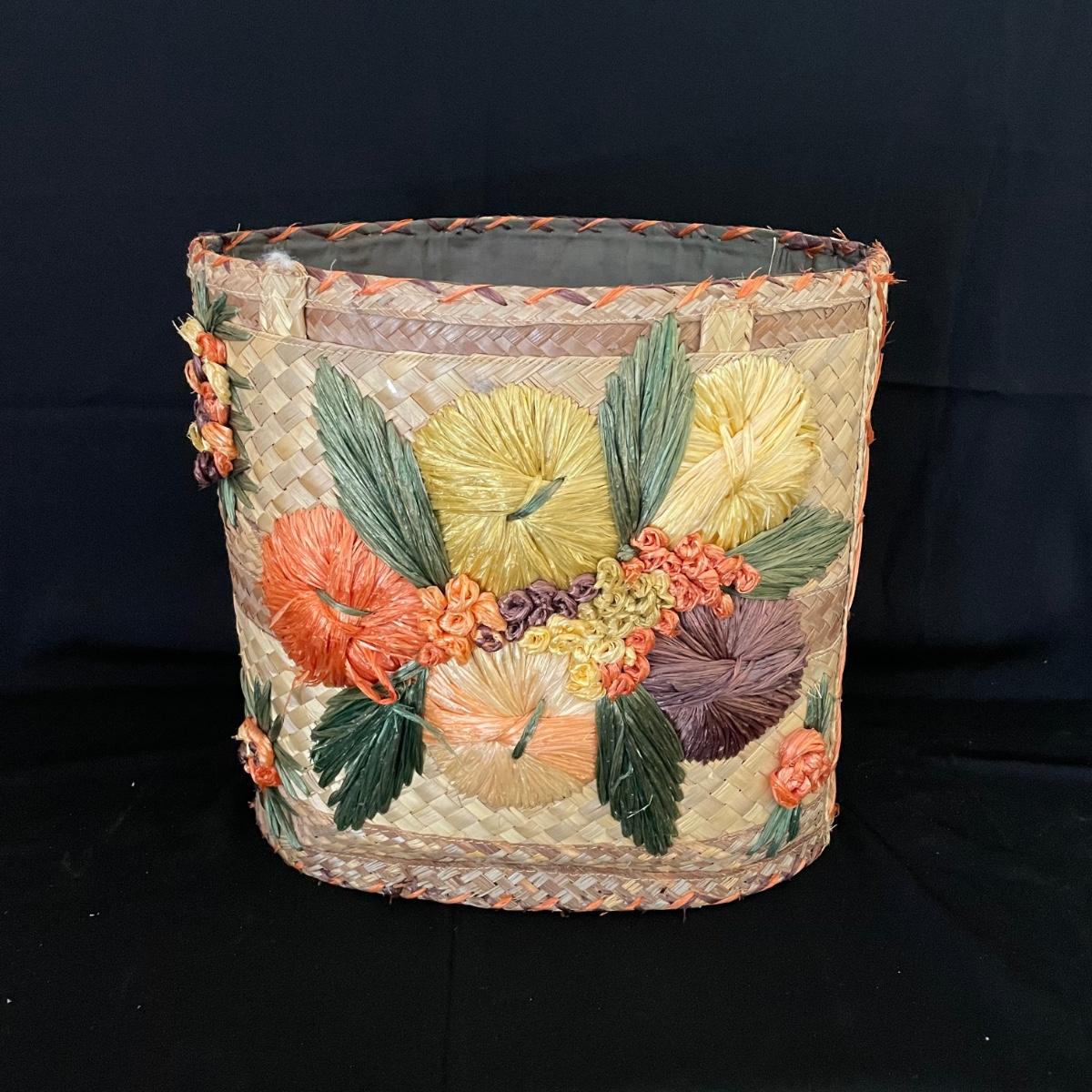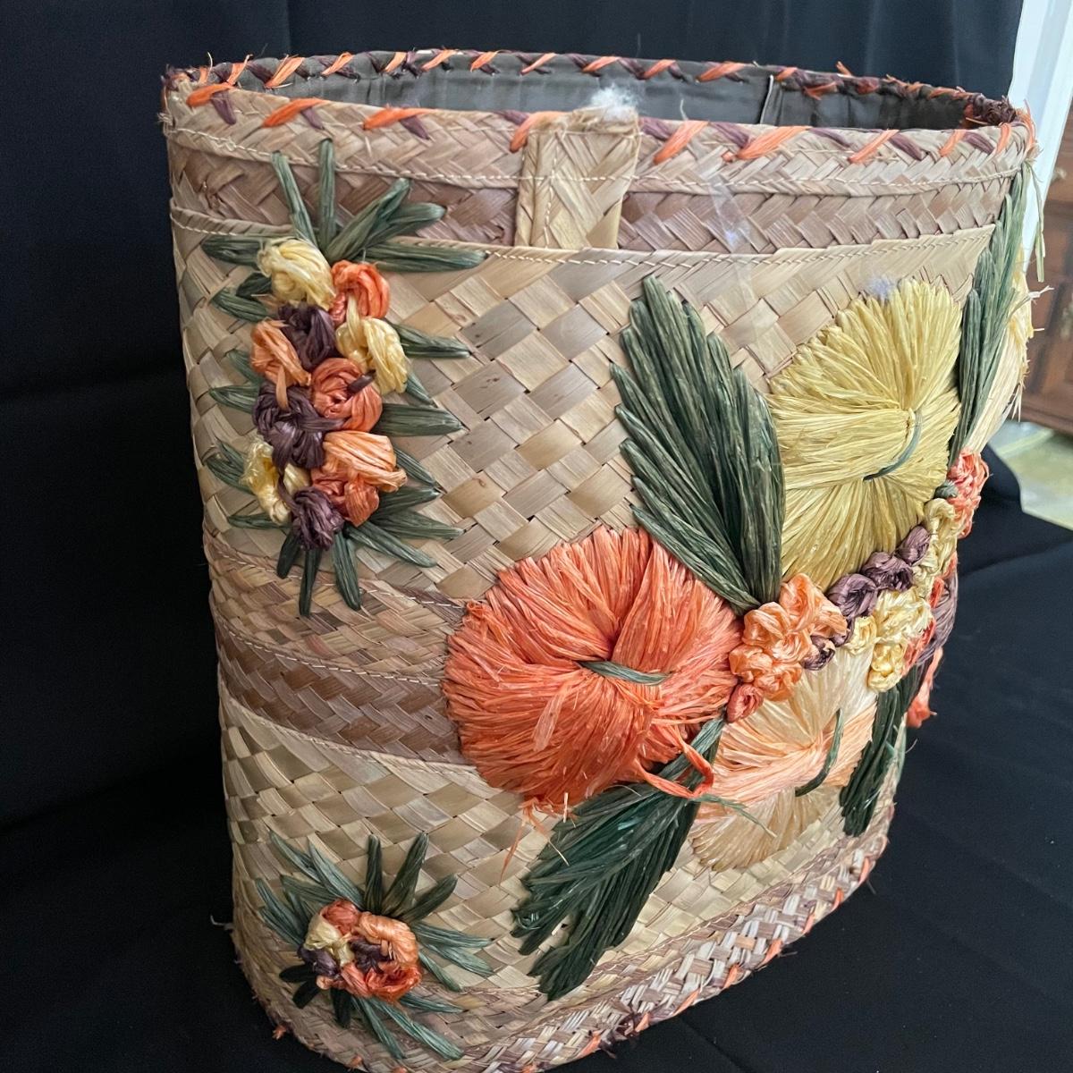 Colorful floral basket appears to be hand woven basket has a lightweight liner with some water spots inside. It appears to have been originally intended as a carrying bag, but the handles have been cut. At 11” x 7” x 11” it would make an ideal waste paper basket. See images. Shipping available.