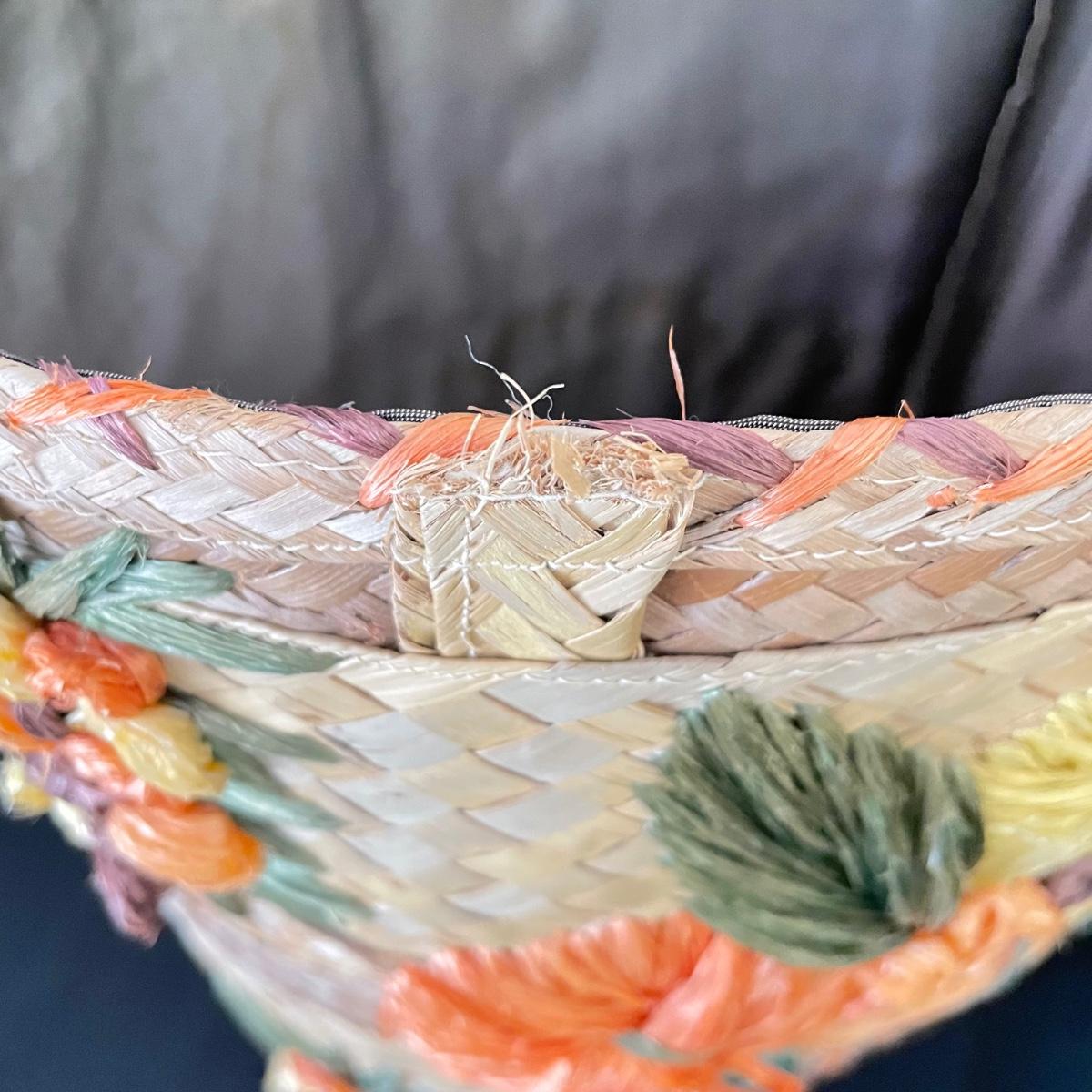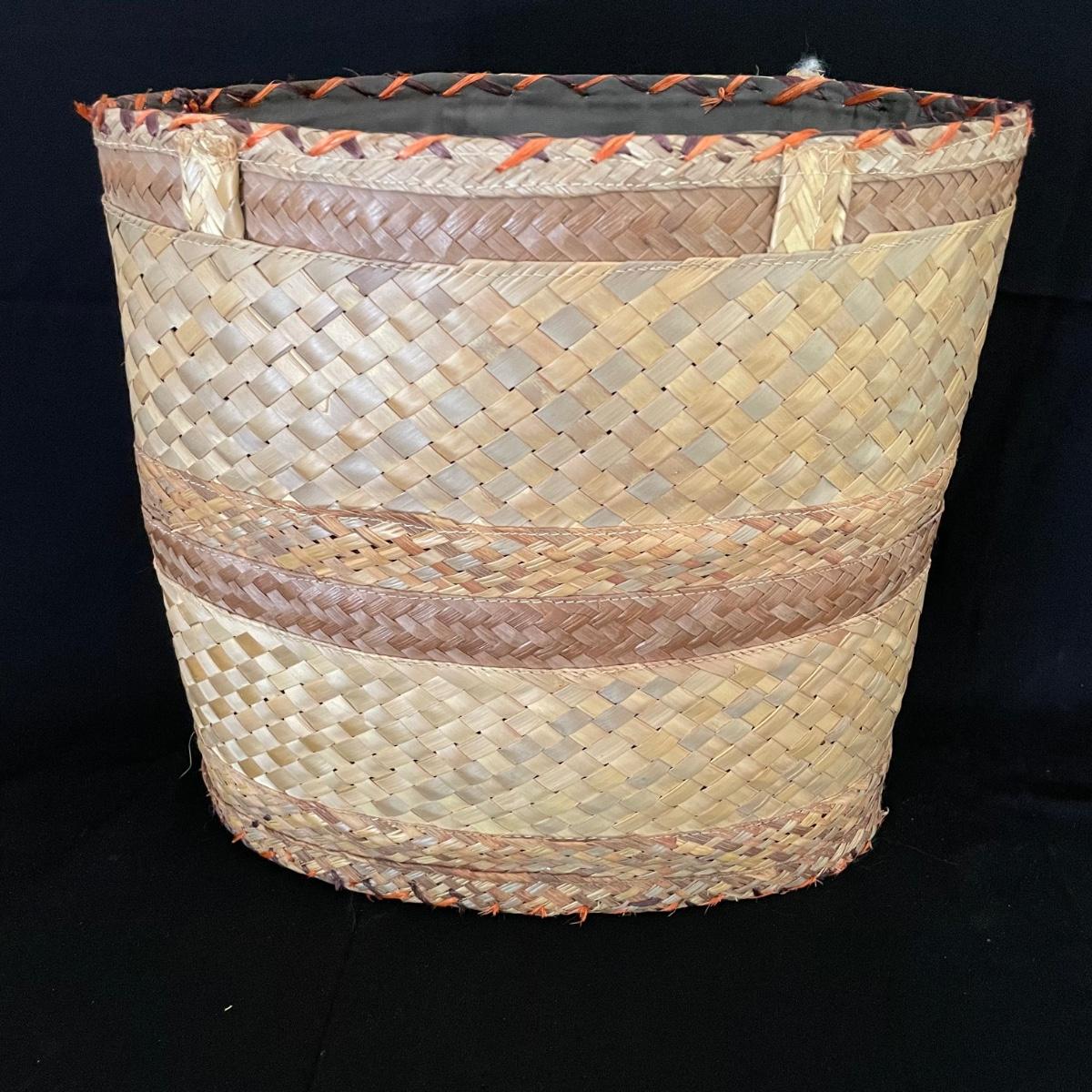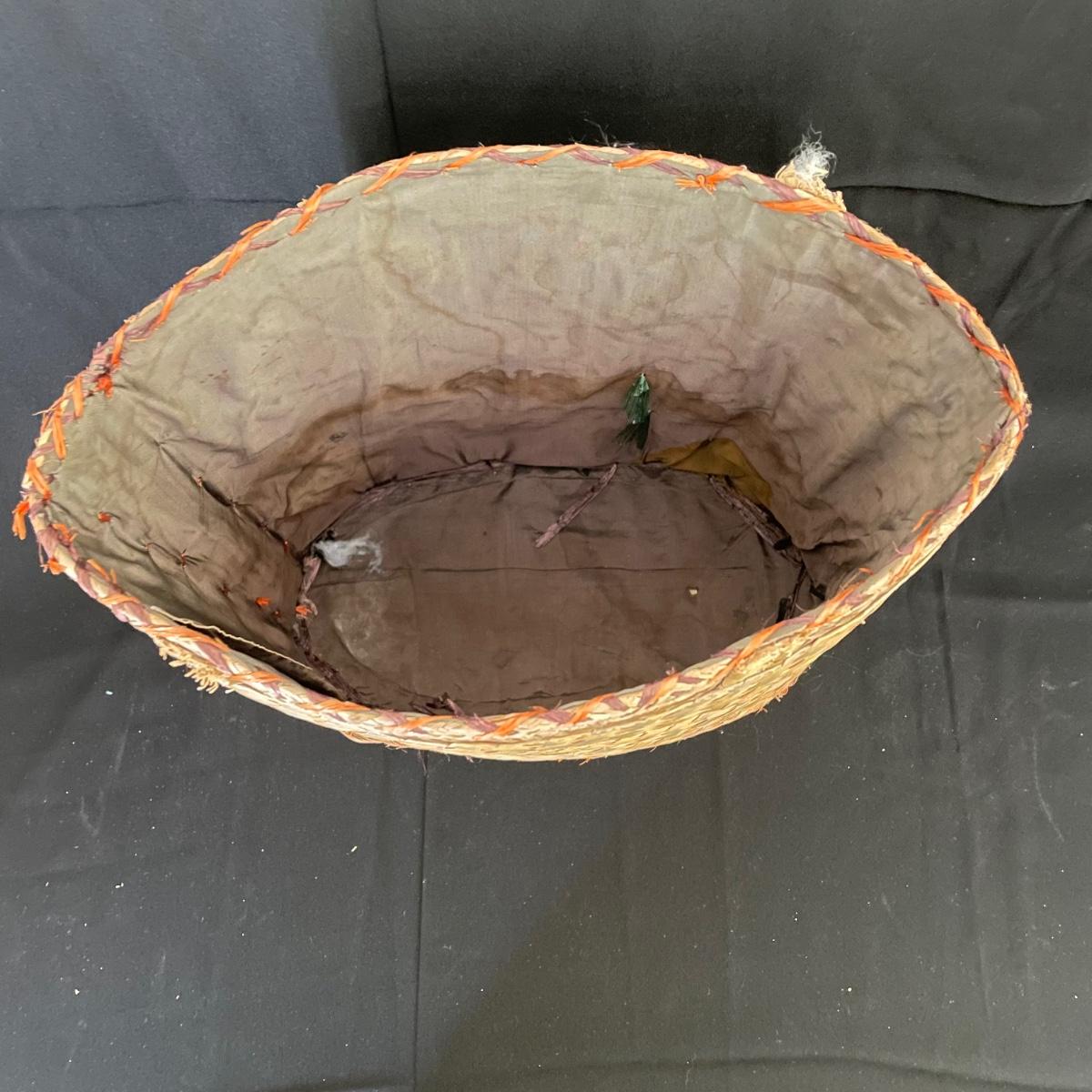 Colorful floral basket appears to be hand woven basket has a lightweight liner with some water spots inside. It appears to have been originally intended as a carrying bag, but the handles have been cut. At 11” x 7” x 11” it would make an ideal waste paper basket. See images. Shipping available.