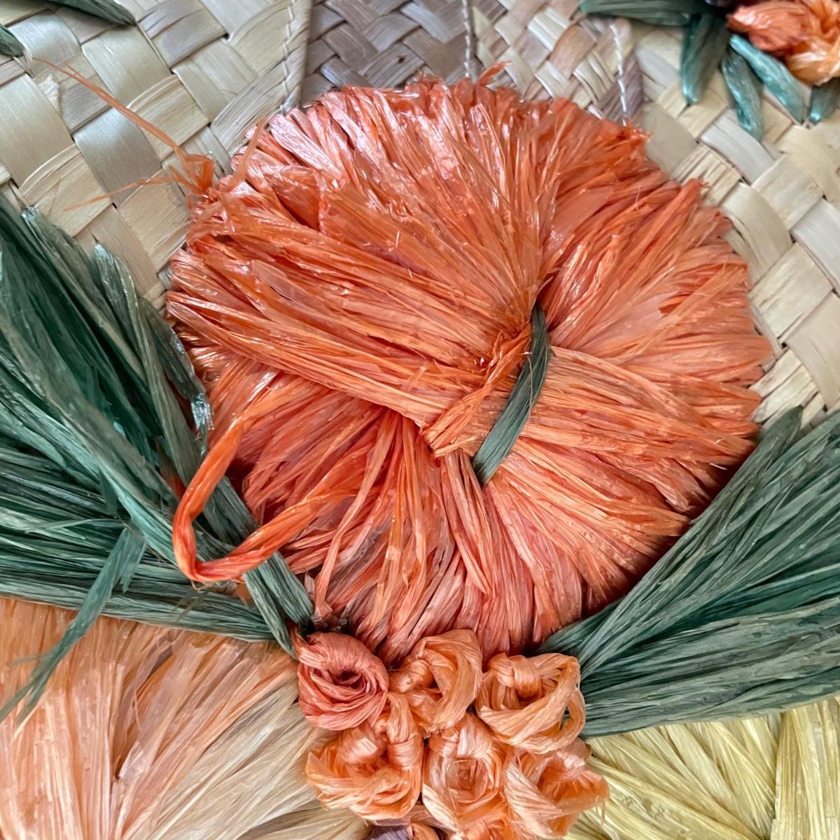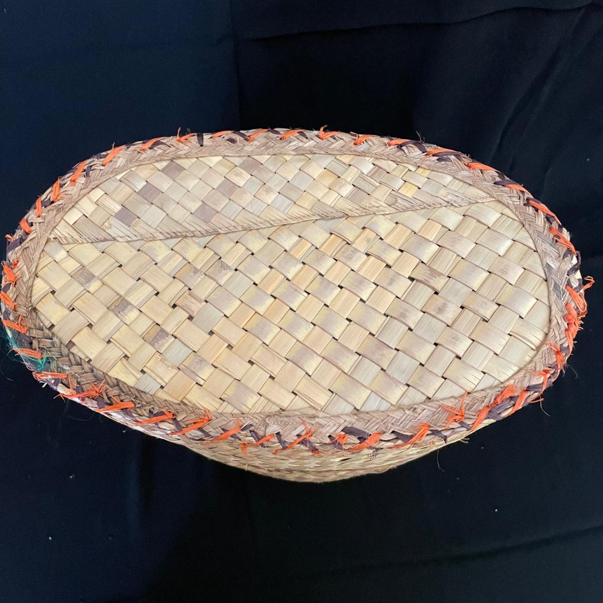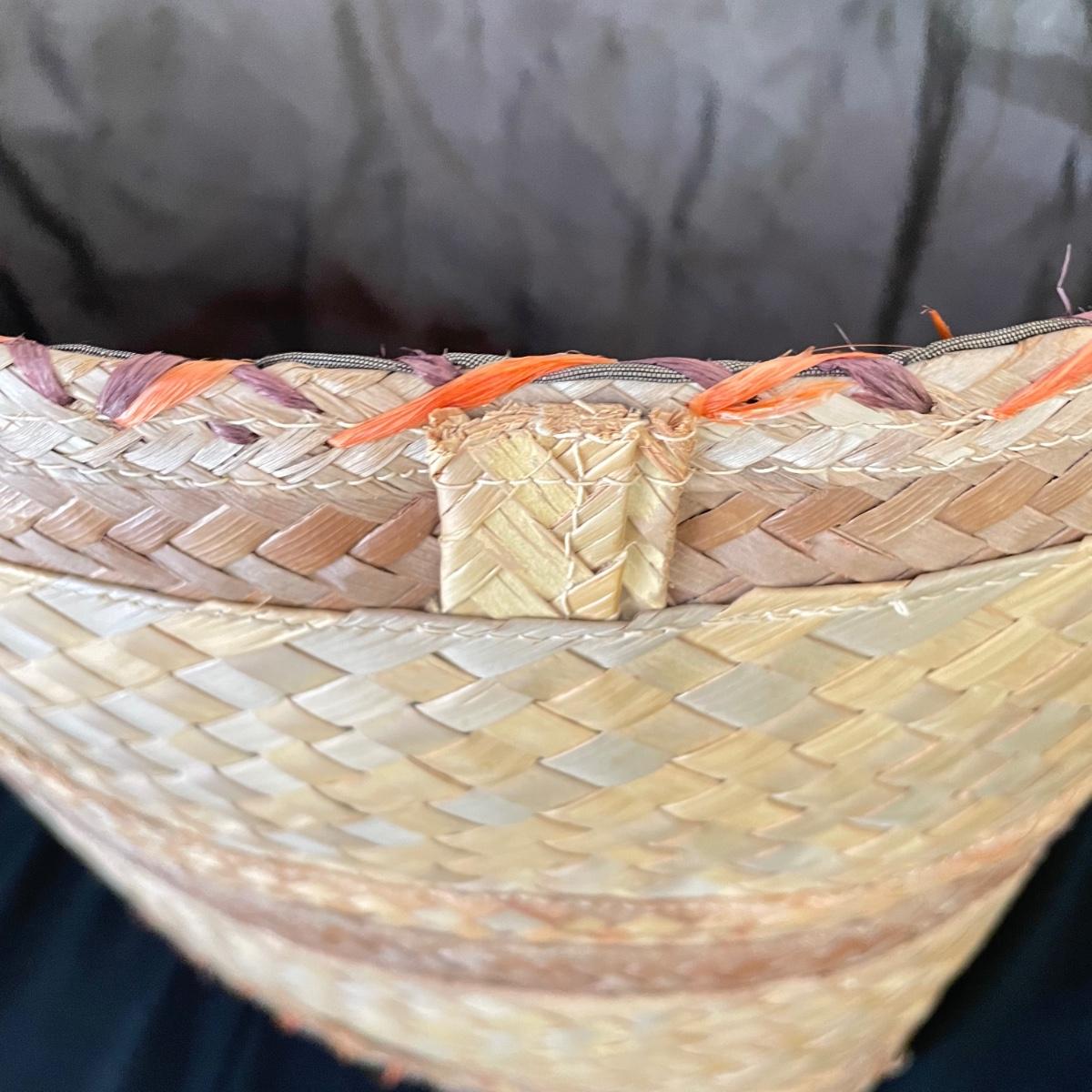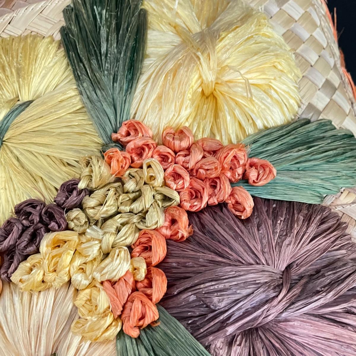 Colorful floral basket appears to be hand woven basket has a lightweight liner with some water spots inside. It appears to have been originally intended as a carrying bag, but the handles have been cut. At 11” x 7” x 11” it would make an ideal waste paper basket. See images. Shipping available.