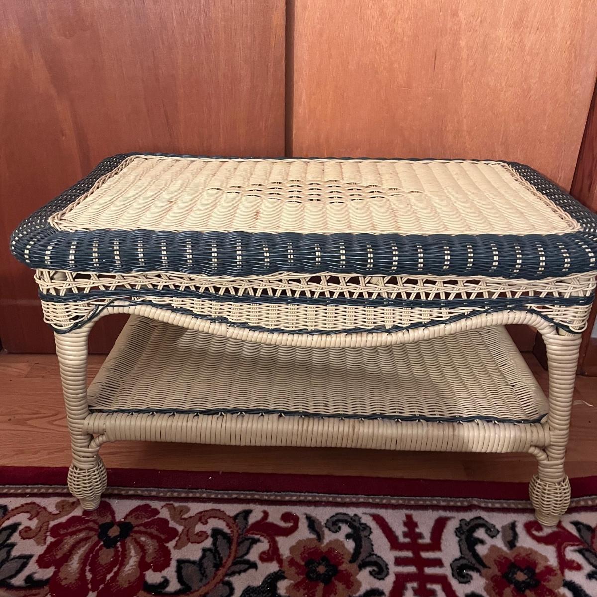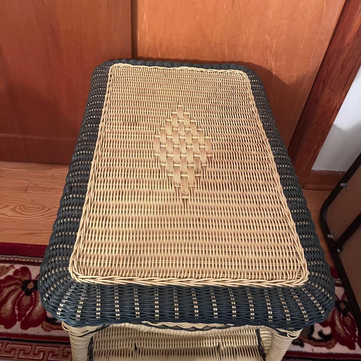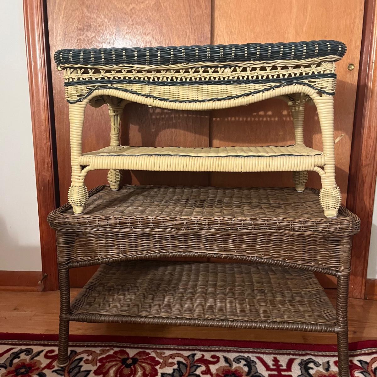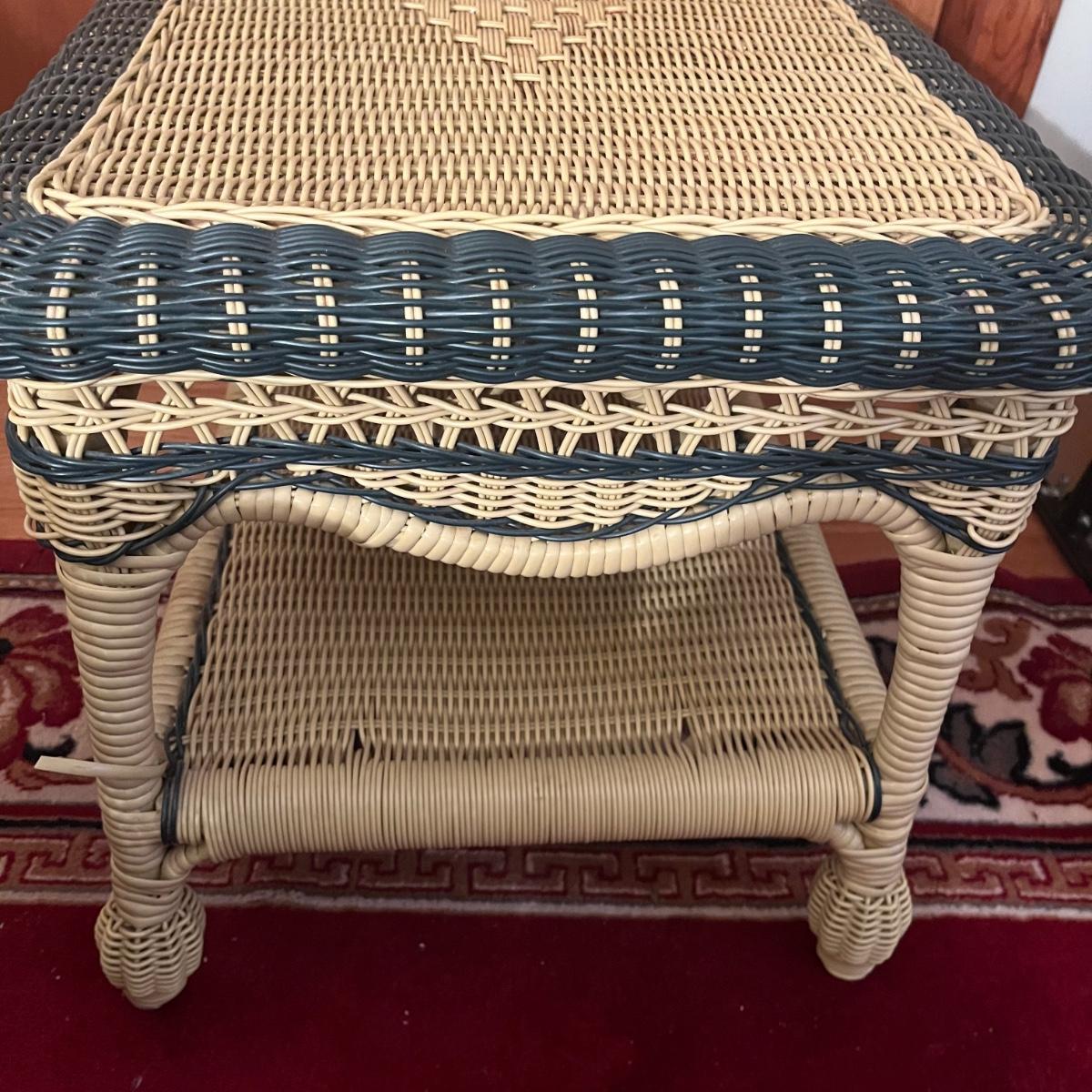Lot includes a brown woven coffee table with shelf underneath and a cream and green colored coffee table with shelf underneath. Both table are wicker woven from a plastic that looks like rattan. Brown table measures 20” x 34” x 18.5”.