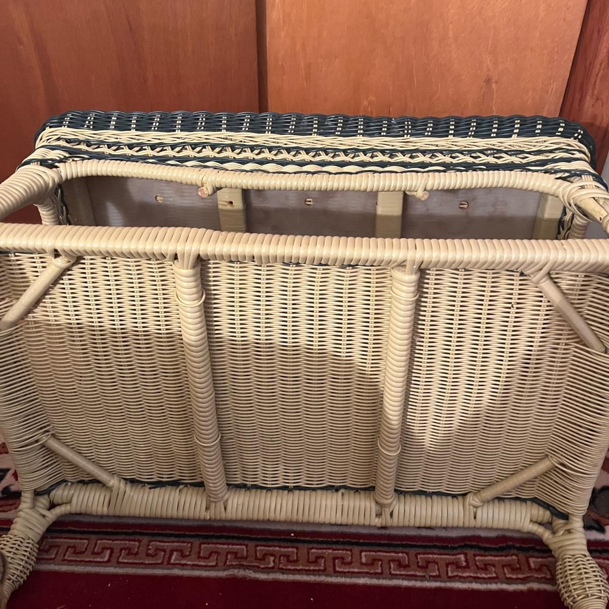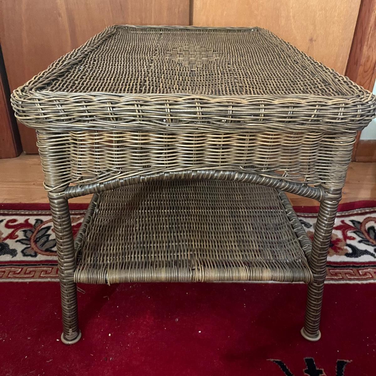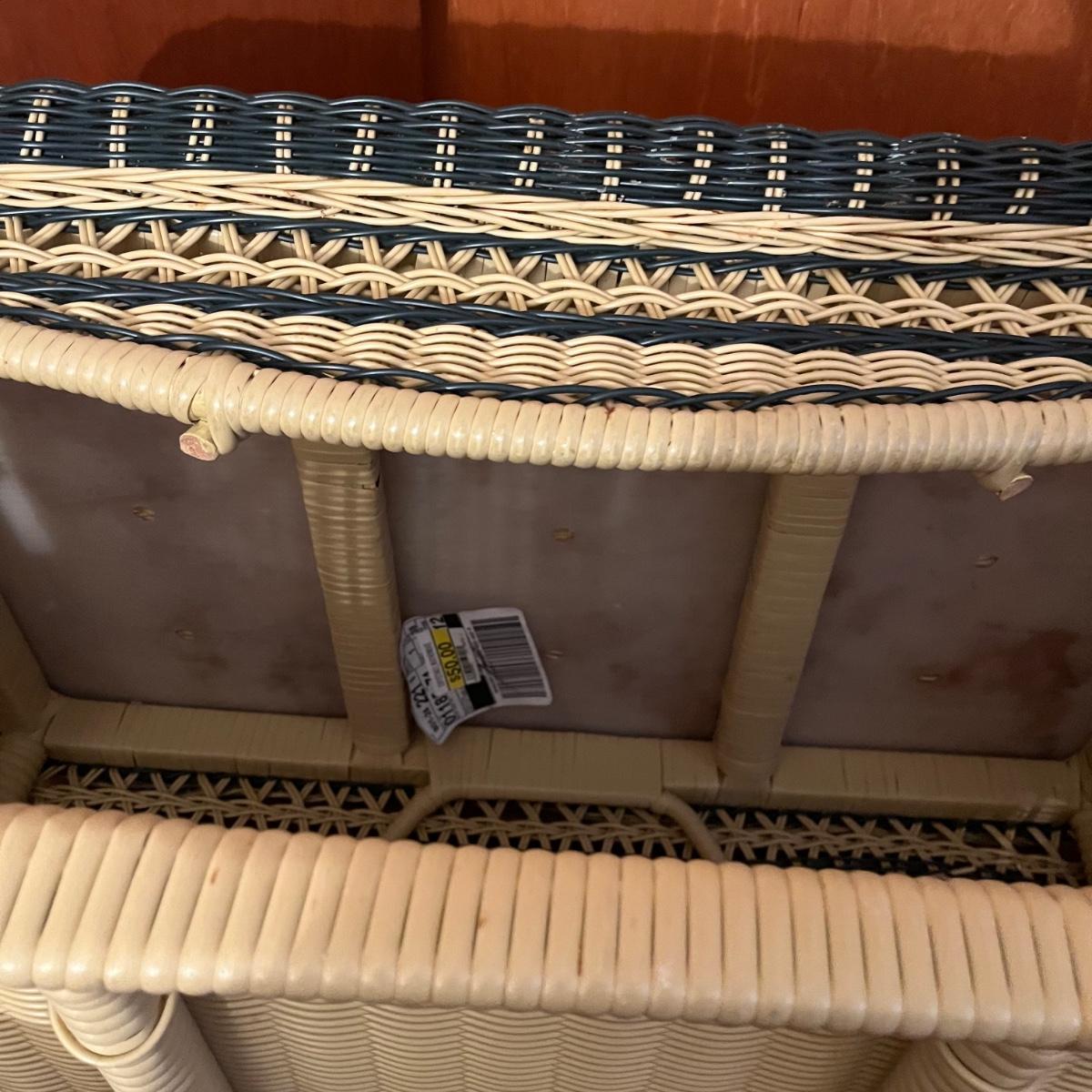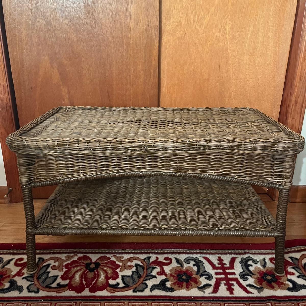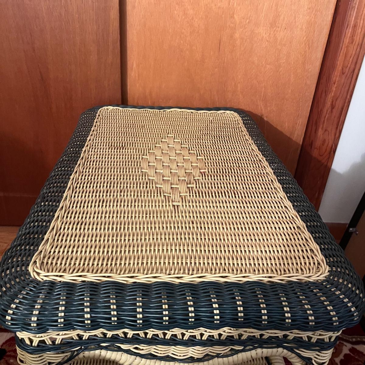 Lot includes a brown woven coffee table with shelf underneath and a cream and green colored coffee table with shelf underneath. Both table are wicker woven from a plastic that looks like rattan. Brown table measures 20” x 34” x 18.5”.