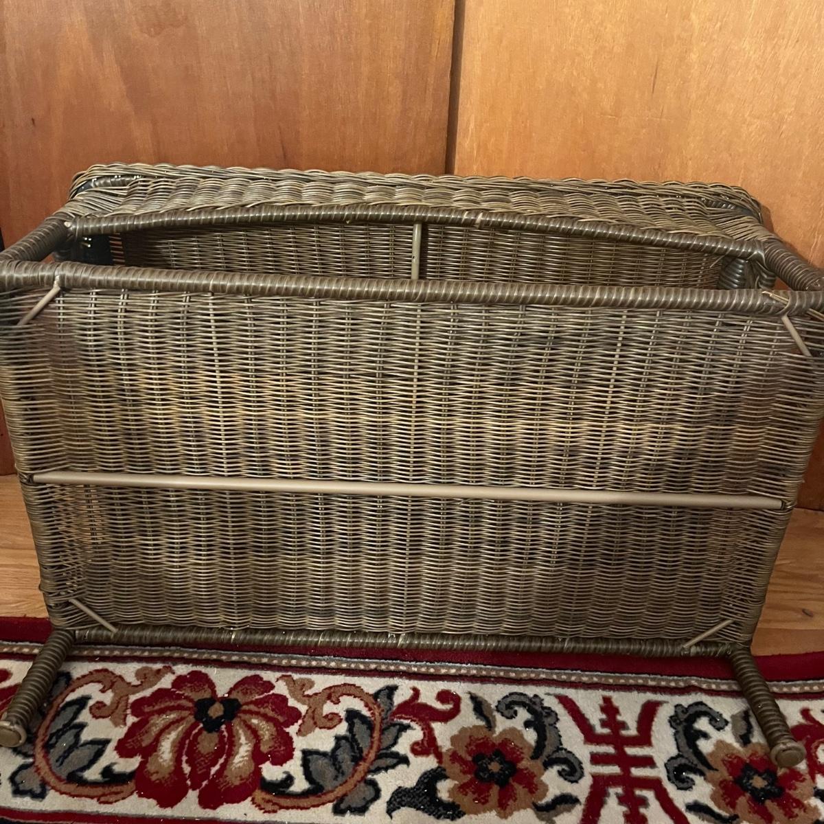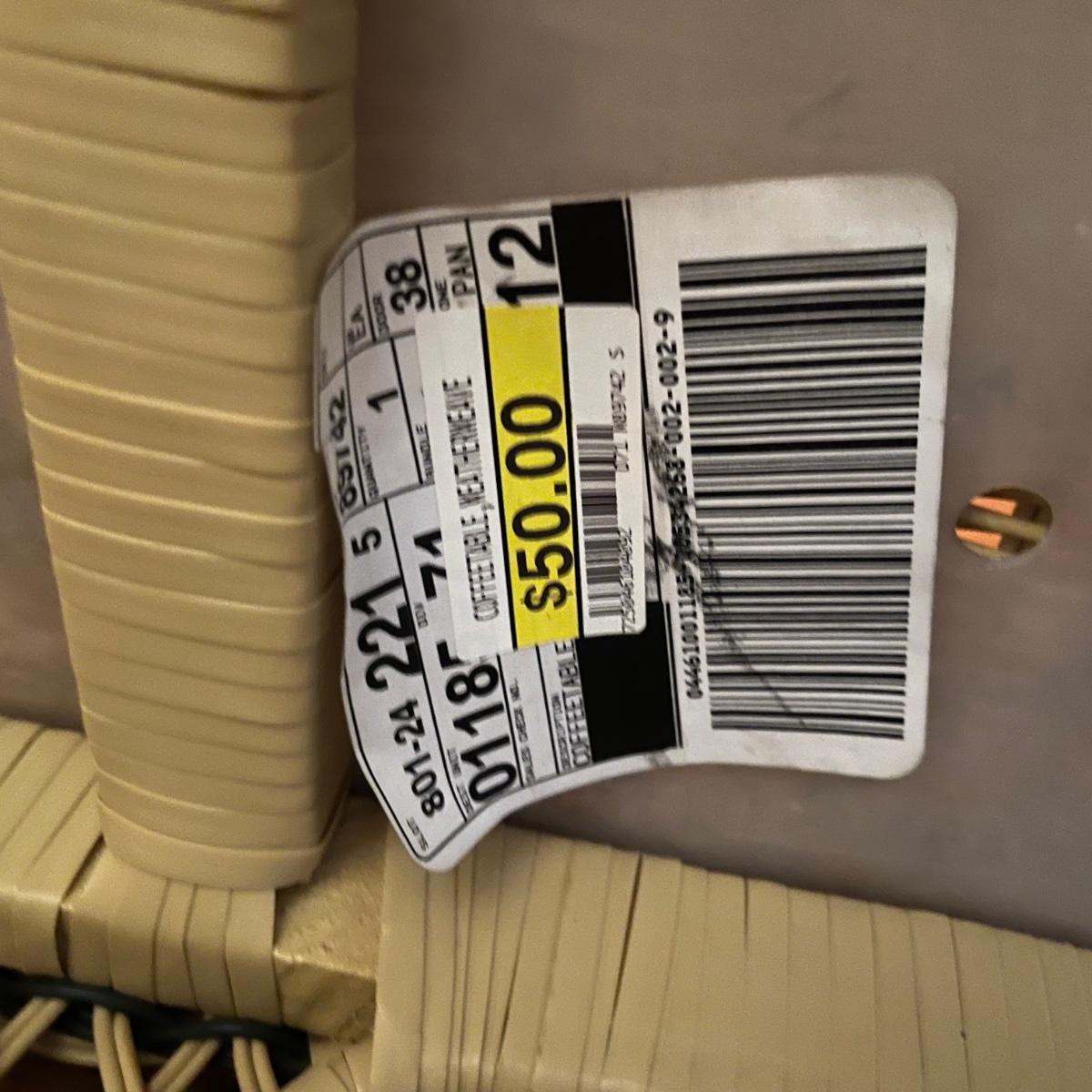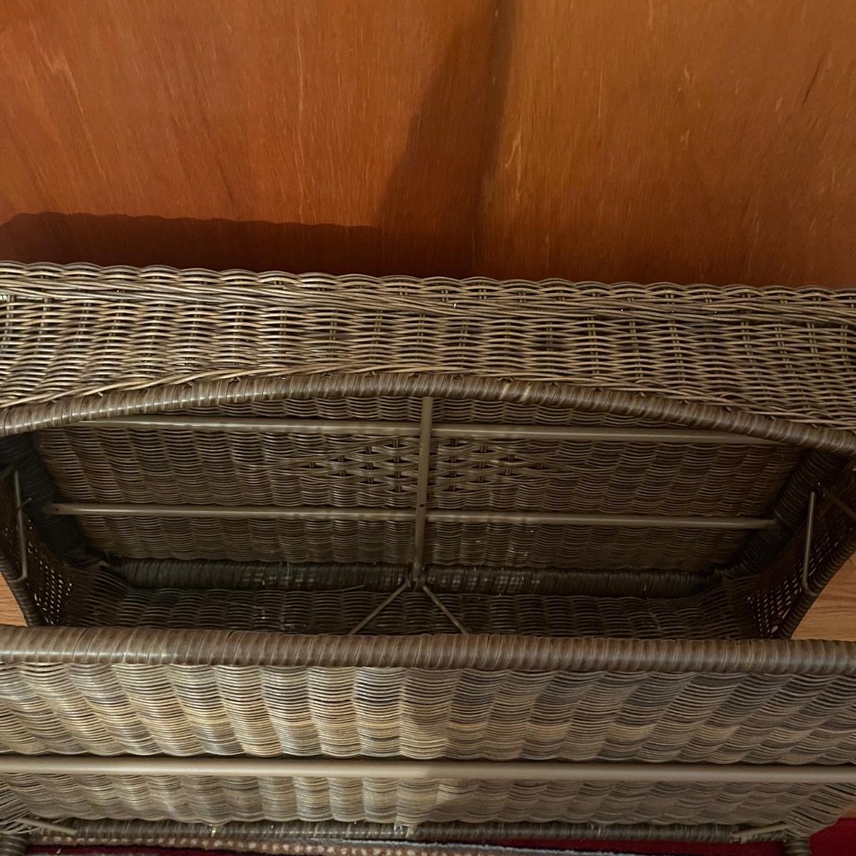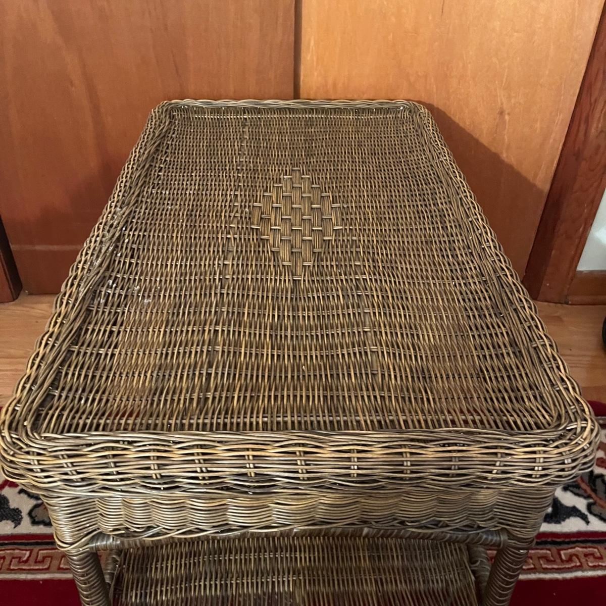 Lot includes a brown woven coffee table with shelf underneath and a cream and green colored coffee table with shelf underneath. Both table are wicker woven from a plastic that looks like rattan. Brown table measures 20” x 34” x 18.5”.
