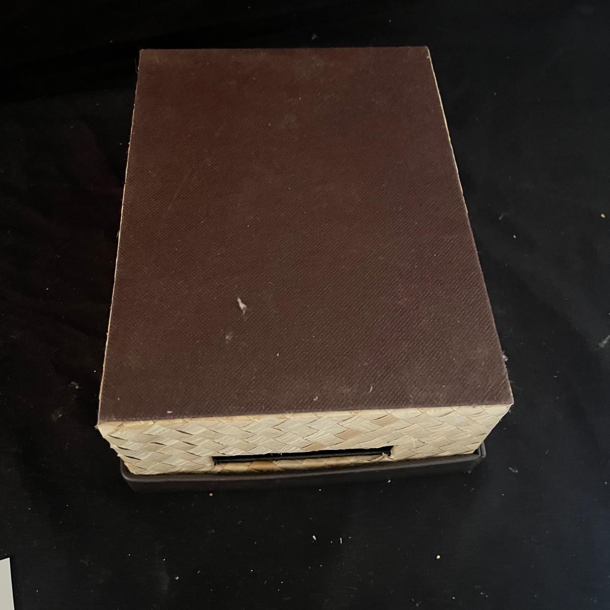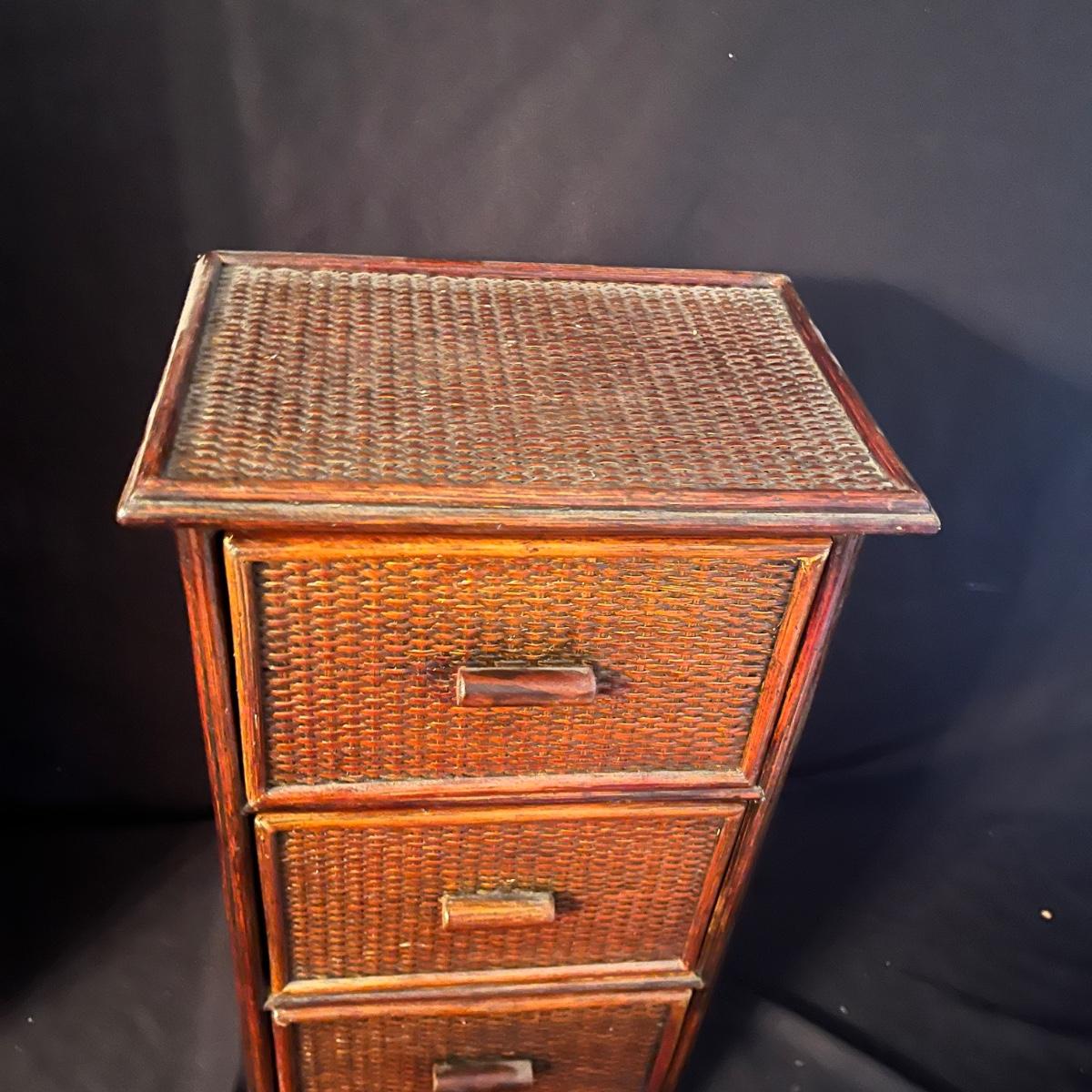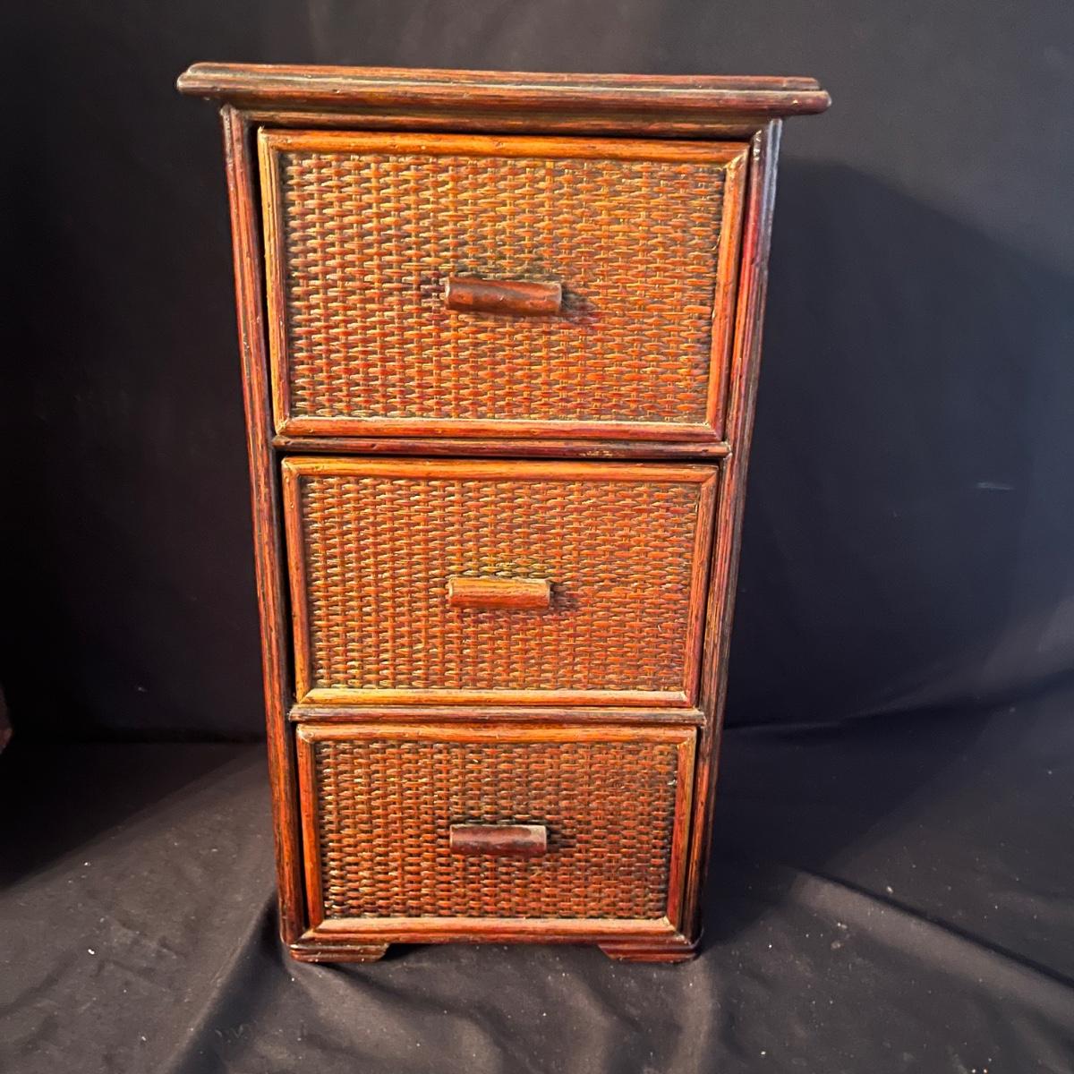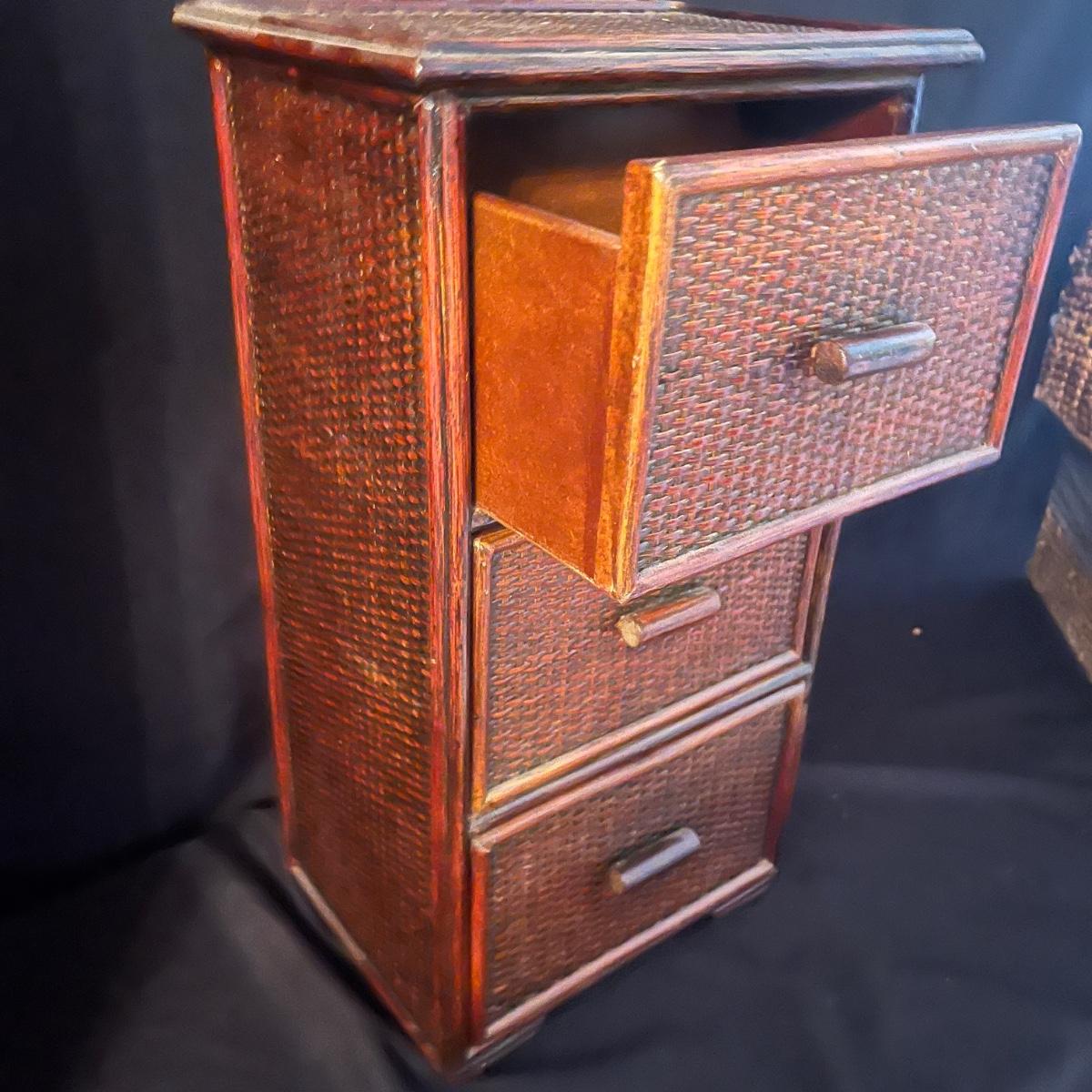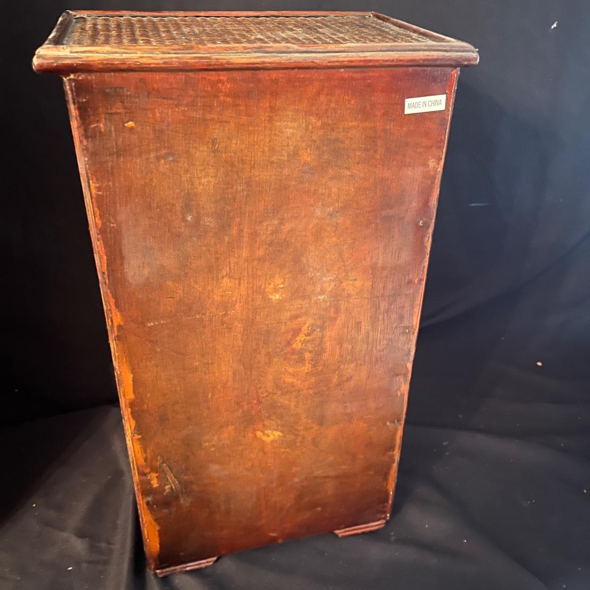Lot includes a wooden cabinet with woven fronts and top, three metal framed woven crates and two woven baskets. Cabinet measures 8” x 11” x 19”H.