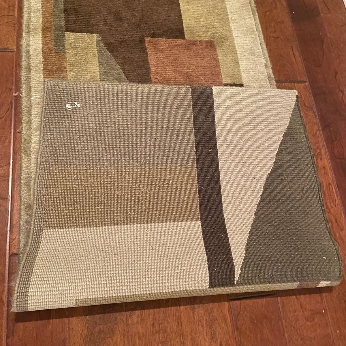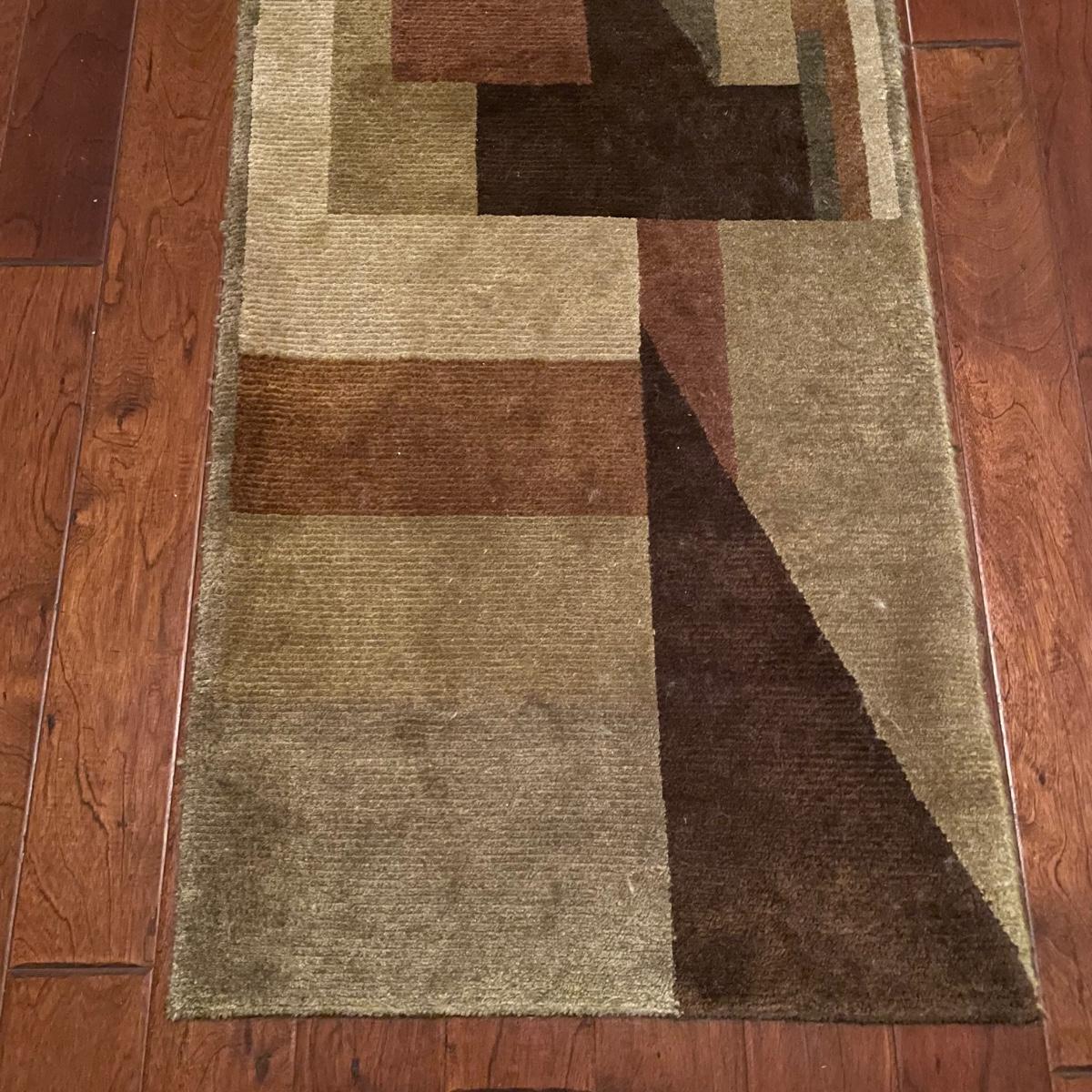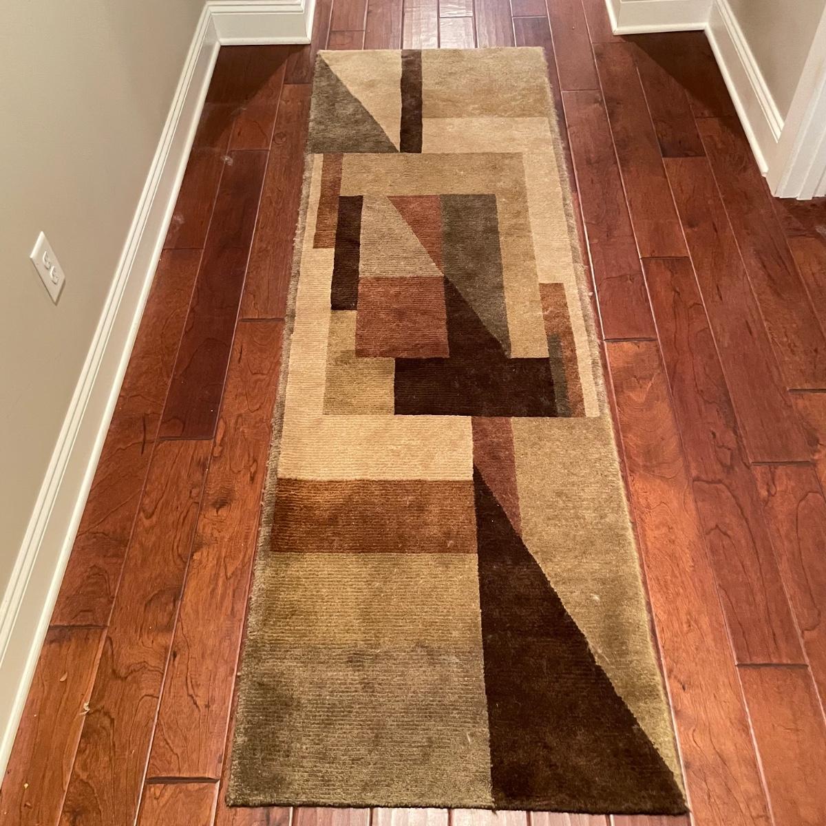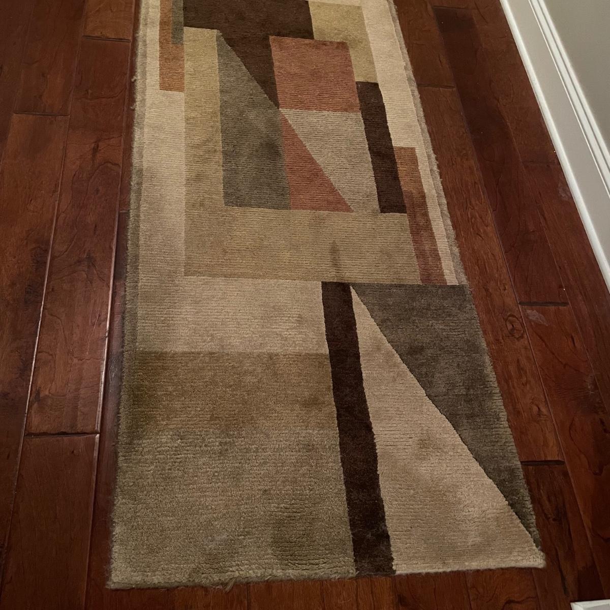 Stunning Earth-toned contemporary runner. Rug looks great with some wear shown throughout the edges and light grey pet hair throughout. Rug is woven, without any makers marking known. It measures 29.75” x 92.5” (approximately 2.5' x 7.75'). See images. Local pick up only.