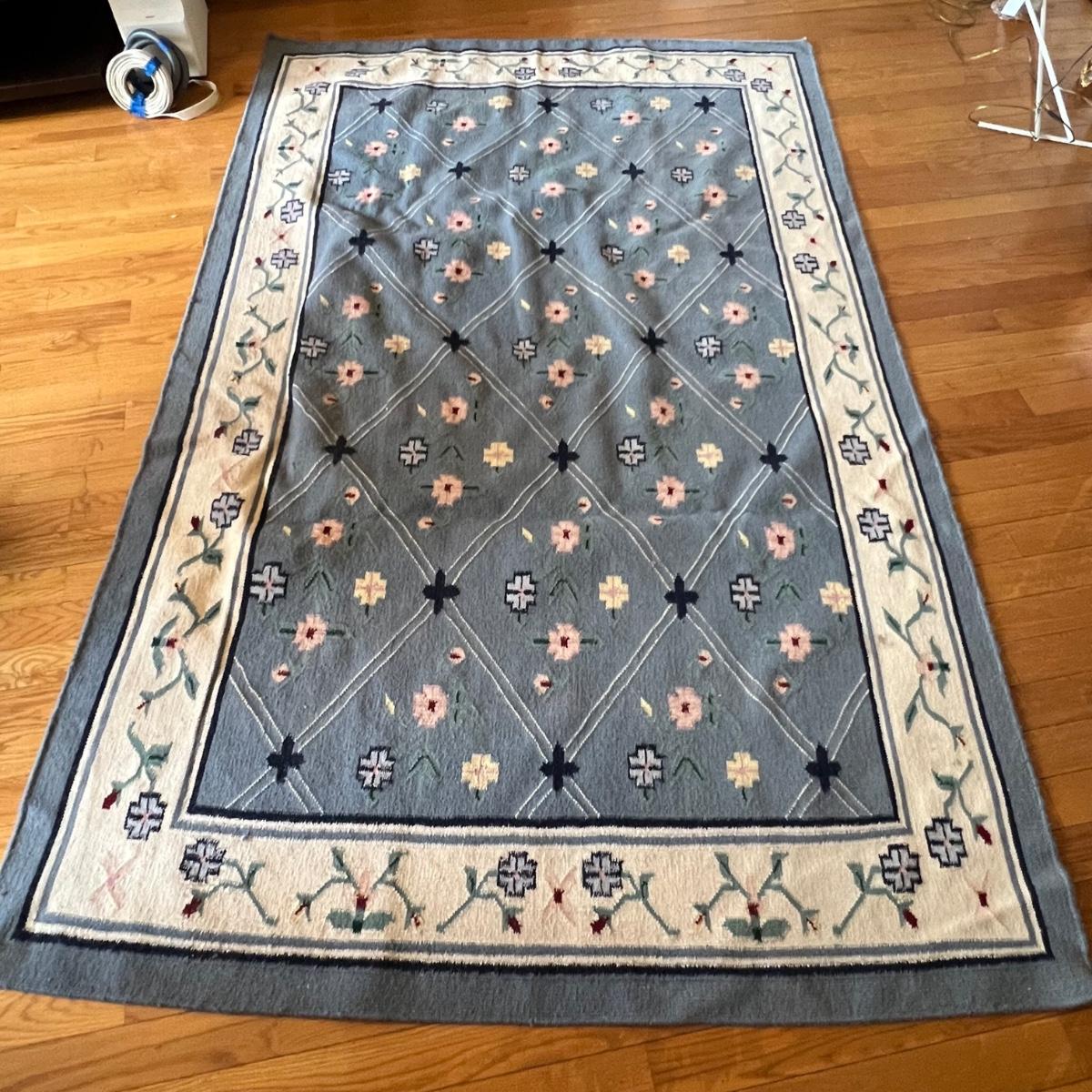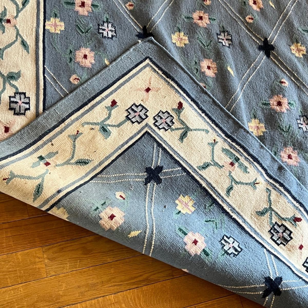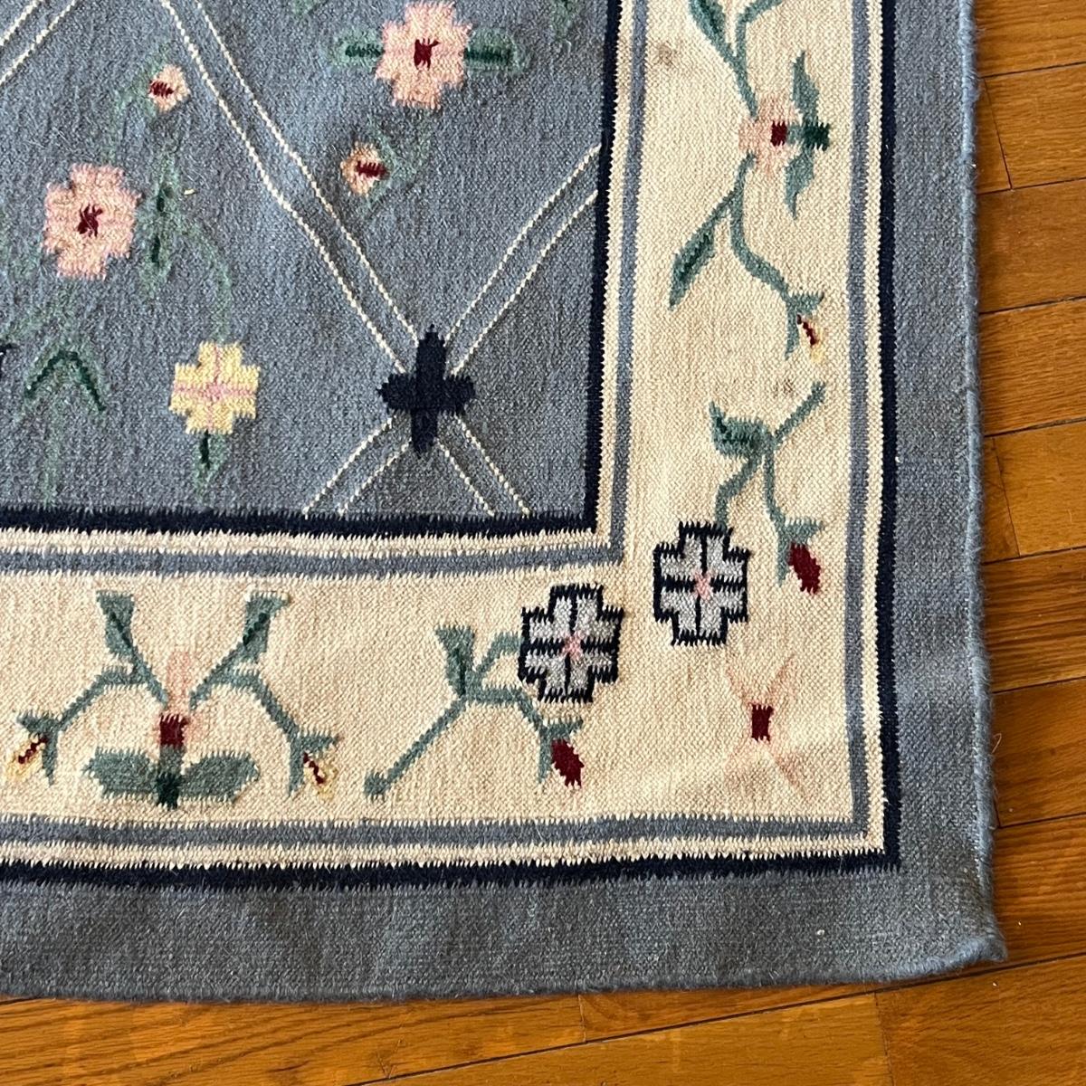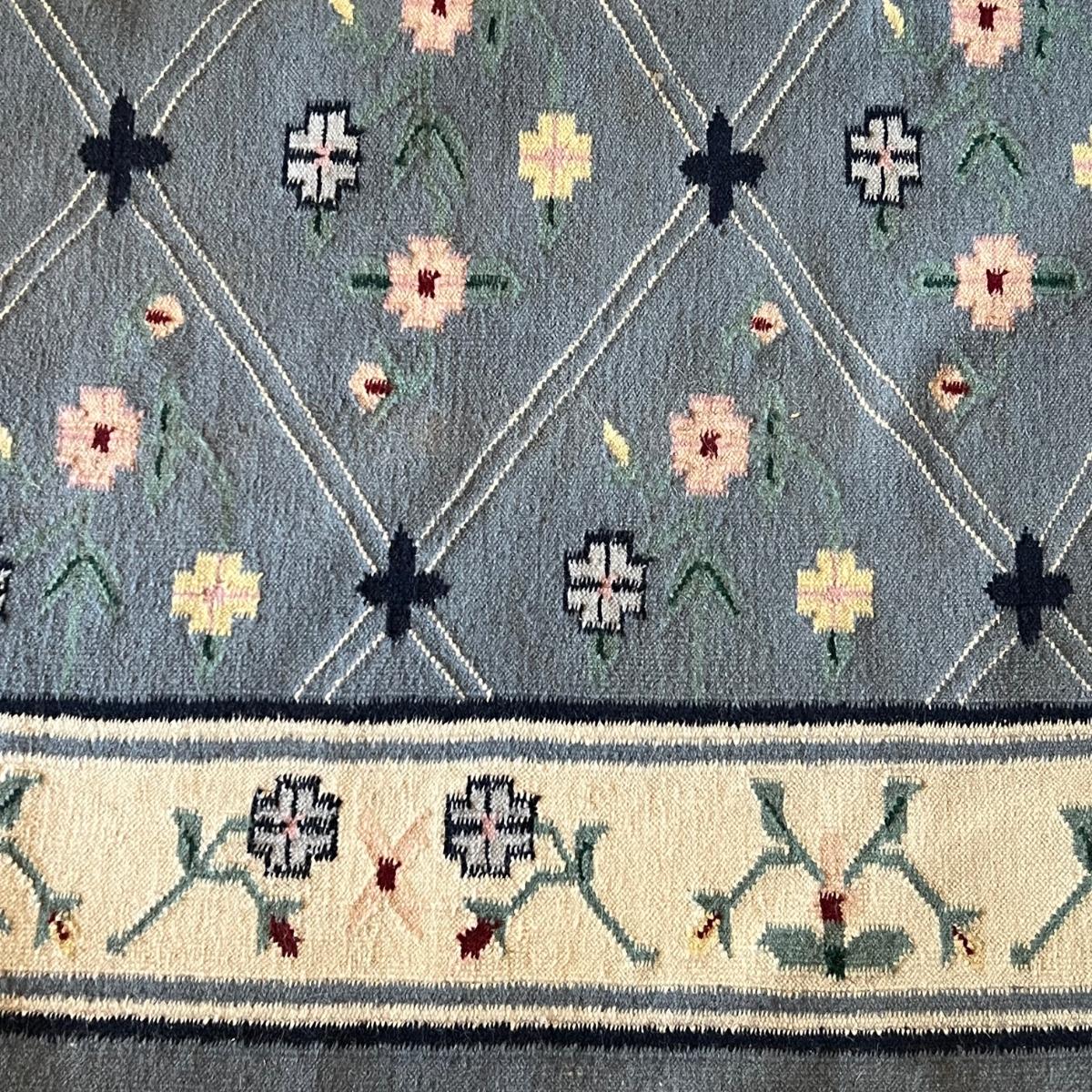 This lovely cornflower blue woven rug has a pretty floral design. Measures 5'5" x 8'5" and has no identifying brand or material labels.