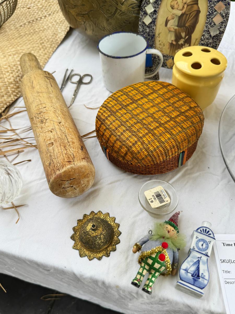 Silver plated bread basket, Wooden Pestle, "Stanley" type drinking travel mug, Asian red wine holder case.