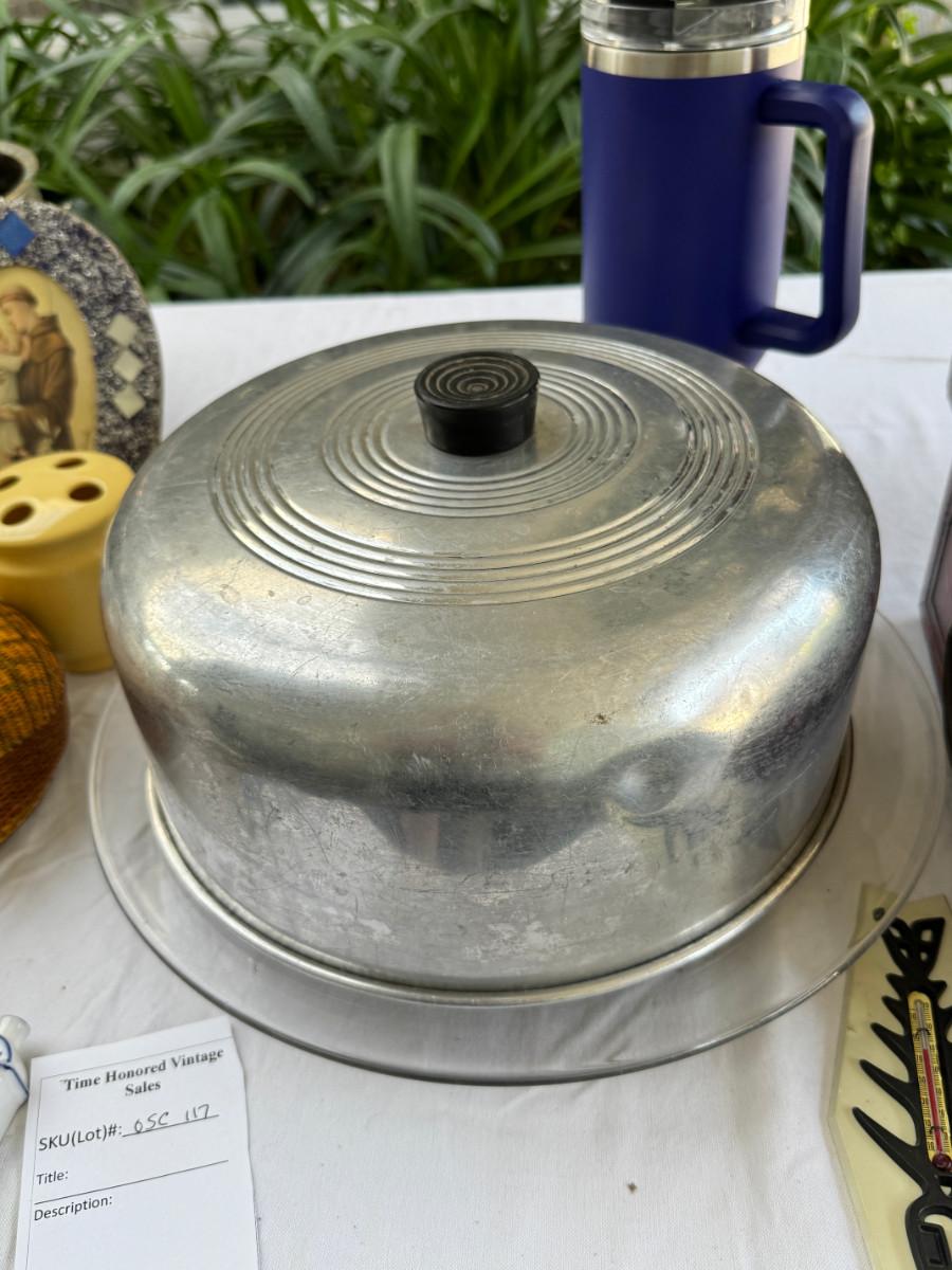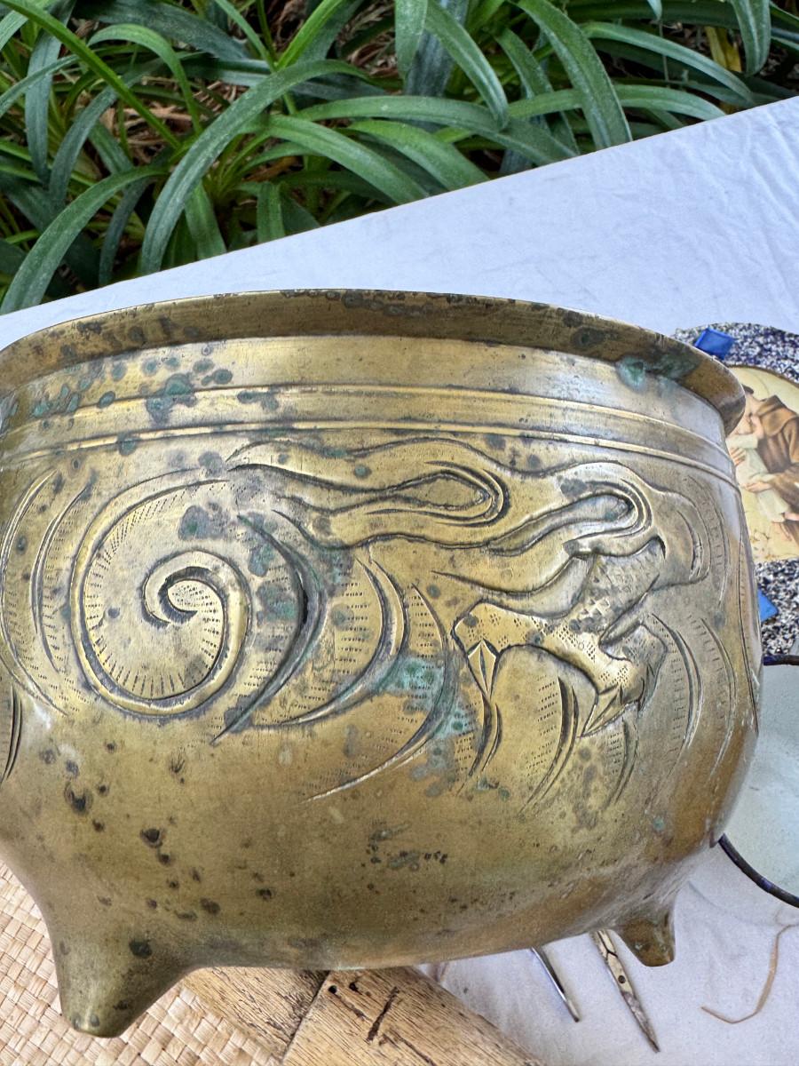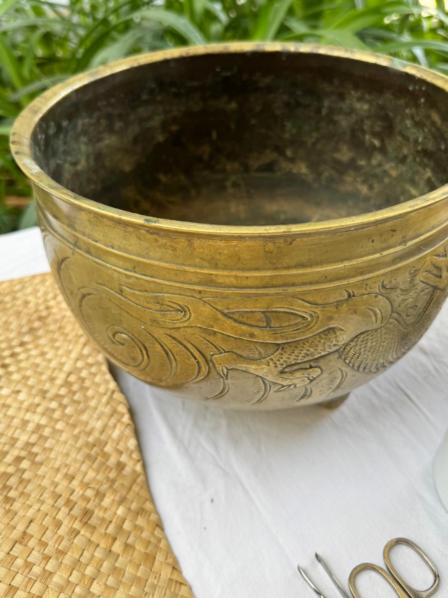 Woven matt Vintage islander, MCM cake stand with cover, Brass dragon bowl