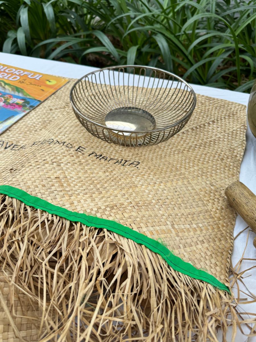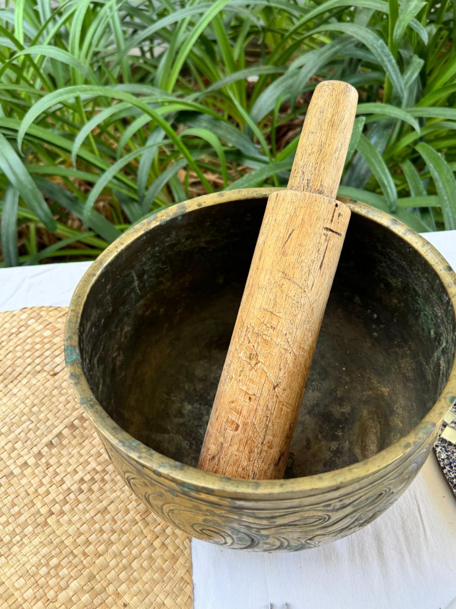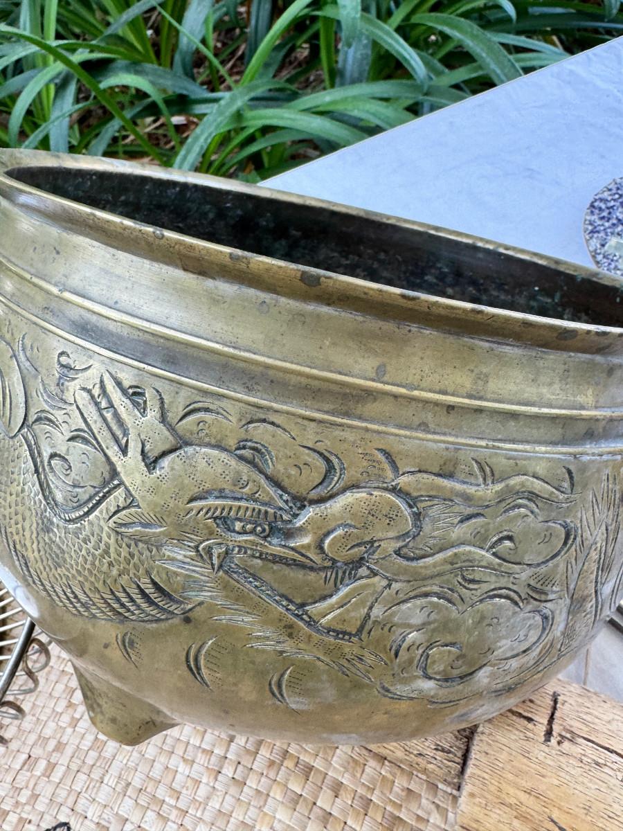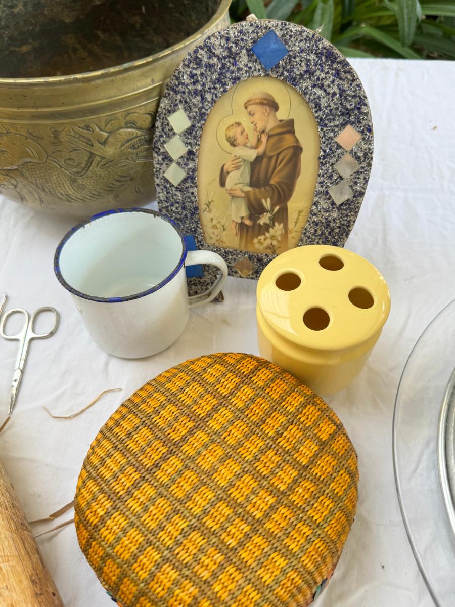 Woven matt Vintage islander, MCM cake stand with cover, Brass dragon bowl