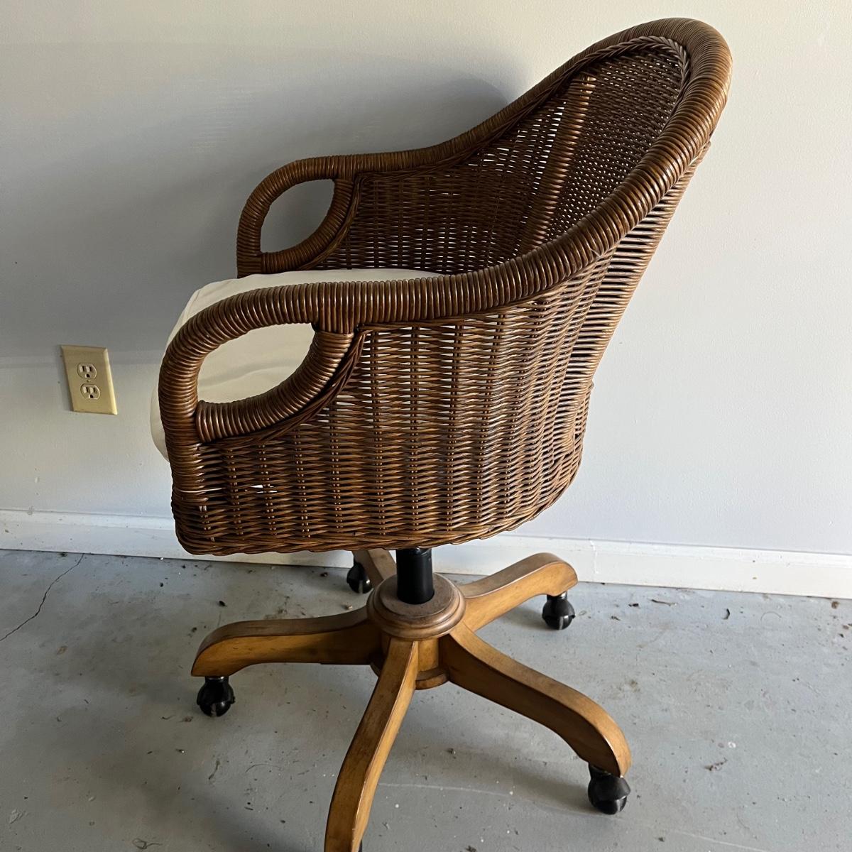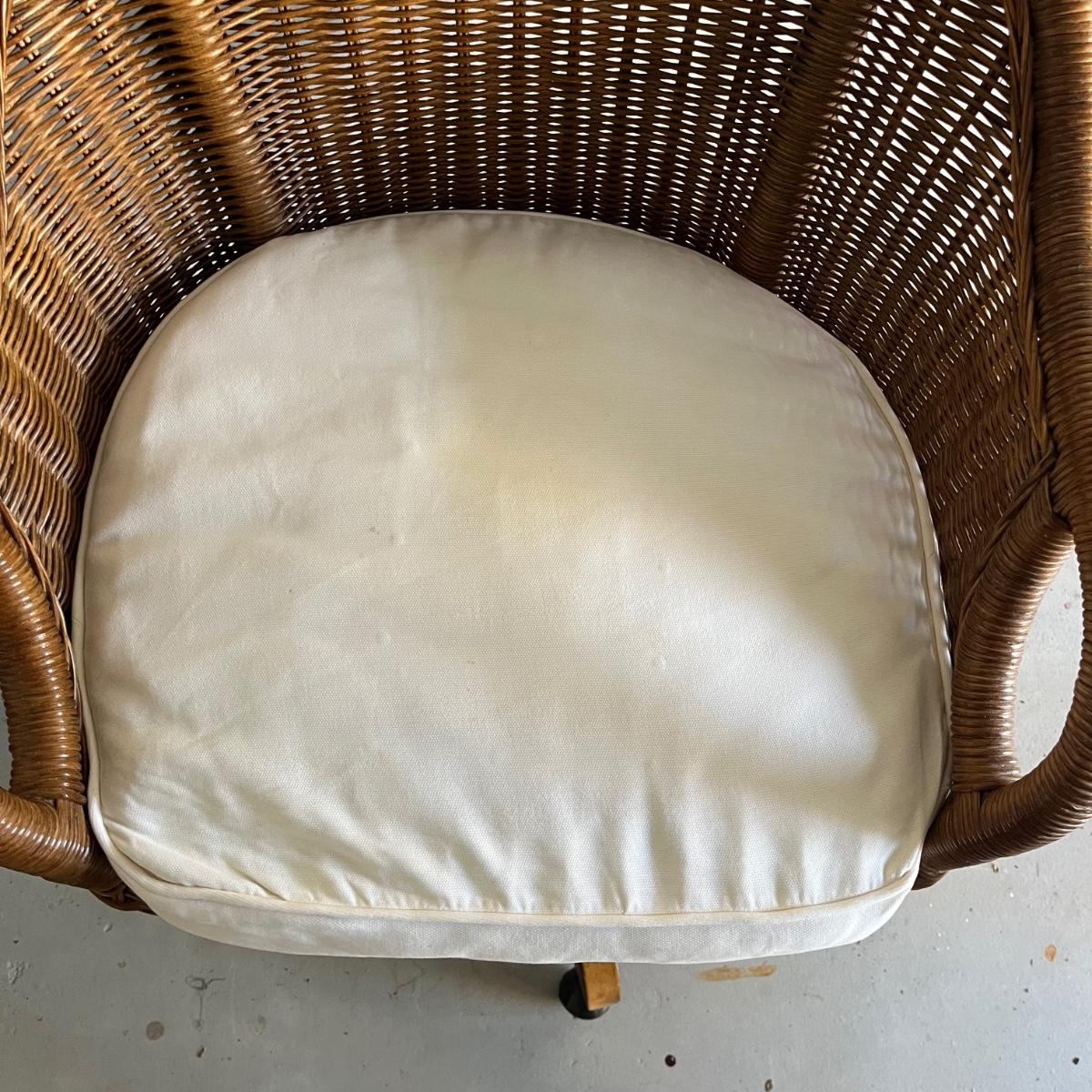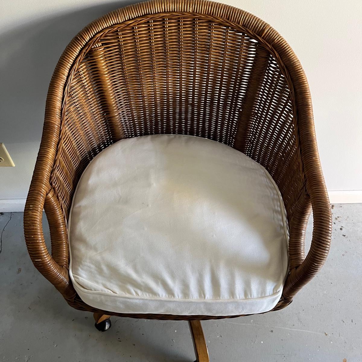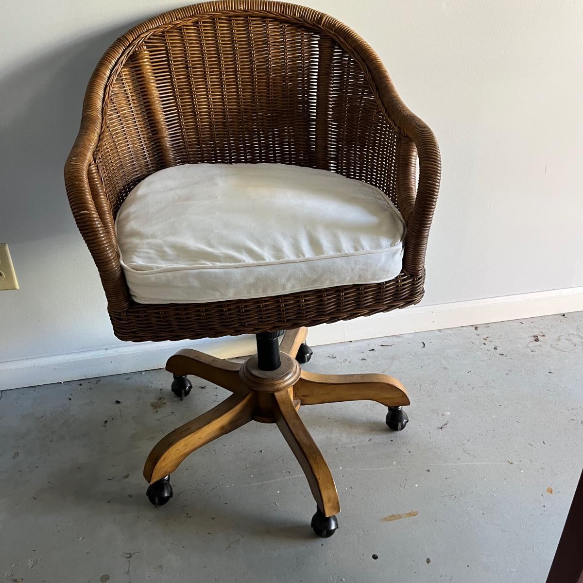 Woven office chair that appears to be wicker. Chair is in good condition and has adjustable height. Cushion has blemished on one side, but looks clean on other side. Chair measures 24” x 26” x 35”.