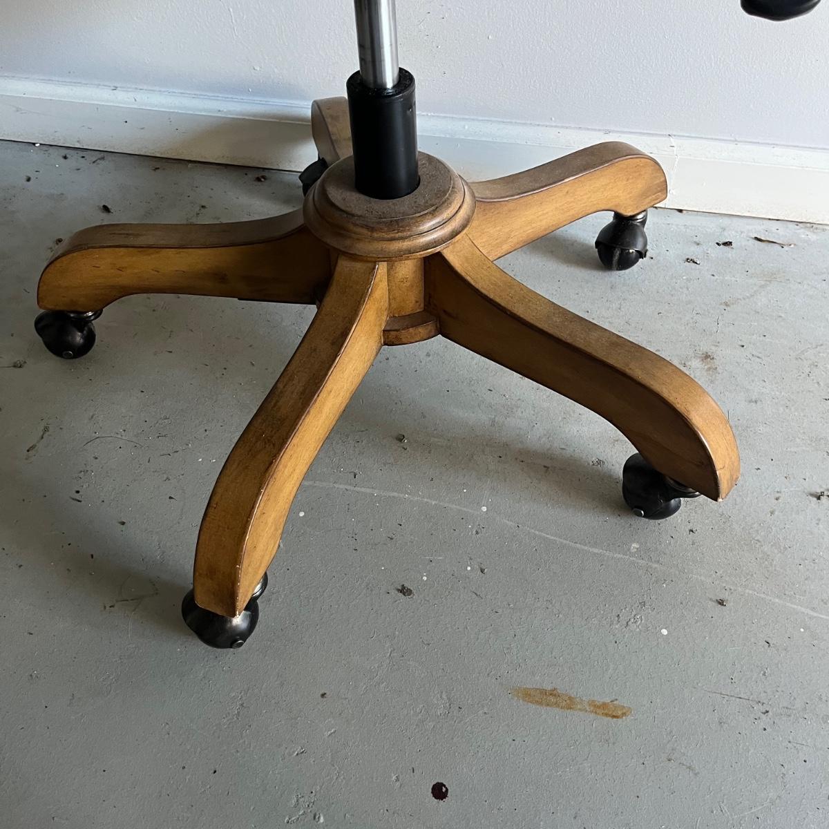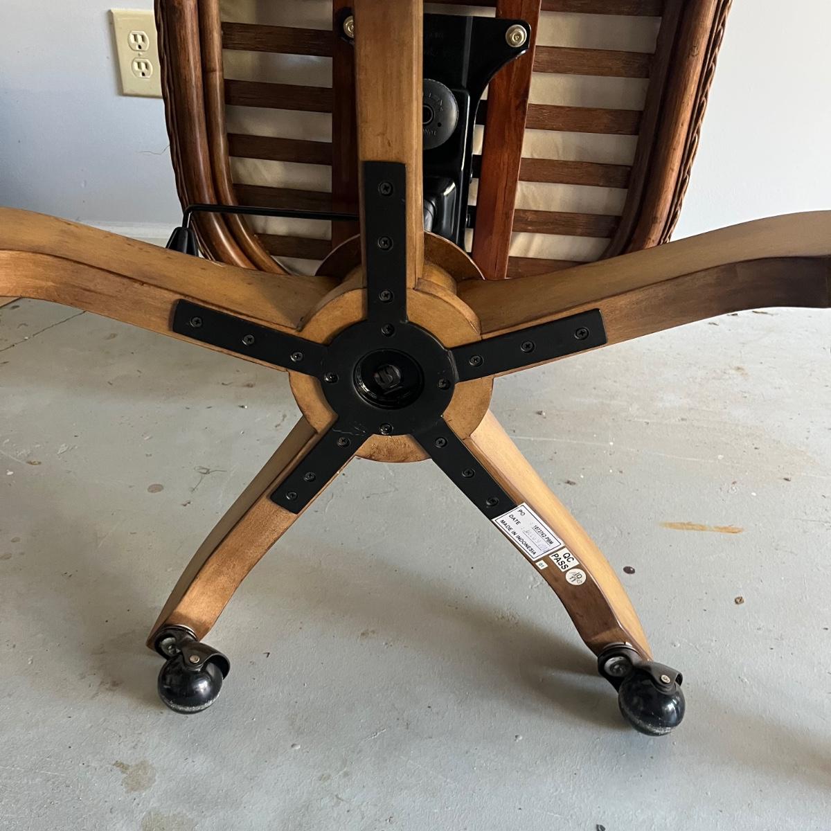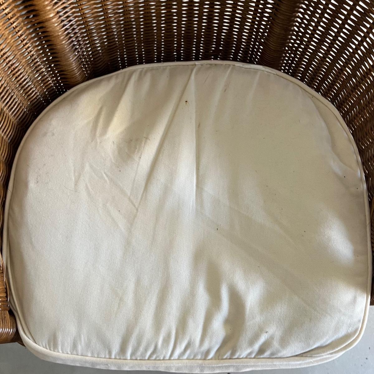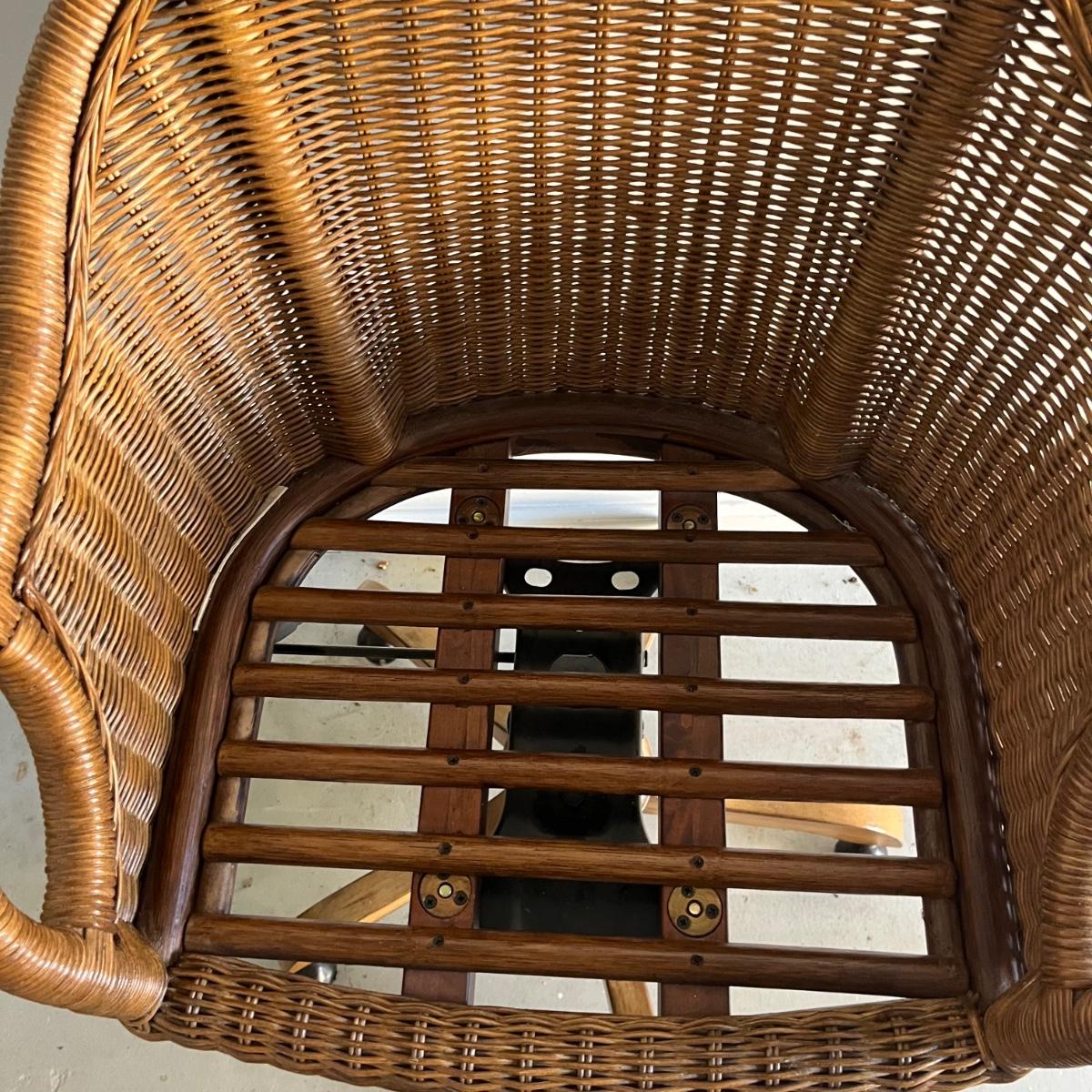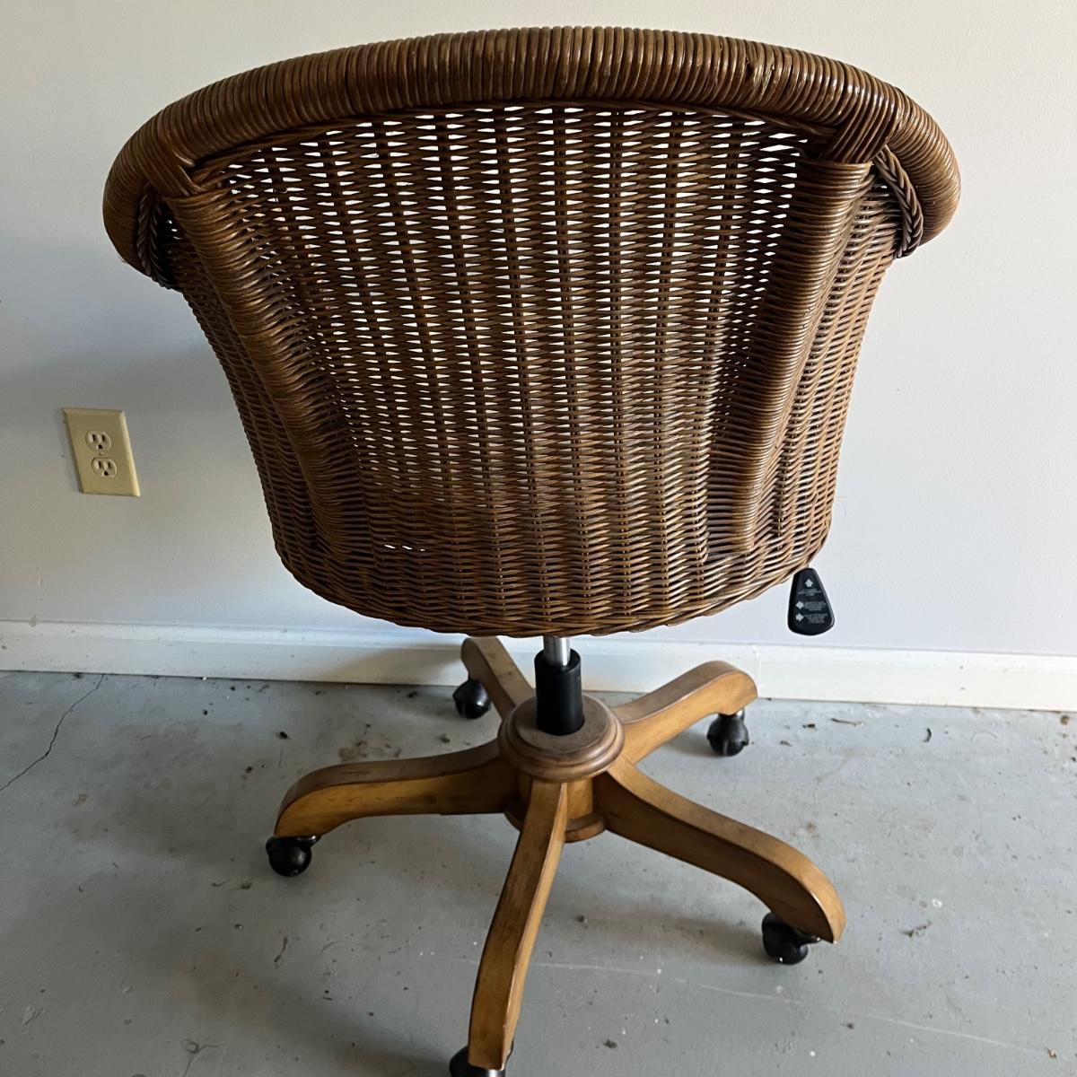 Woven office chair that appears to be wicker. Chair is in good condition and has adjustable height. Cushion has blemished on one side, but looks clean on other side. Chair measures 24” x 26” x 35”.