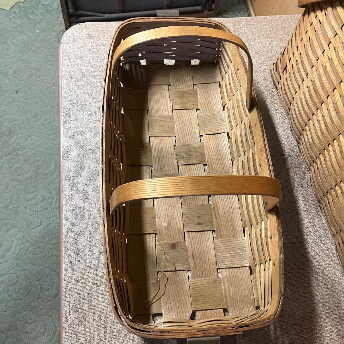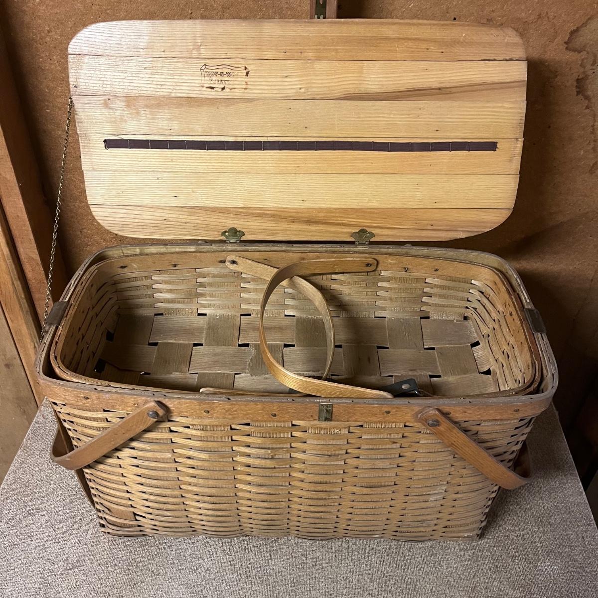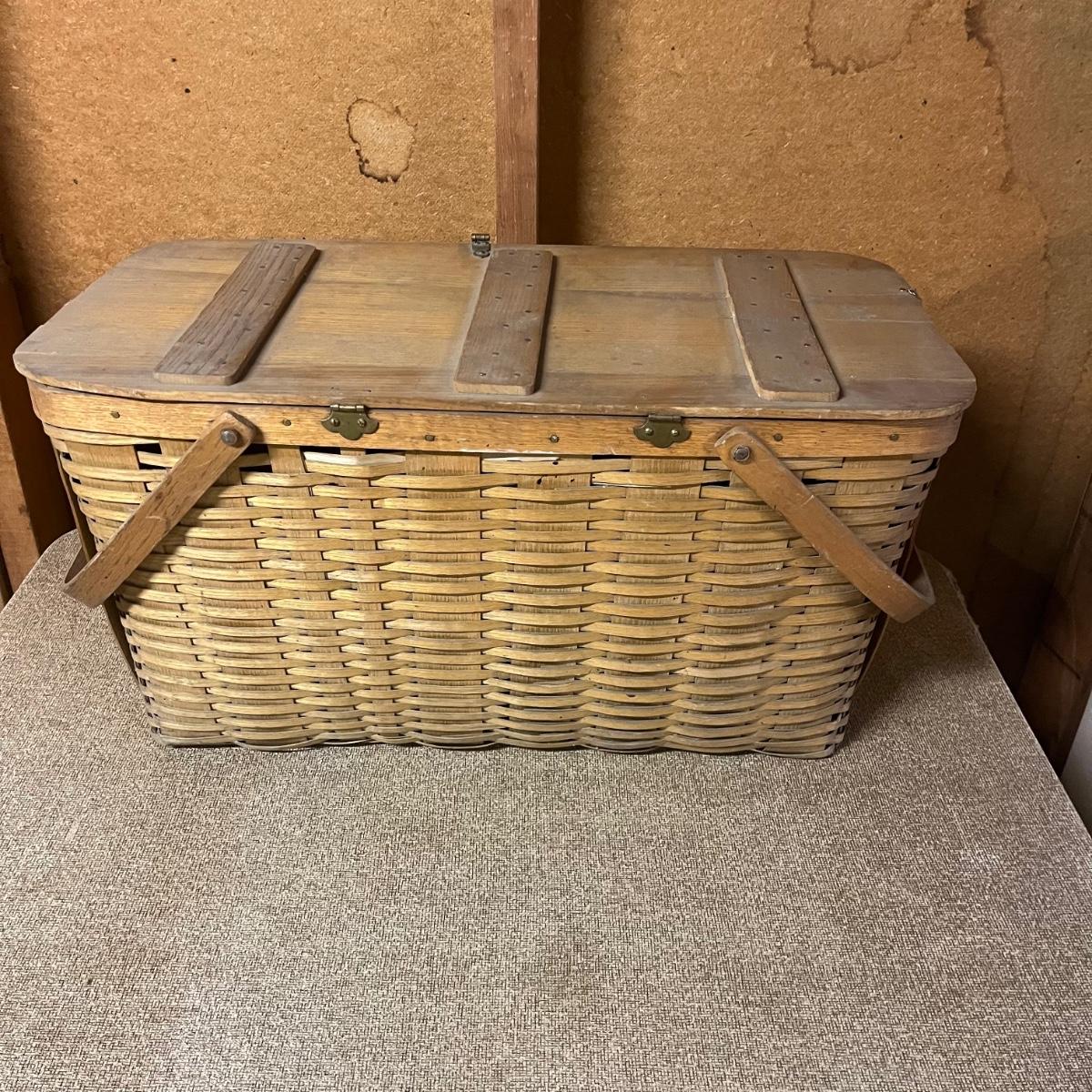 Lot includes a woven picnic basket with removable tray. Basket measures 12” x 24” x 12”.