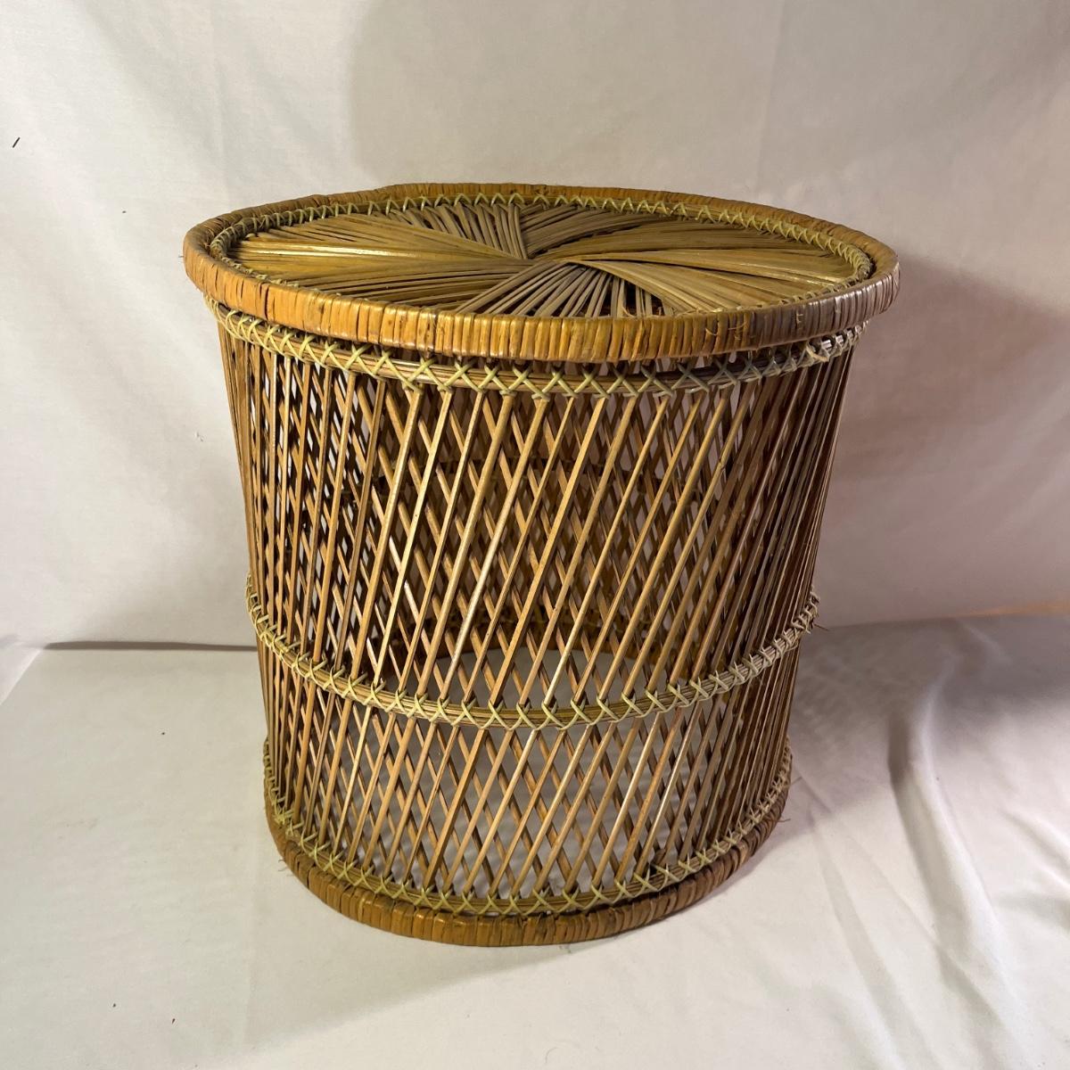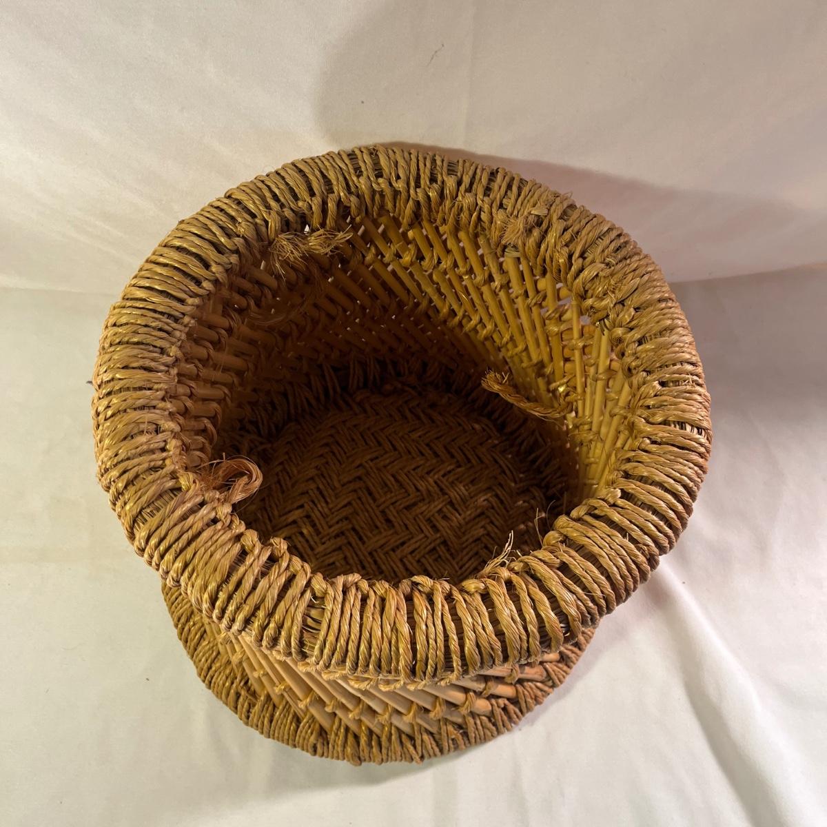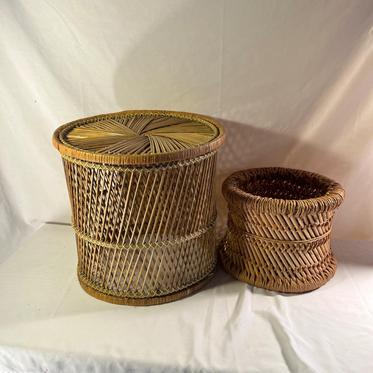 Lot includes a woven plant stand that measures 17”D x 16”H and a woven planter that measures 13”D x 9.5”H.