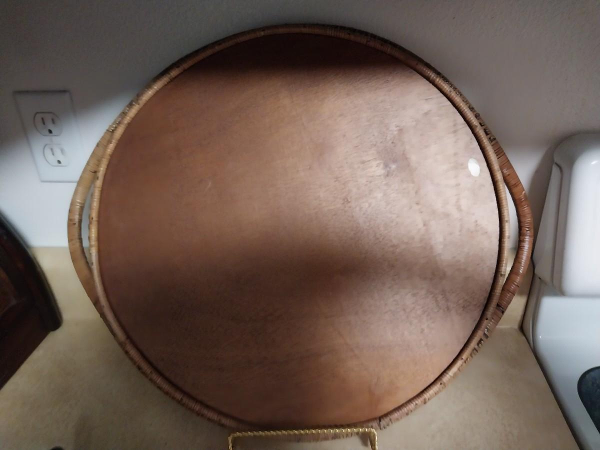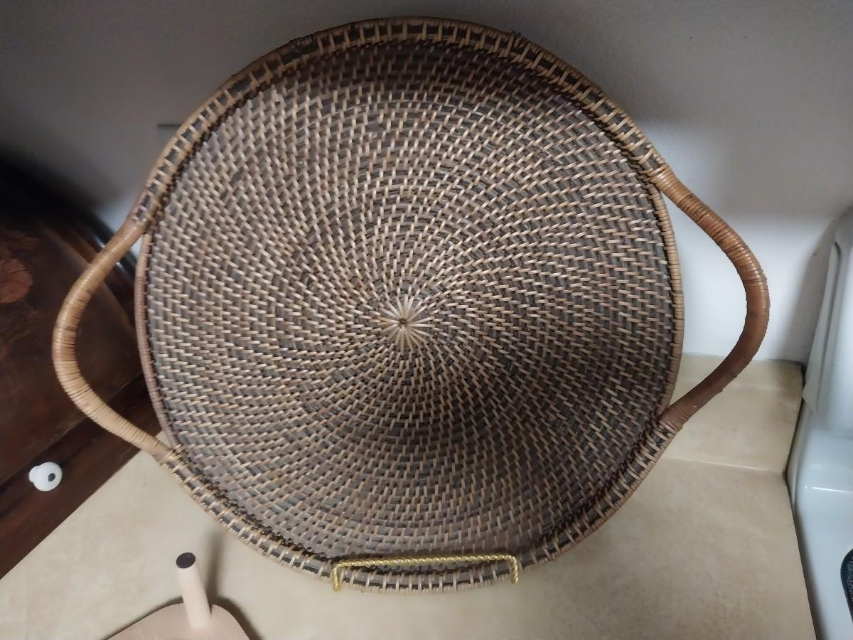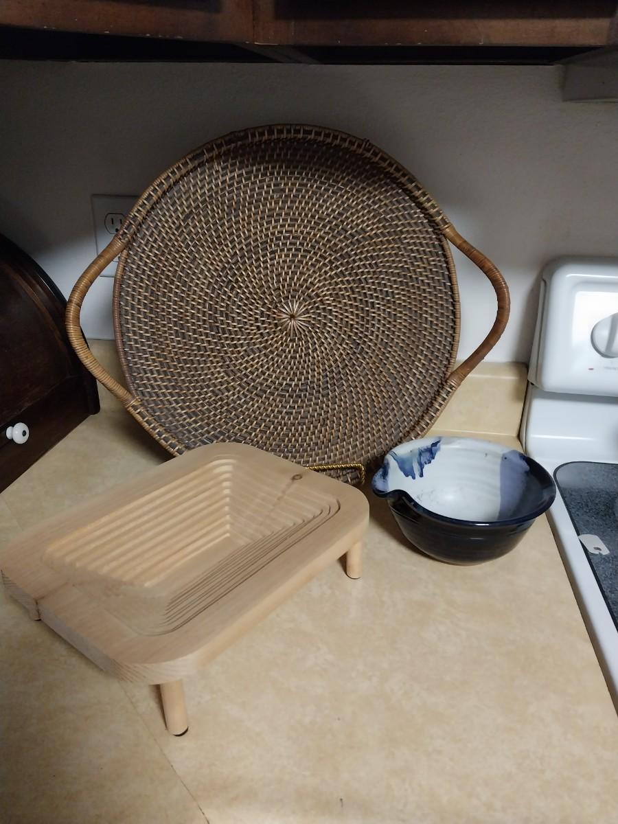 WOVEN PLATTER, WOODEN BOWL AND CLAY BATTER BOWL