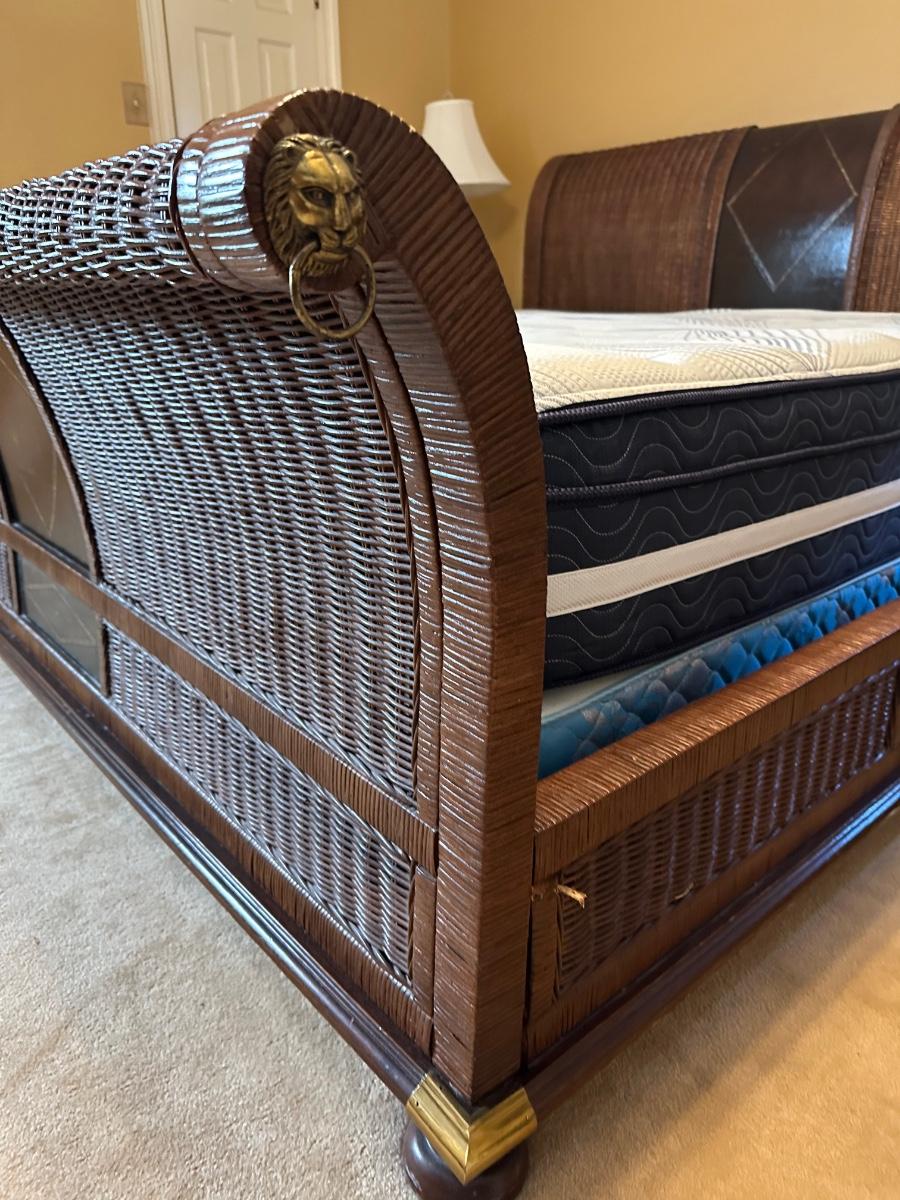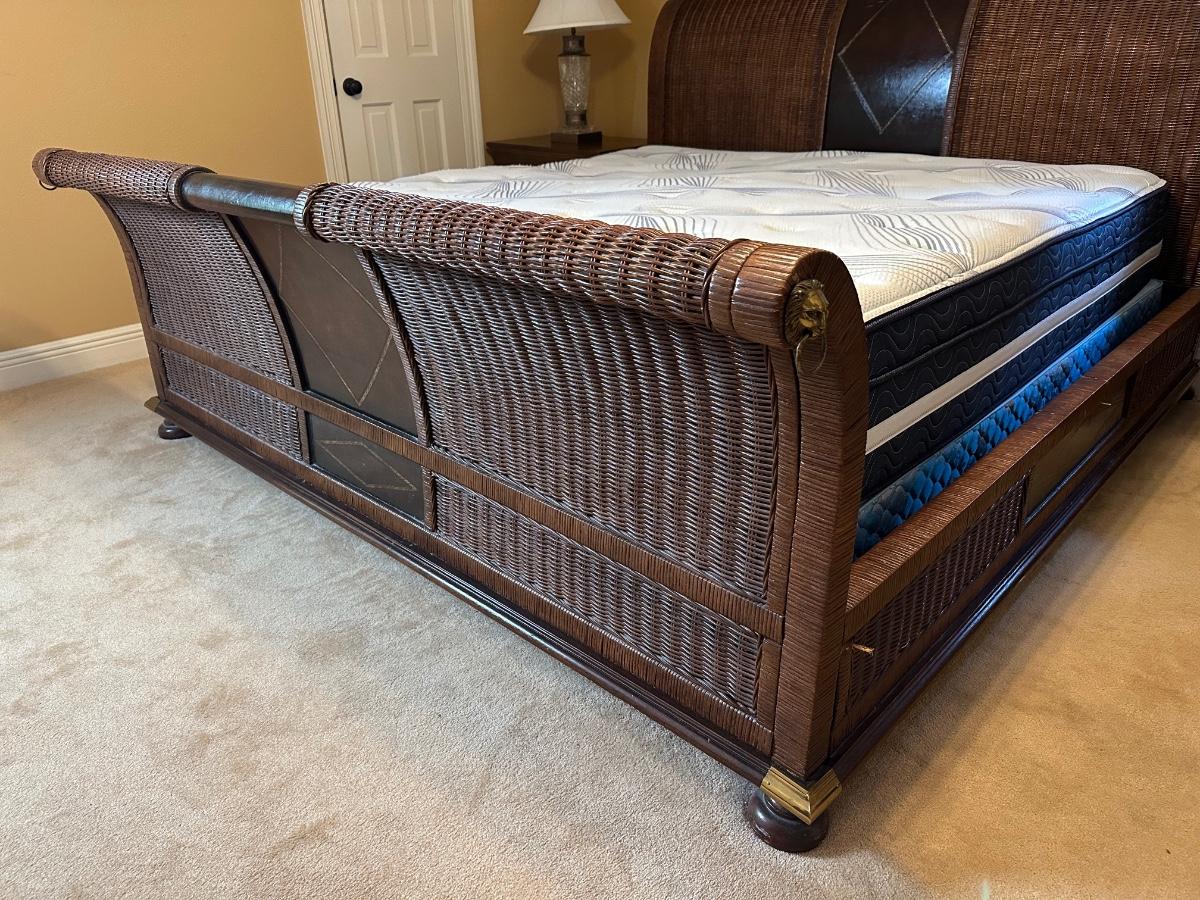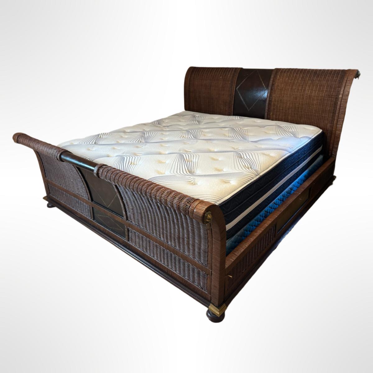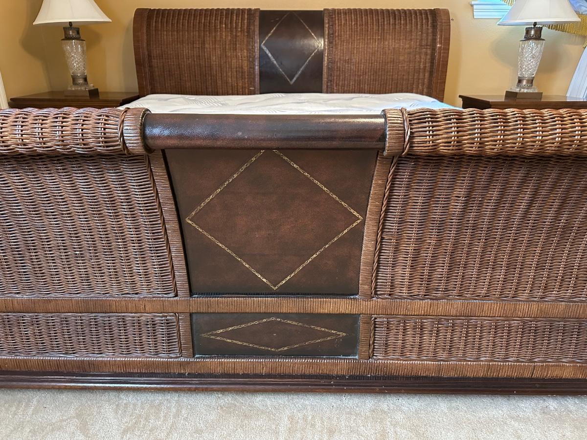 Woven Rattan and Leather King Sleigh Bed with Brass Accents