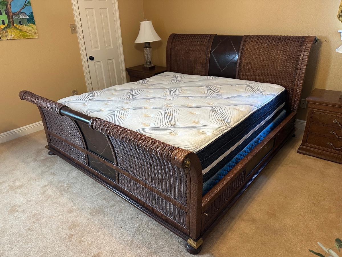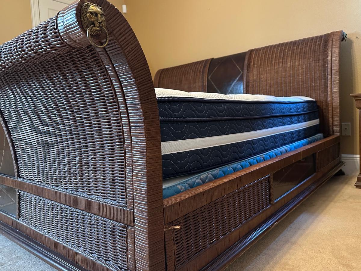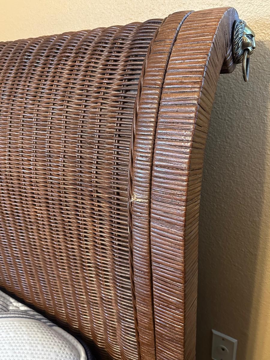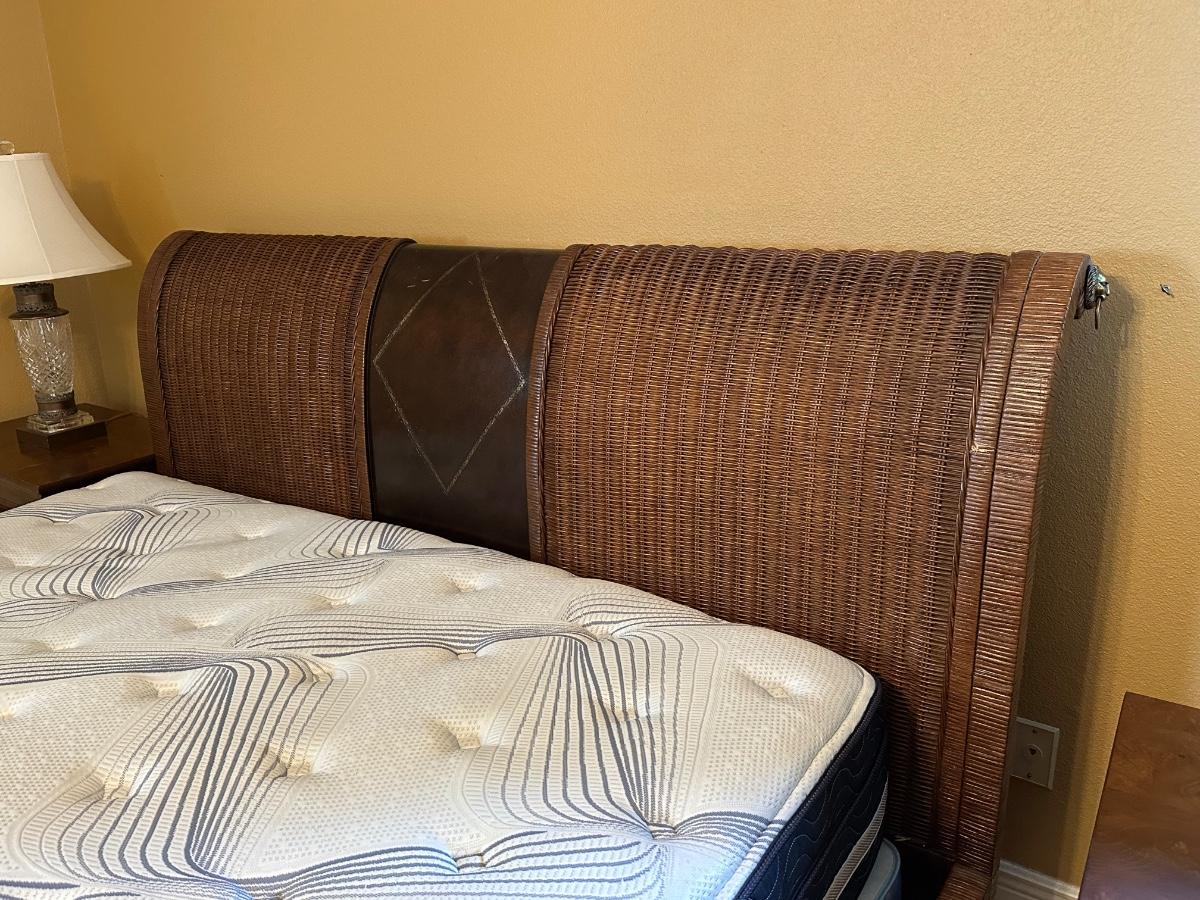 Woven Rattan and Leather King Sleigh Bed with Brass Accents