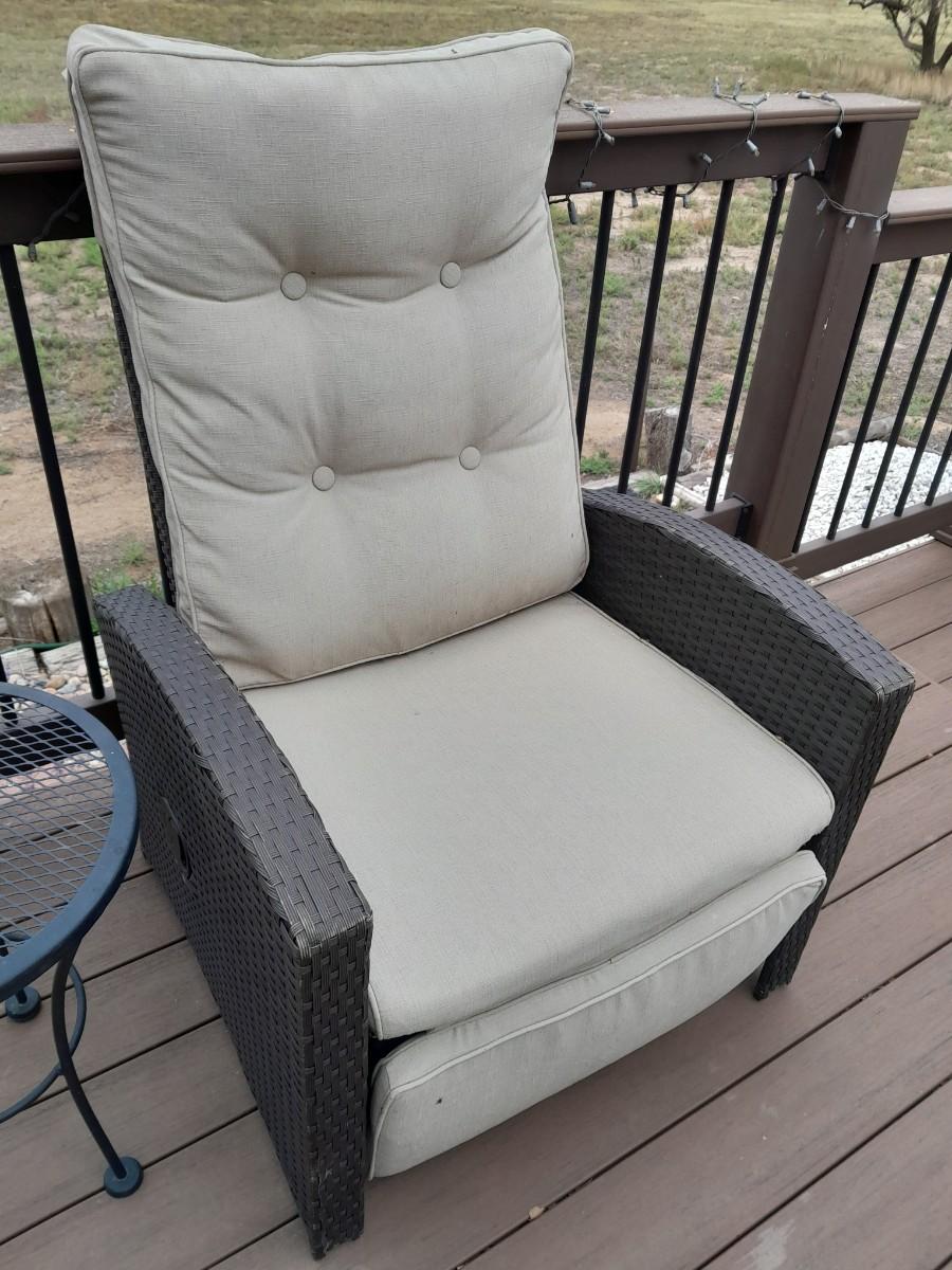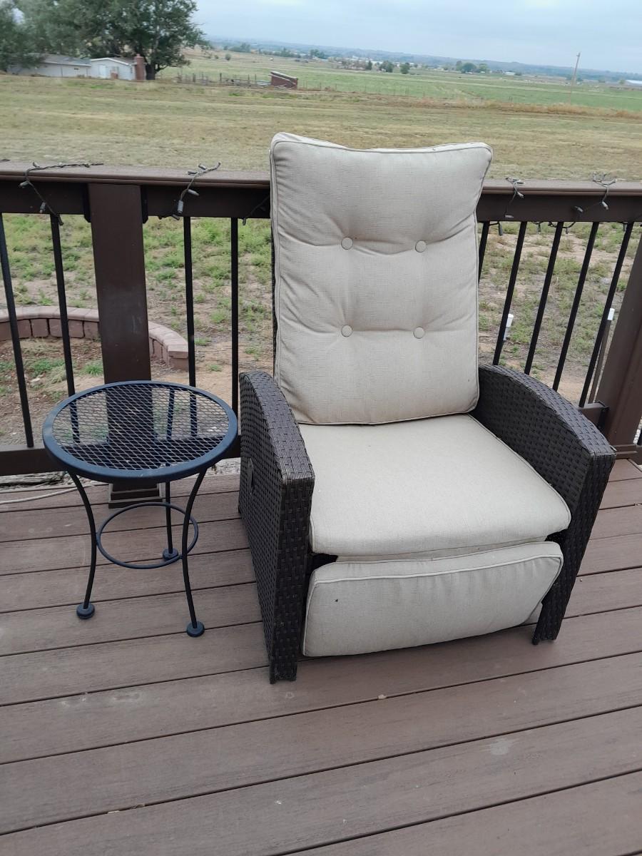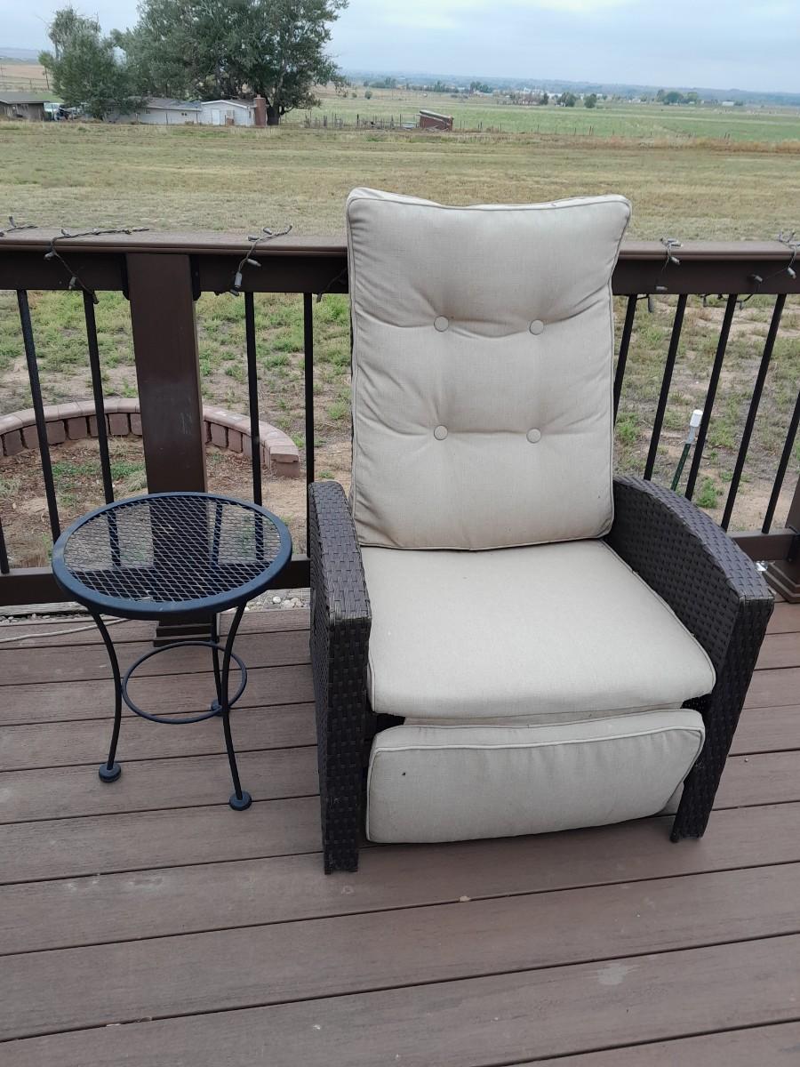WOVEN RECLINING PATIO CHAIR WITH CUSHION APPROX. 41" X 29" X 27" AND METAL MESH END TABLE 21" X 16"