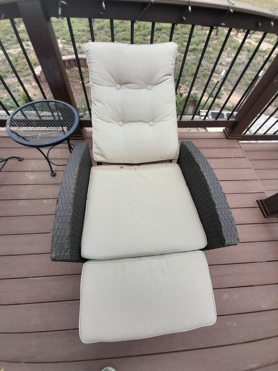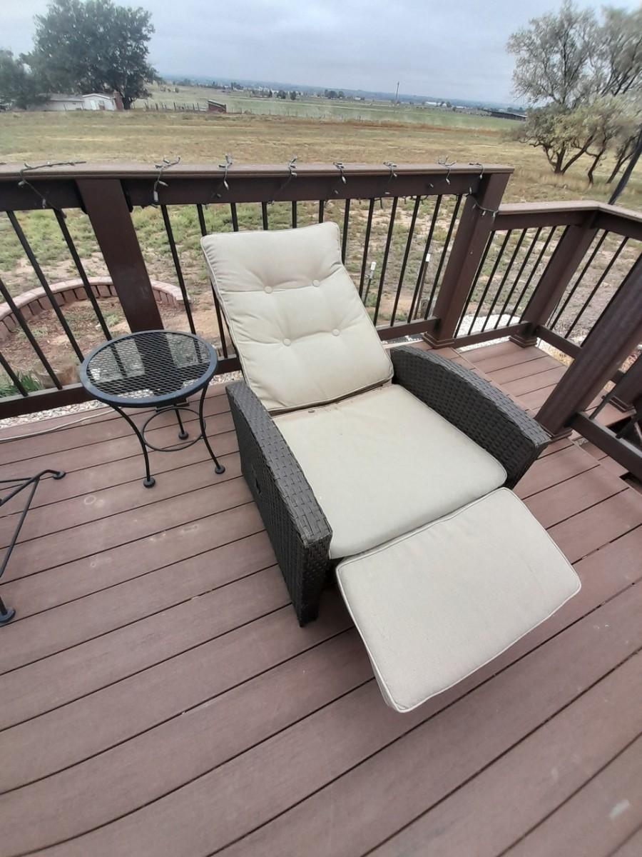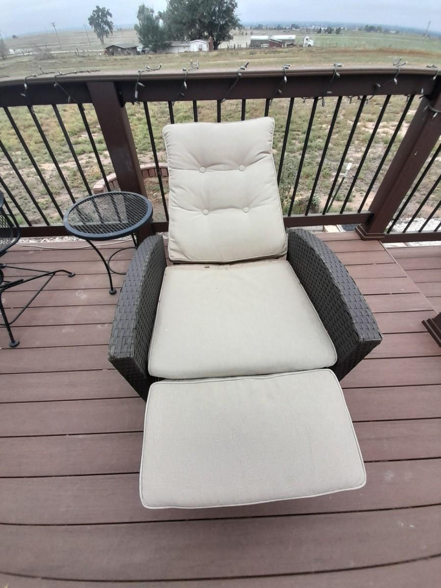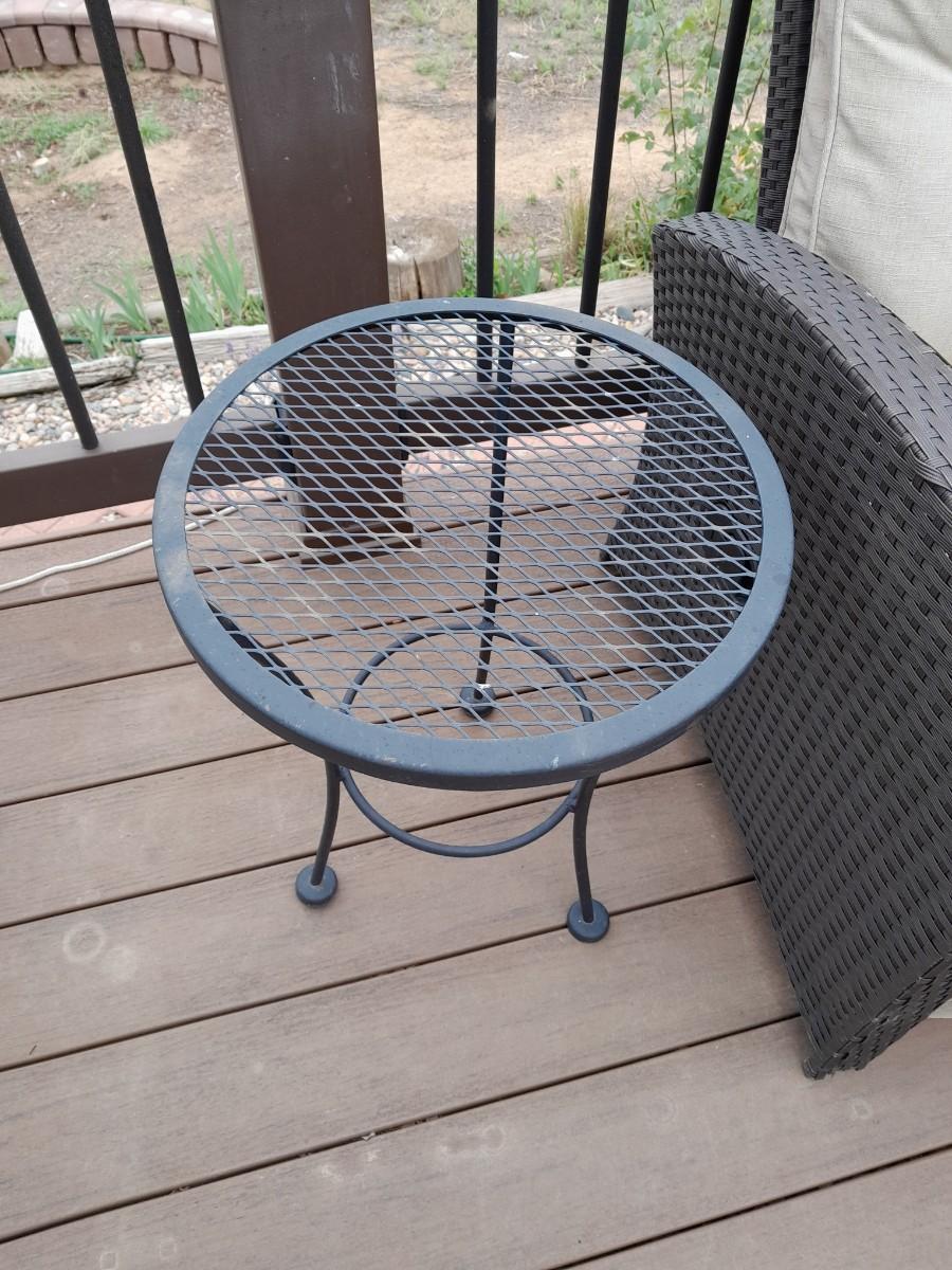 WOVEN RECLINING PATIO CHAIR WITH CUSHION APPROX. 41" X 29" X 27" AND METAL MESH END TABLE 21" X 16"