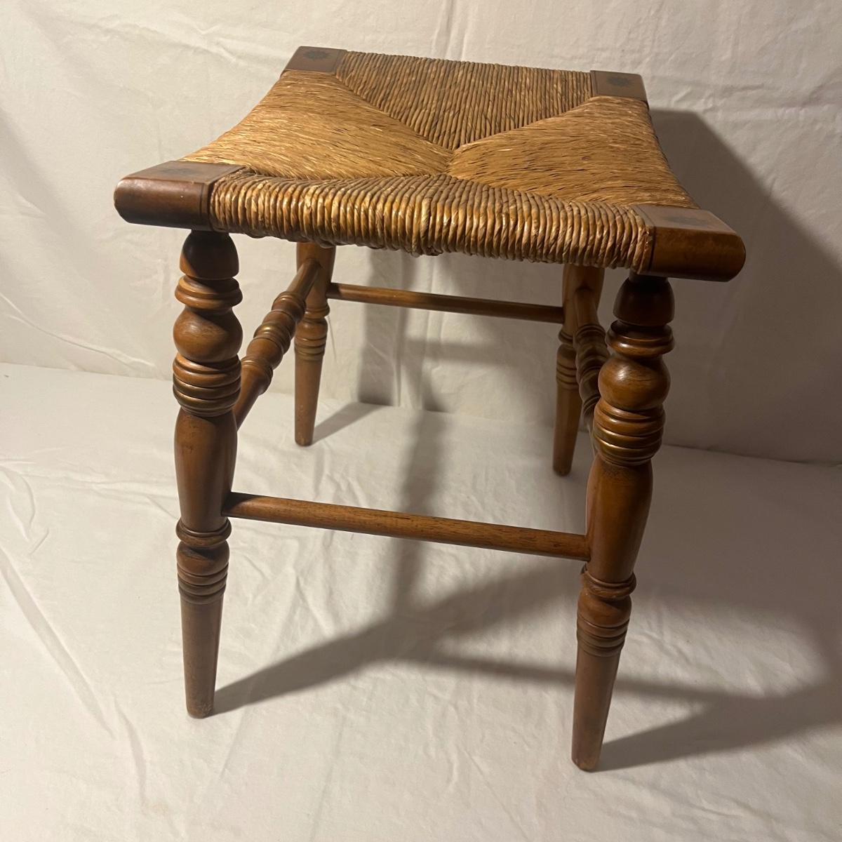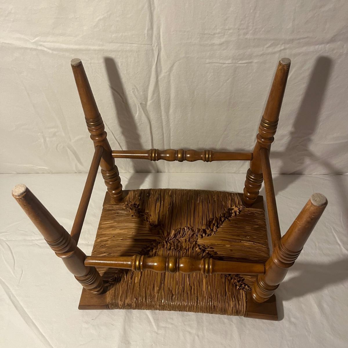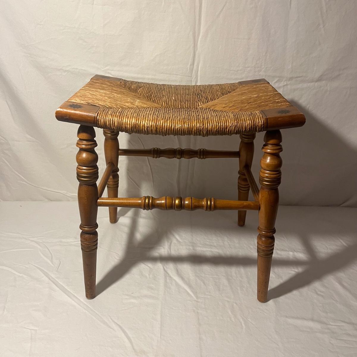Small woven rush rope bench or footstool with spindle legs. The piece has a few nicks and scratches, see pictures. It measures 13” x 18” x 18”H. Local Pickup Only