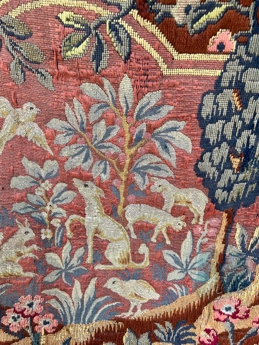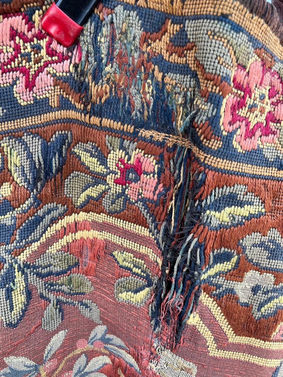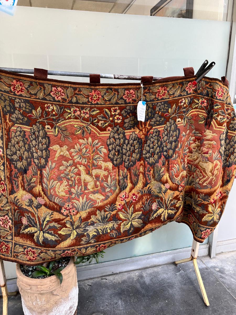 46 X 66 Very old woven tapestry hunting scene from 1500s colors still good, backed with velvet, One area of damage .