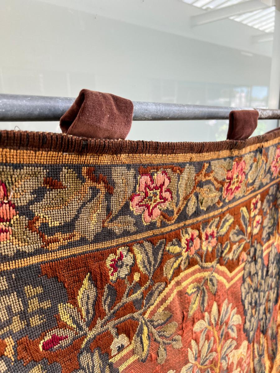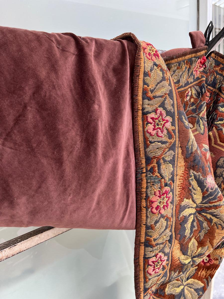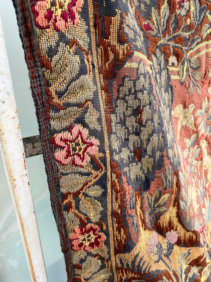 46 X 66 Very old woven tapestry hunting scene from 1500s colors still good, backed with velvet, One area of damage .