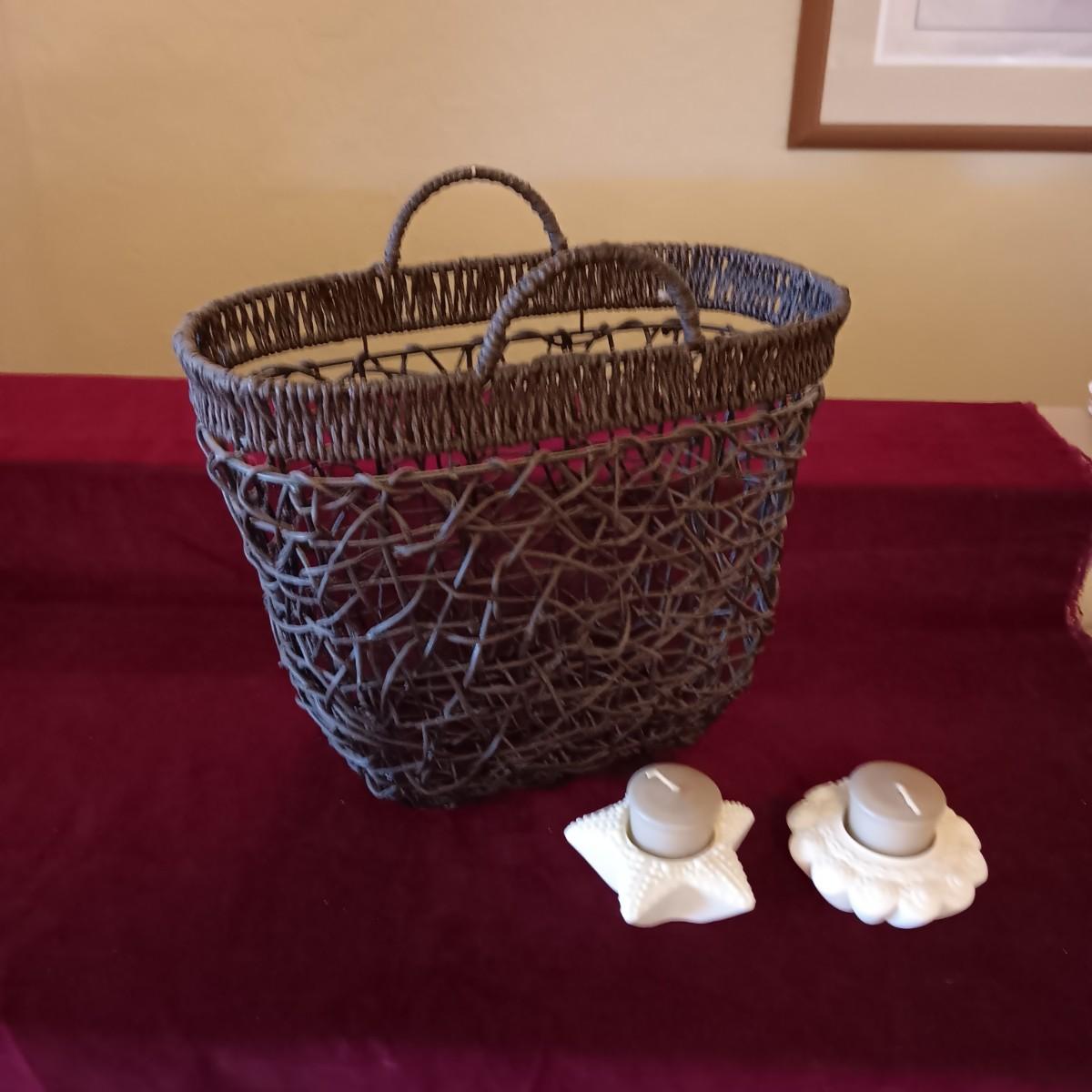 WOVEN TWIG BASKET AND 2 PARTYLITE VOTIVE CANDLE HOLDERS