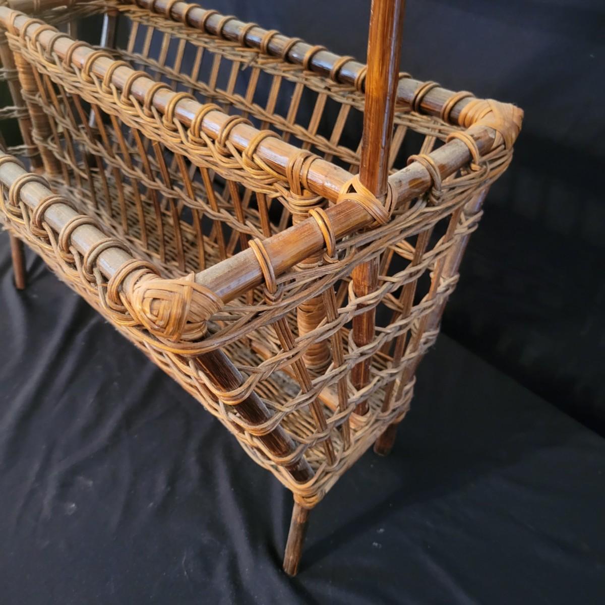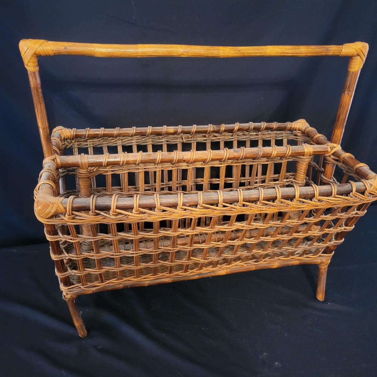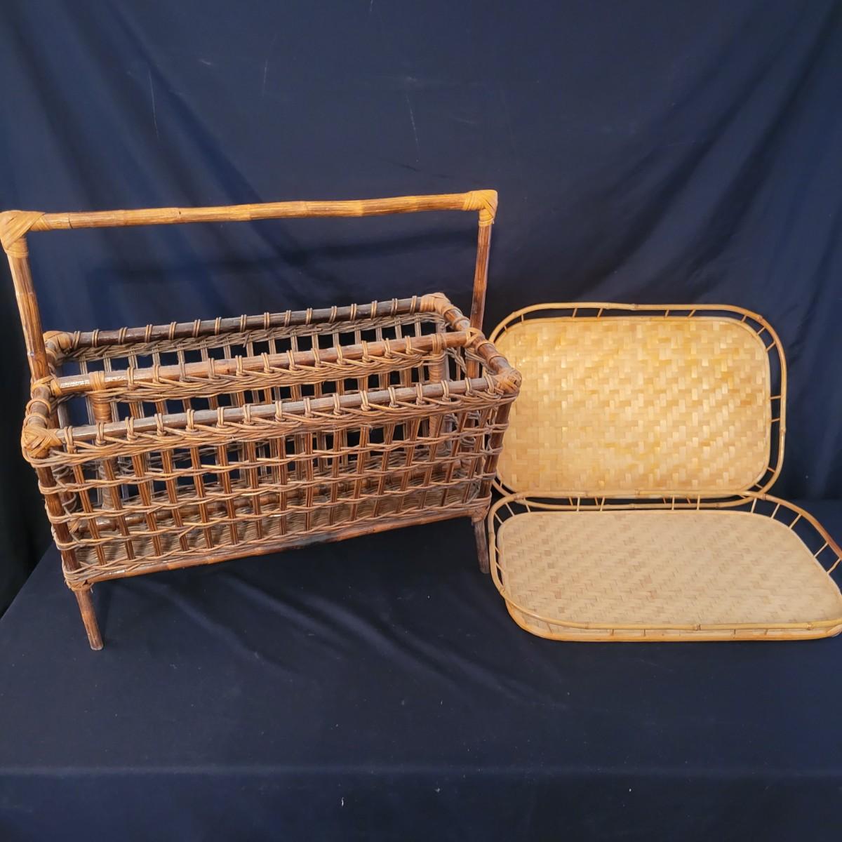 A woven wicker and bamboo magazine rack that has no notable damage and measures approximately 20" x 11" x 19". Lot also includes a pair of bamboo trays that measure approximately 18" x 12" x 1.5". Local pickup only