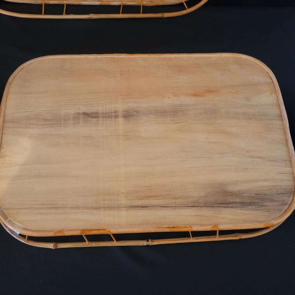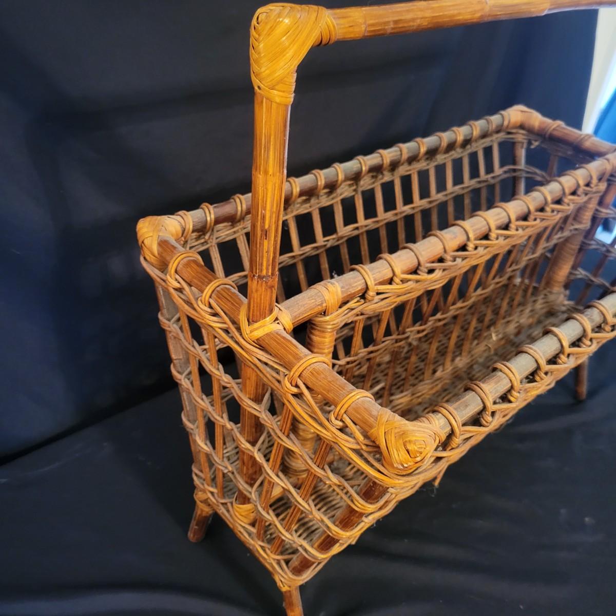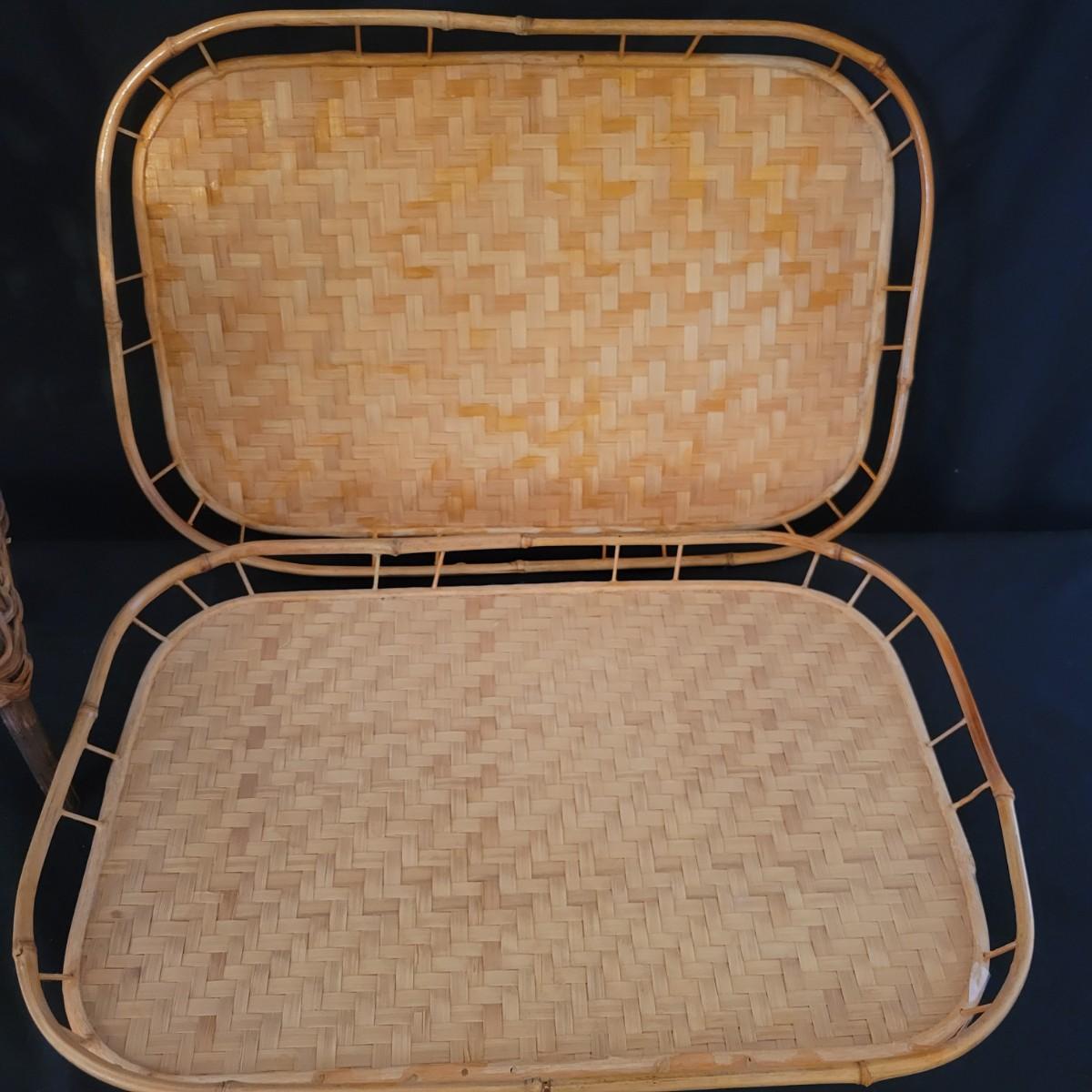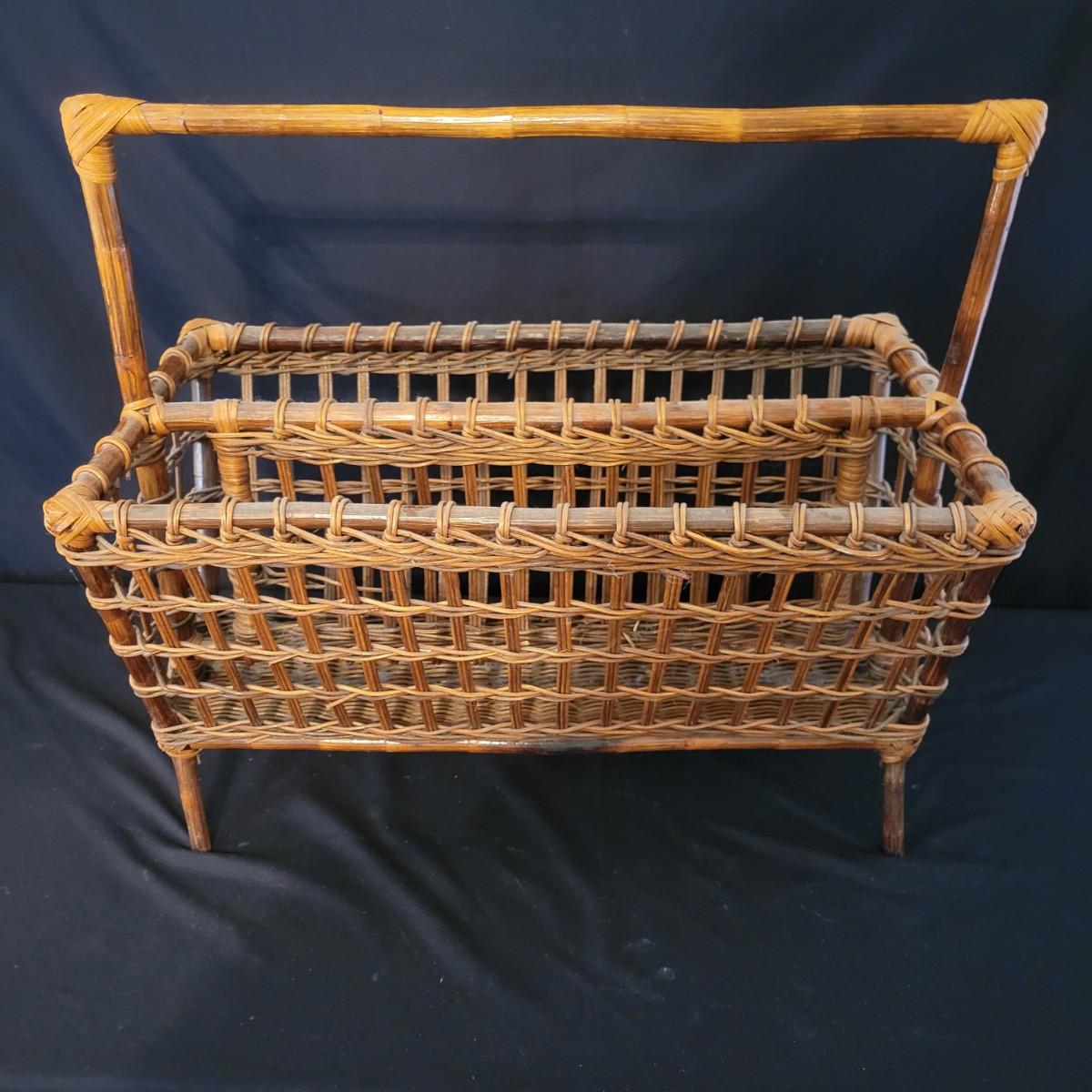 A woven wicker and bamboo magazine rack that has no notable damage and measures approximately 20" x 11" x 19". Lot also includes a pair of bamboo trays that measure approximately 18" x 12" x 1.5". Local pickup only
