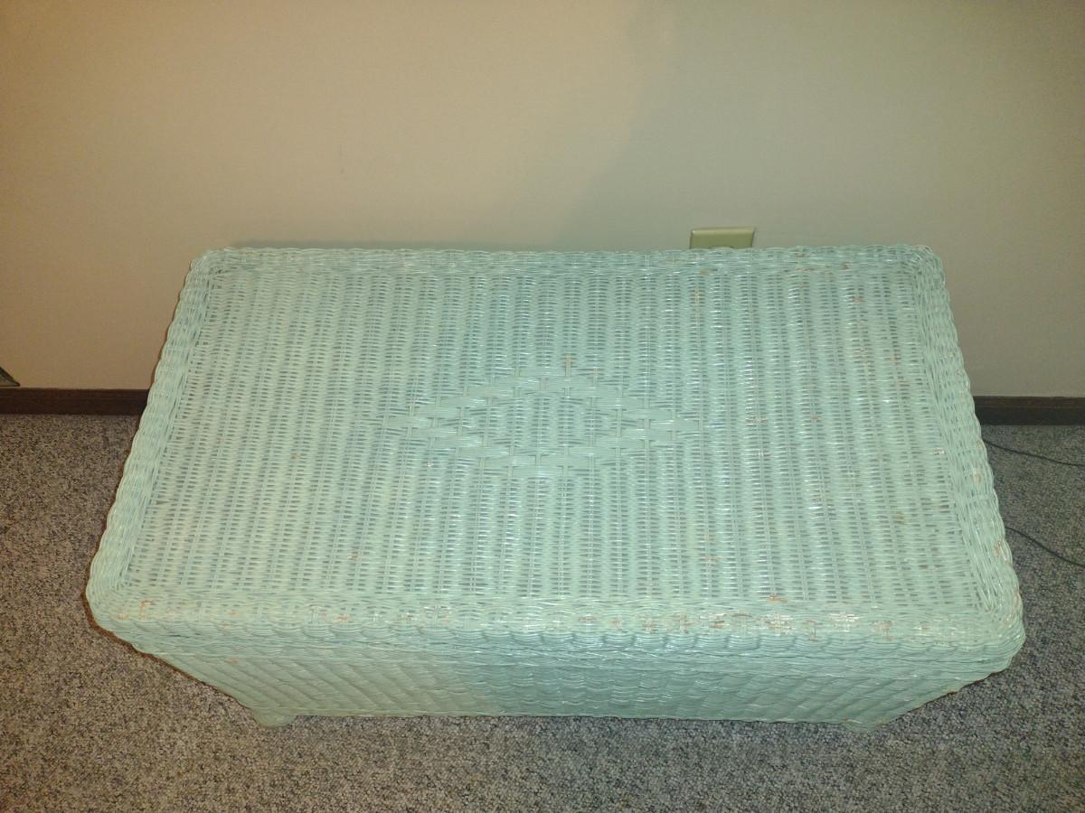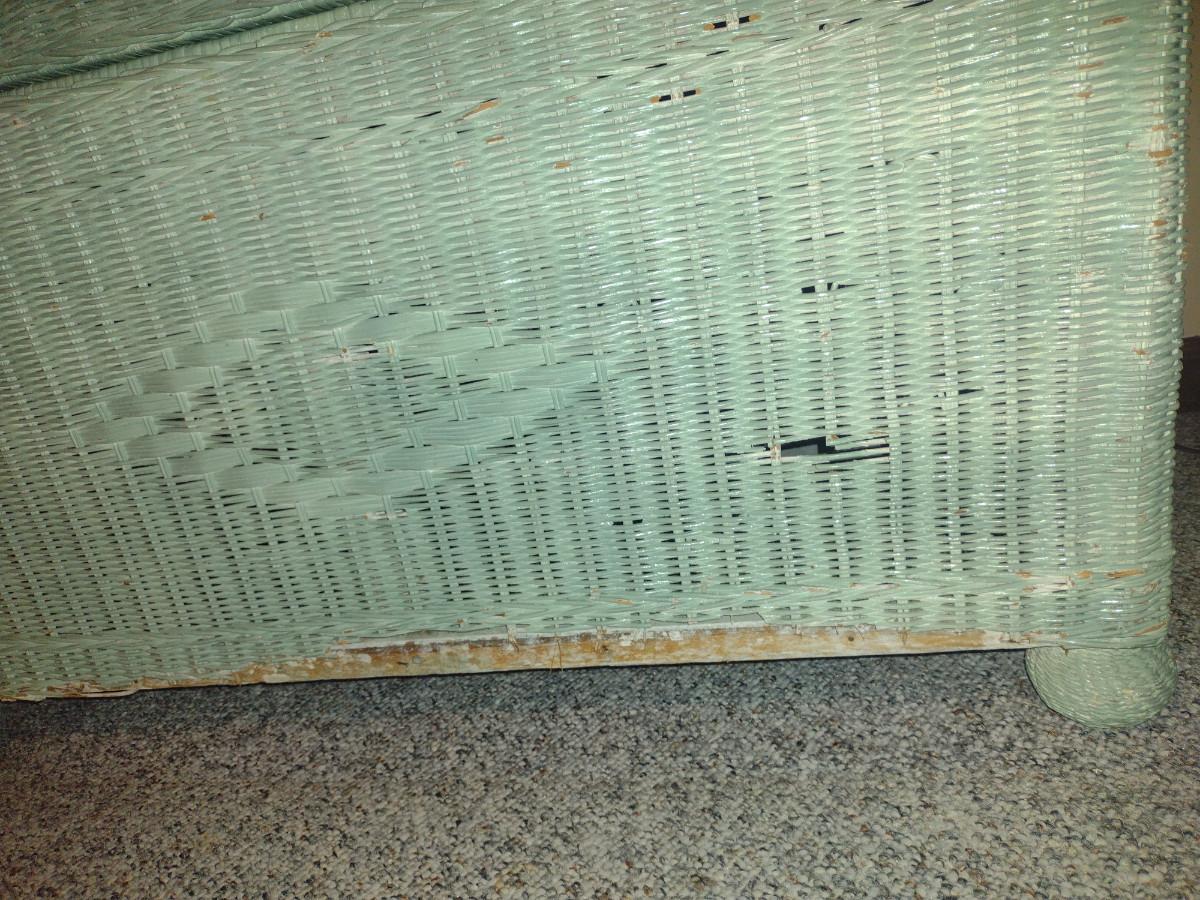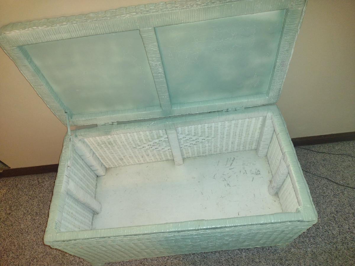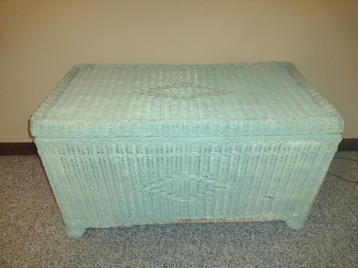 Woven Wicker Storage Chest. Item has some missing color/finish. Small cut in bottom right corner- please see all pictures.