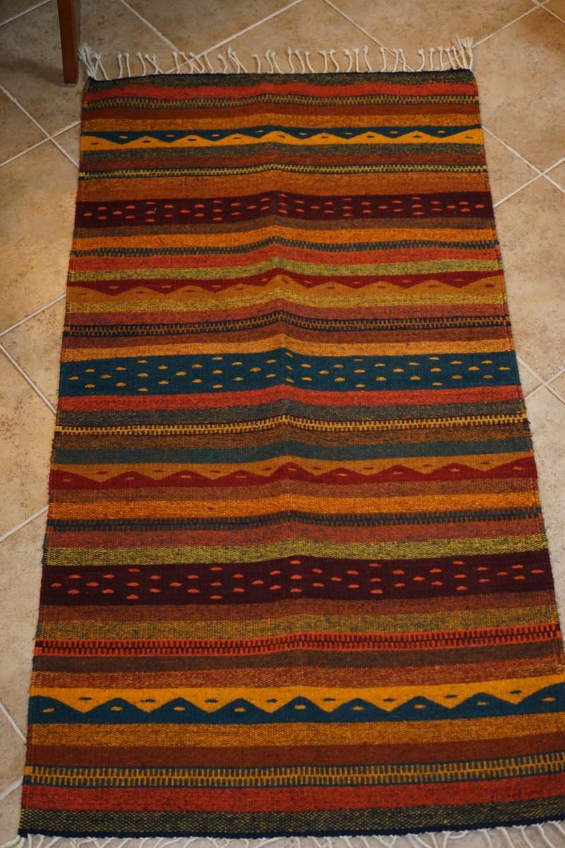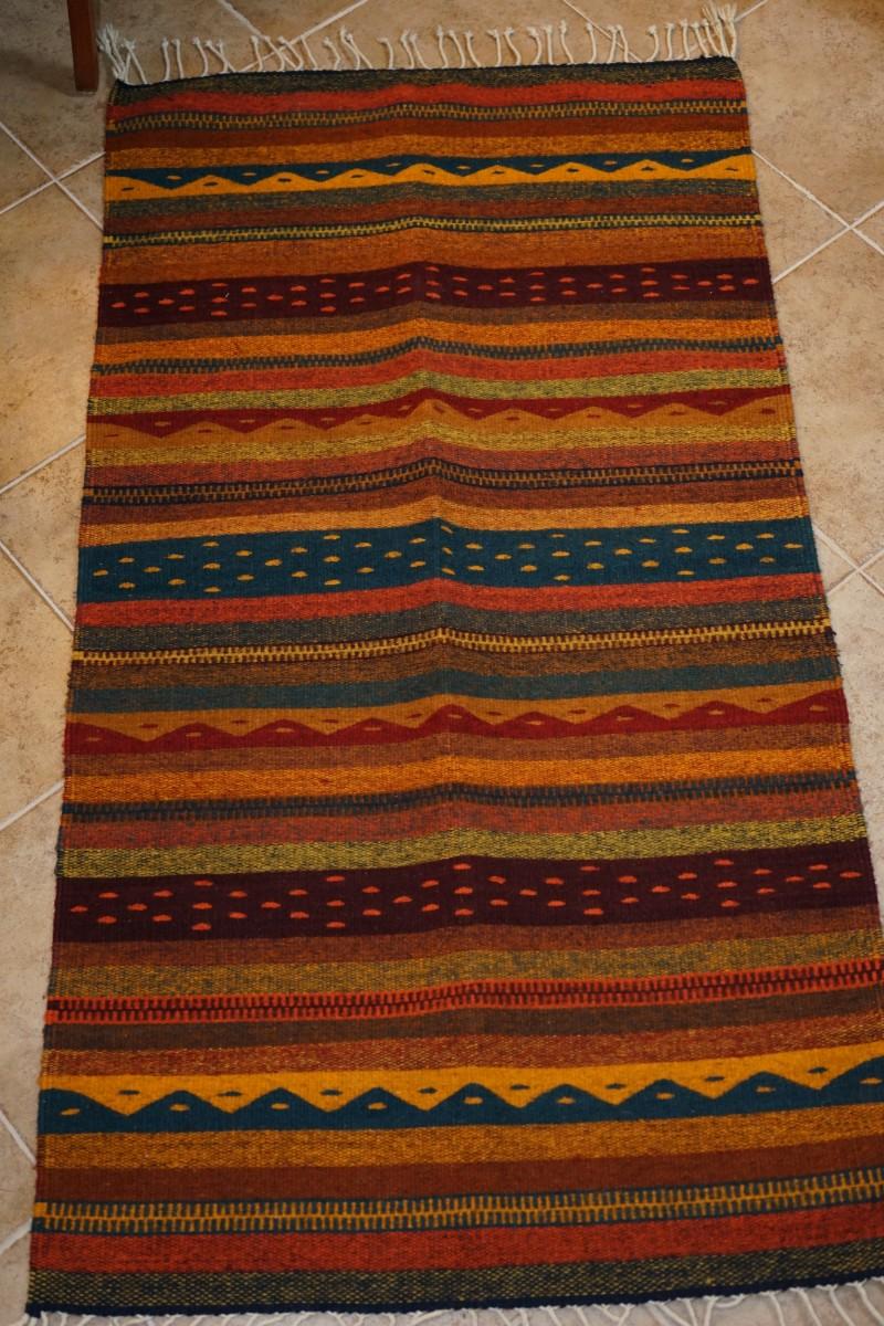 WOVEN WOOL RUG OR DECORATIVE BLANKET OF AUTUMN COLORS OF GOLD/BROWNS AND BLUES