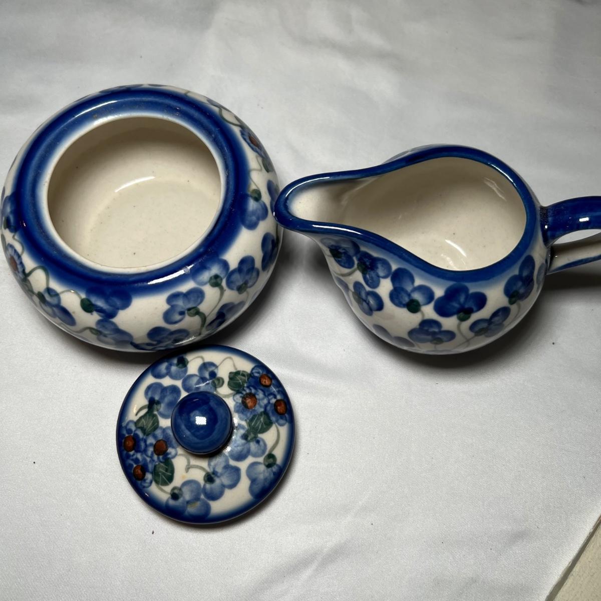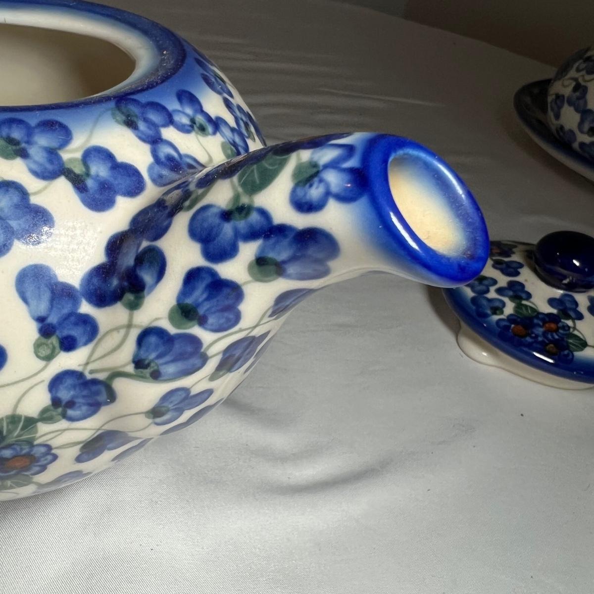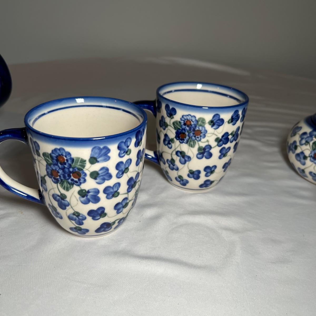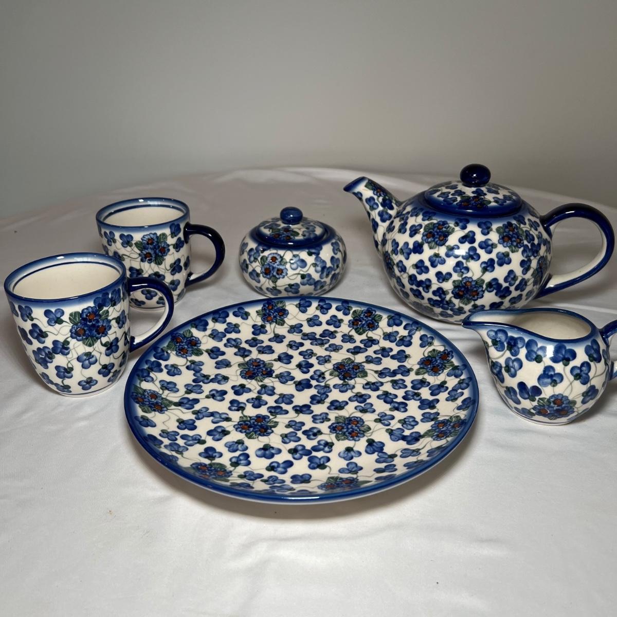 Coffee or tea for 2, this pretty set of Polish pottery is all marked WR Unikat. This set is comprised of a teapot, plate, creamer, sugar bowl and 2 mugs. All items are spotless with no chips or cracks. Plate measures 10” diameter.