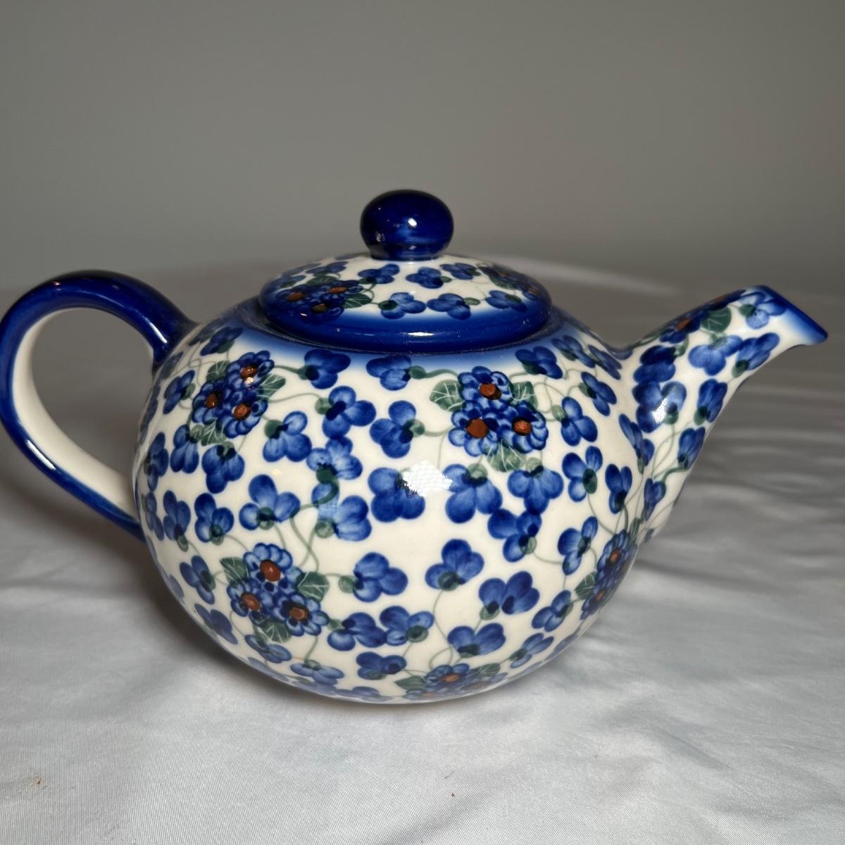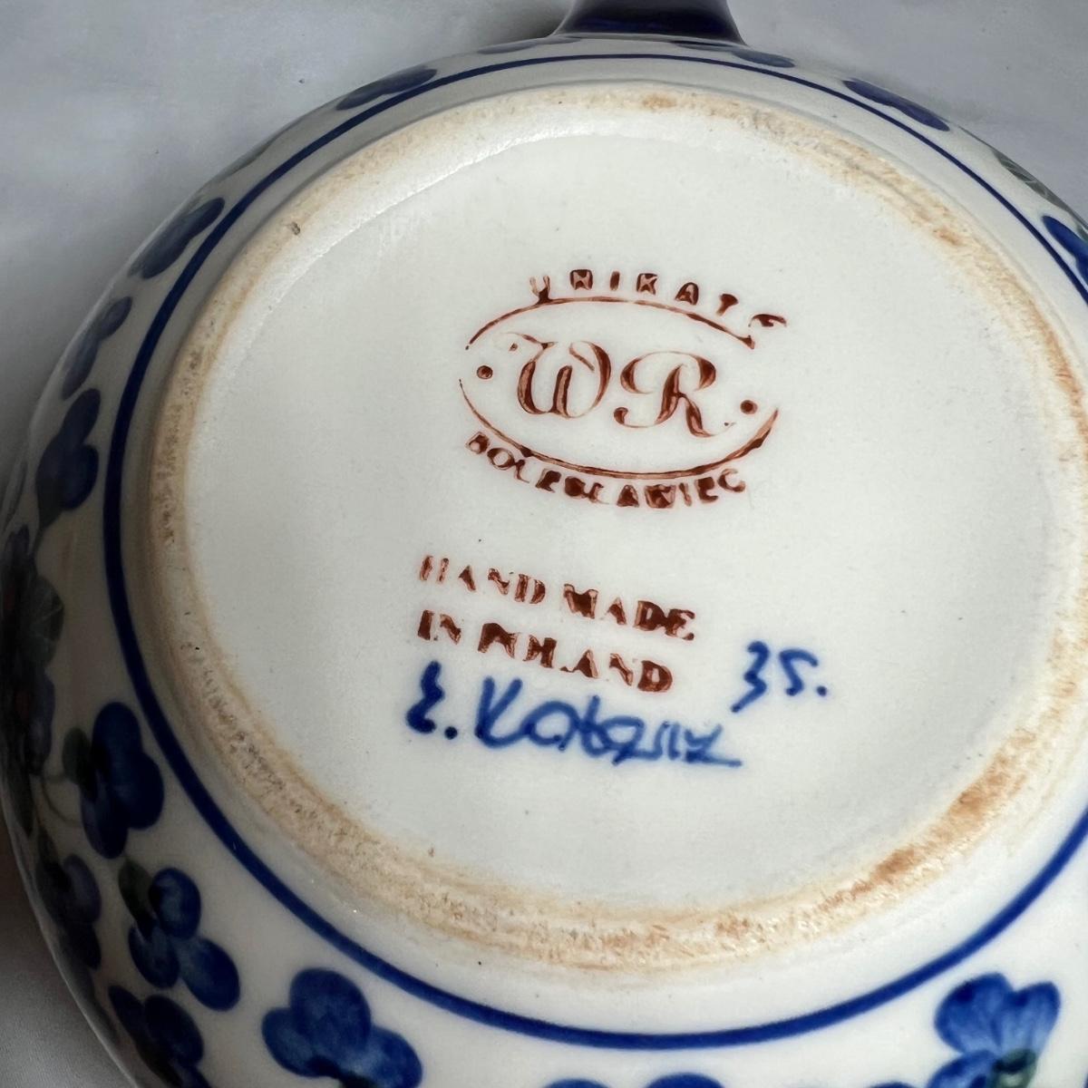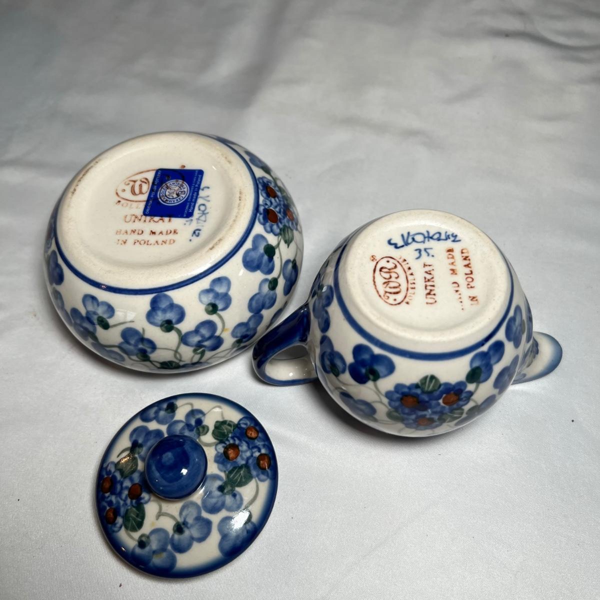 Coffee or tea for 2, this pretty set of Polish pottery is all marked WR Unikat. This set is comprised of a teapot, plate, creamer, sugar bowl and 2 mugs. All items are spotless with no chips or cracks. Plate measures 10” diameter.