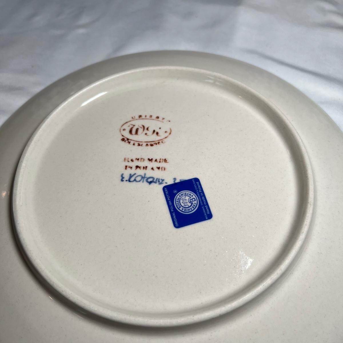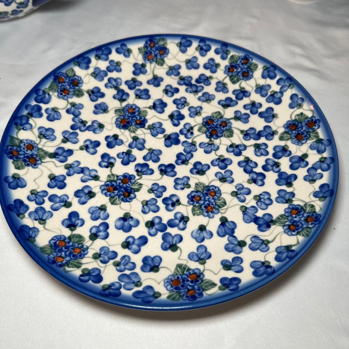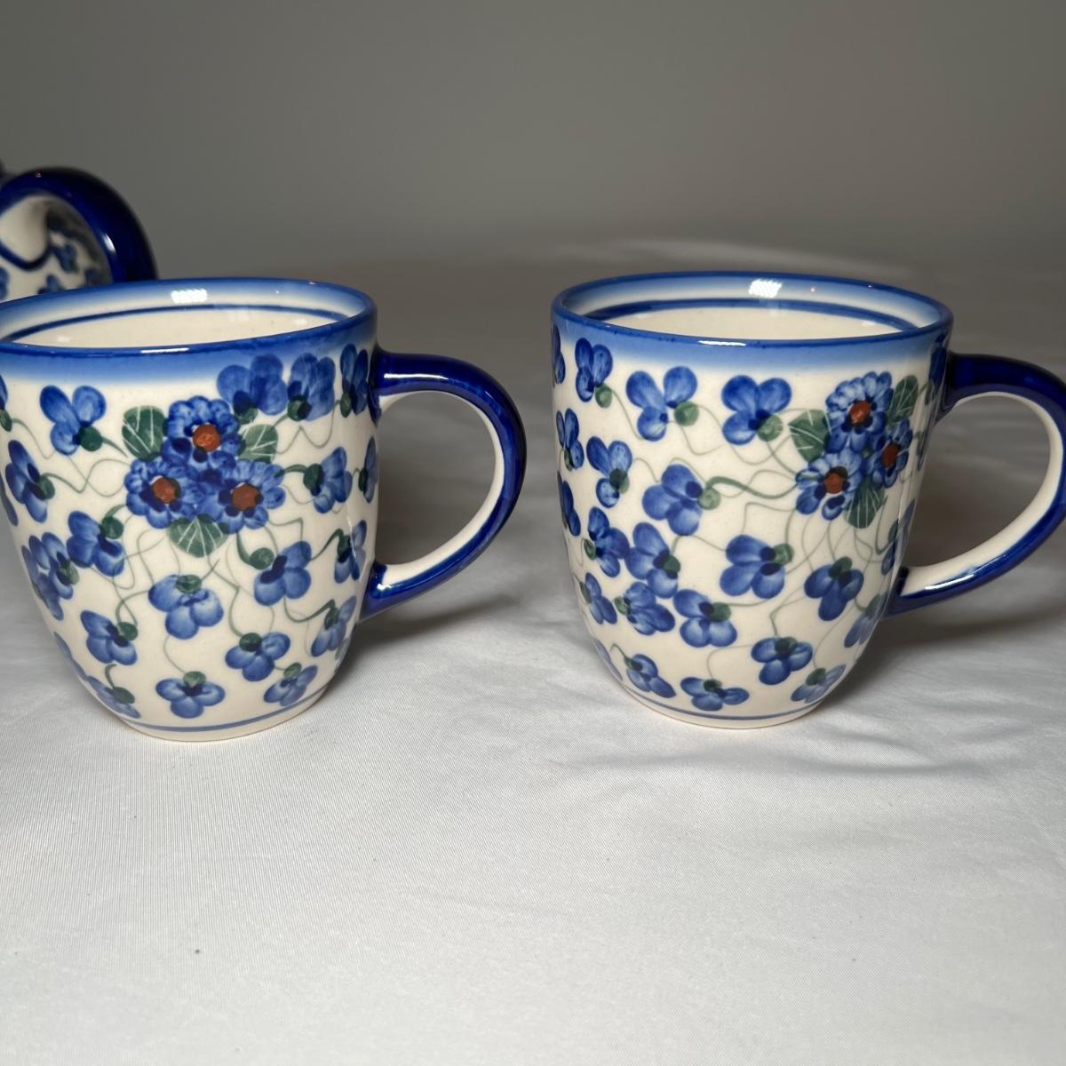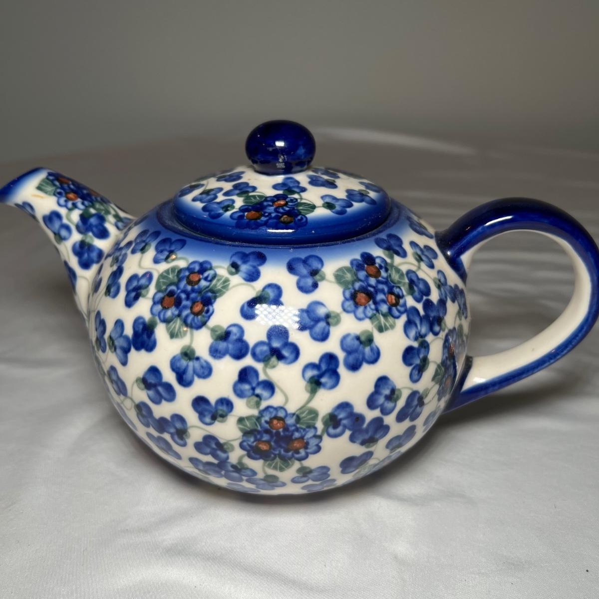 Coffee or tea for 2, this pretty set of Polish pottery is all marked WR Unikat. This set is comprised of a teapot, plate, creamer, sugar bowl and 2 mugs. All items are spotless with no chips or cracks. Plate measures 10” diameter.
