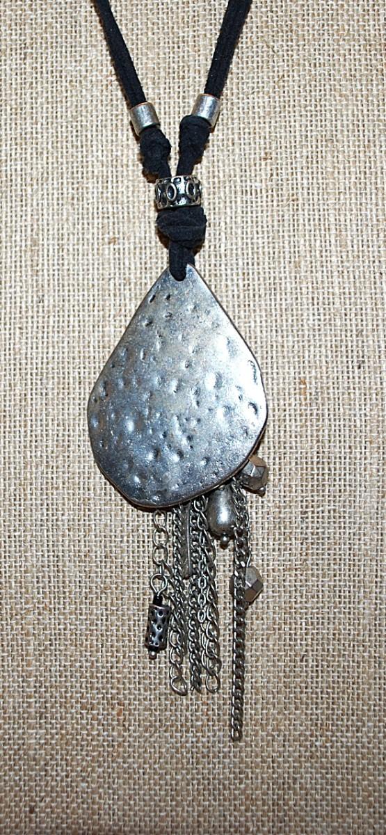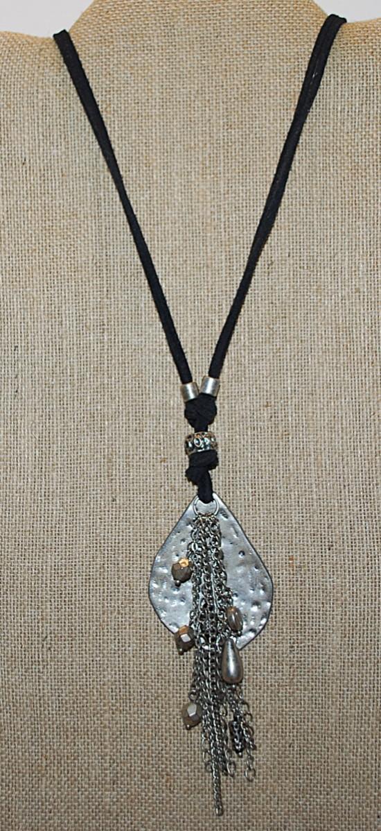 Wrap-Around Hammered Metal Triangle NECKLACE with Unidentified Hallmark & Bead Dangles on a Black Cloth Rope and Lobster Clasp 42" L