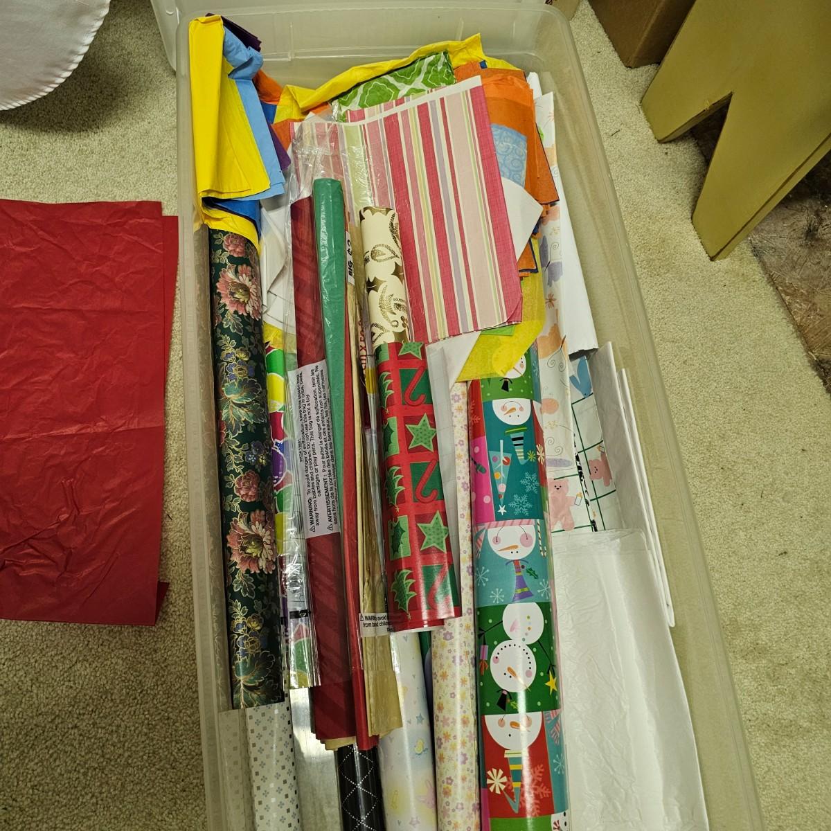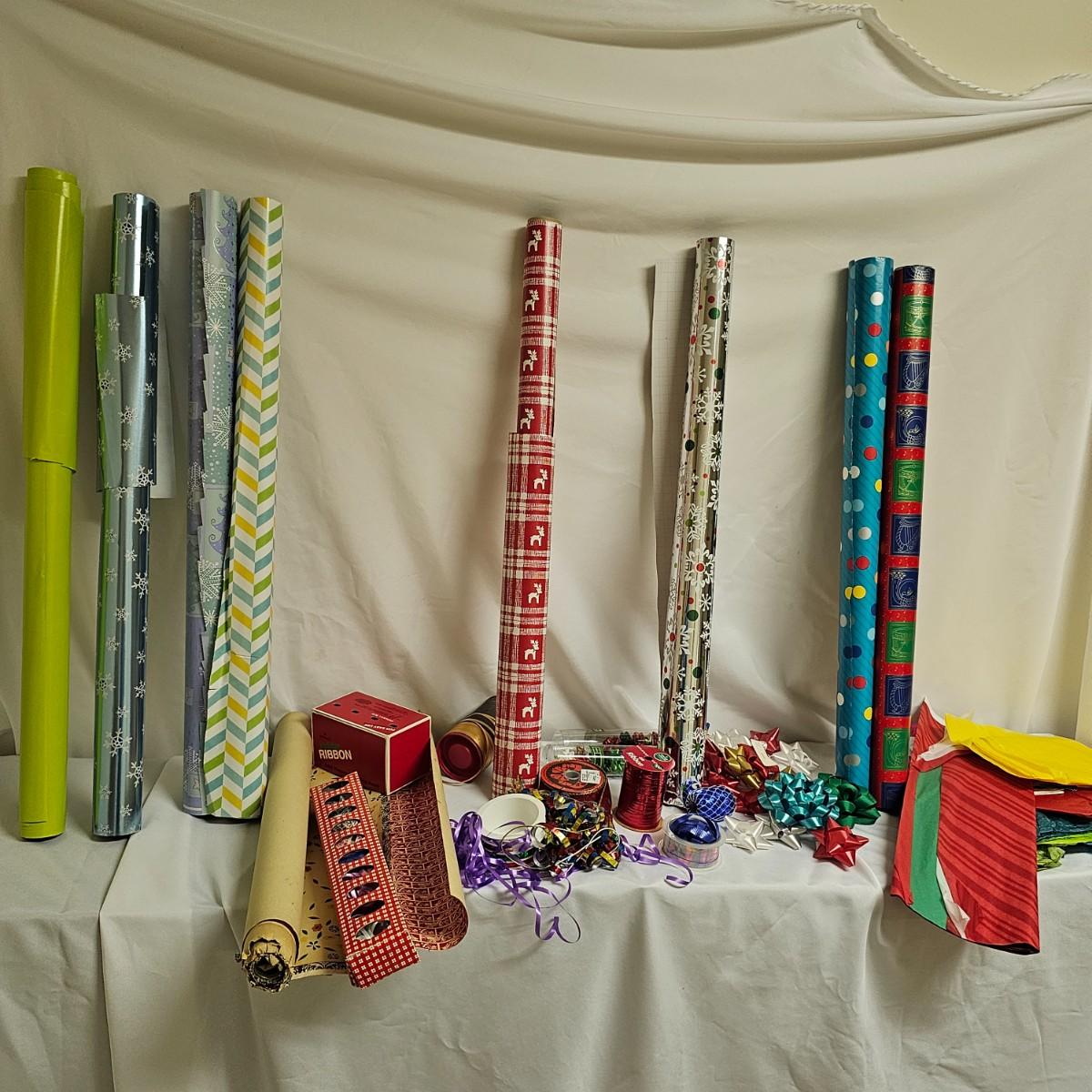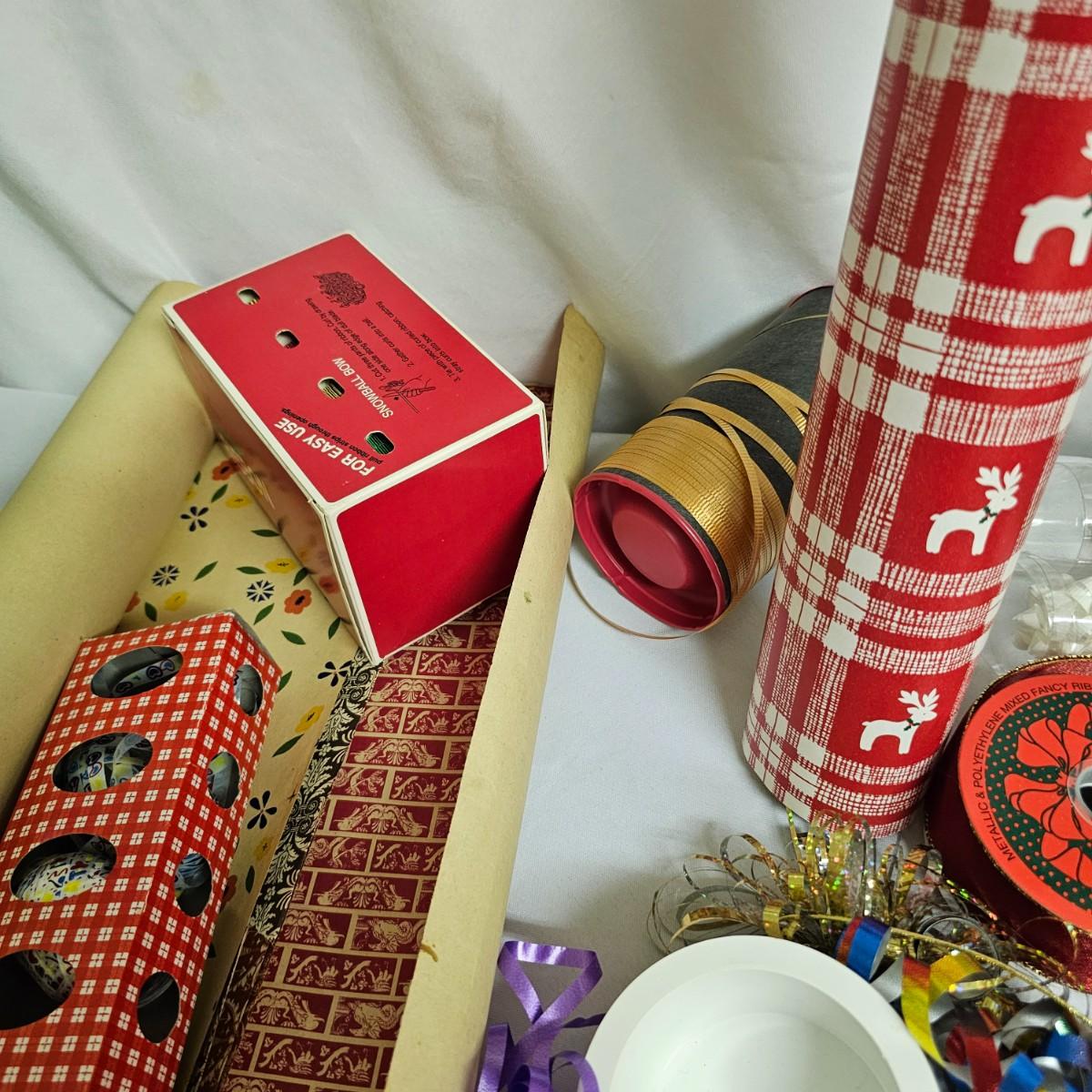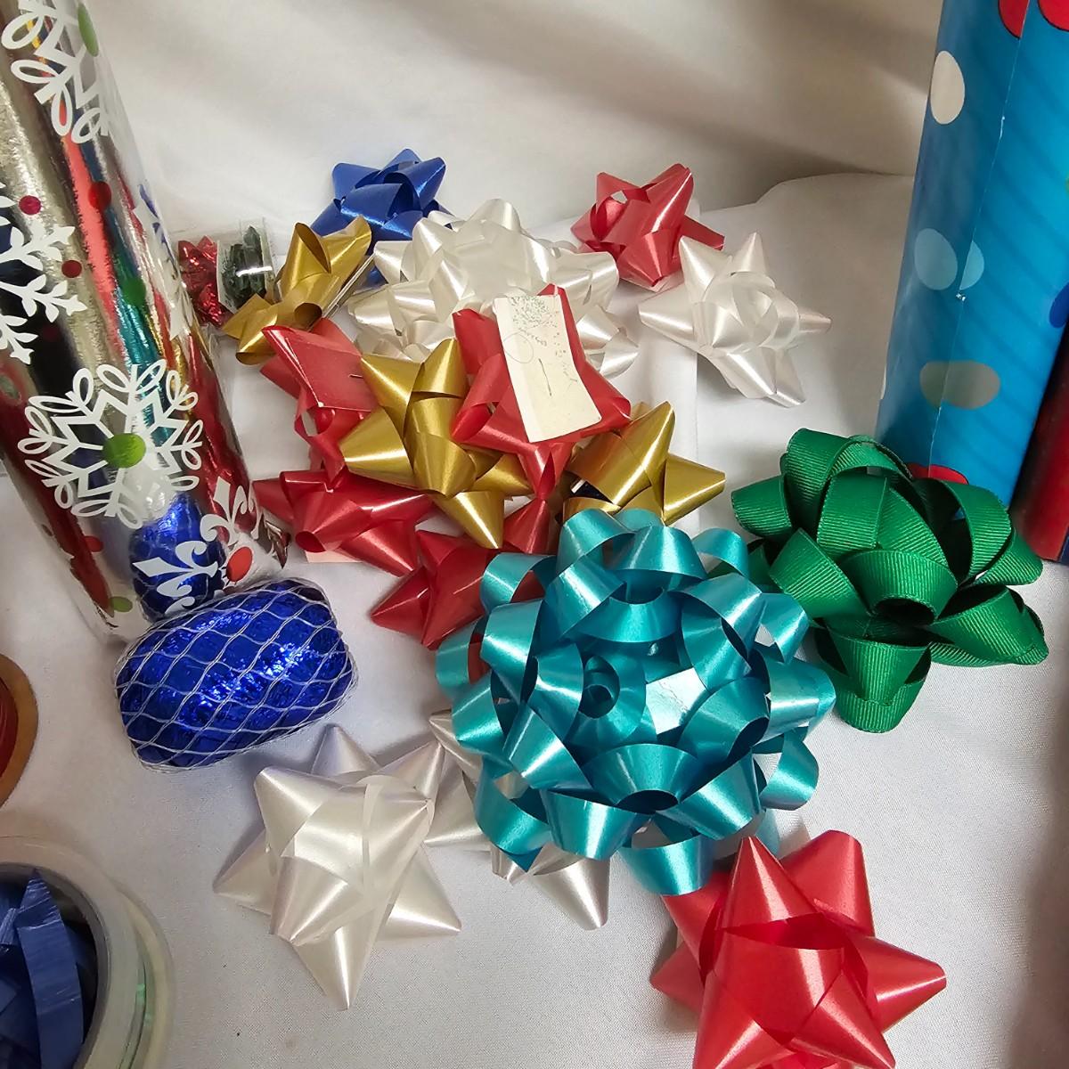A mixture of Christmas and all occasions wrap, bows, ribbons and more. Includes several colors of tissue paper and also some vintage design kraft paper. Containers included. See photos for details. Local pickup only.