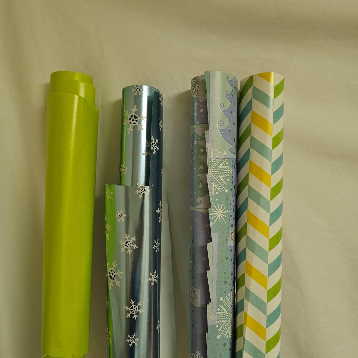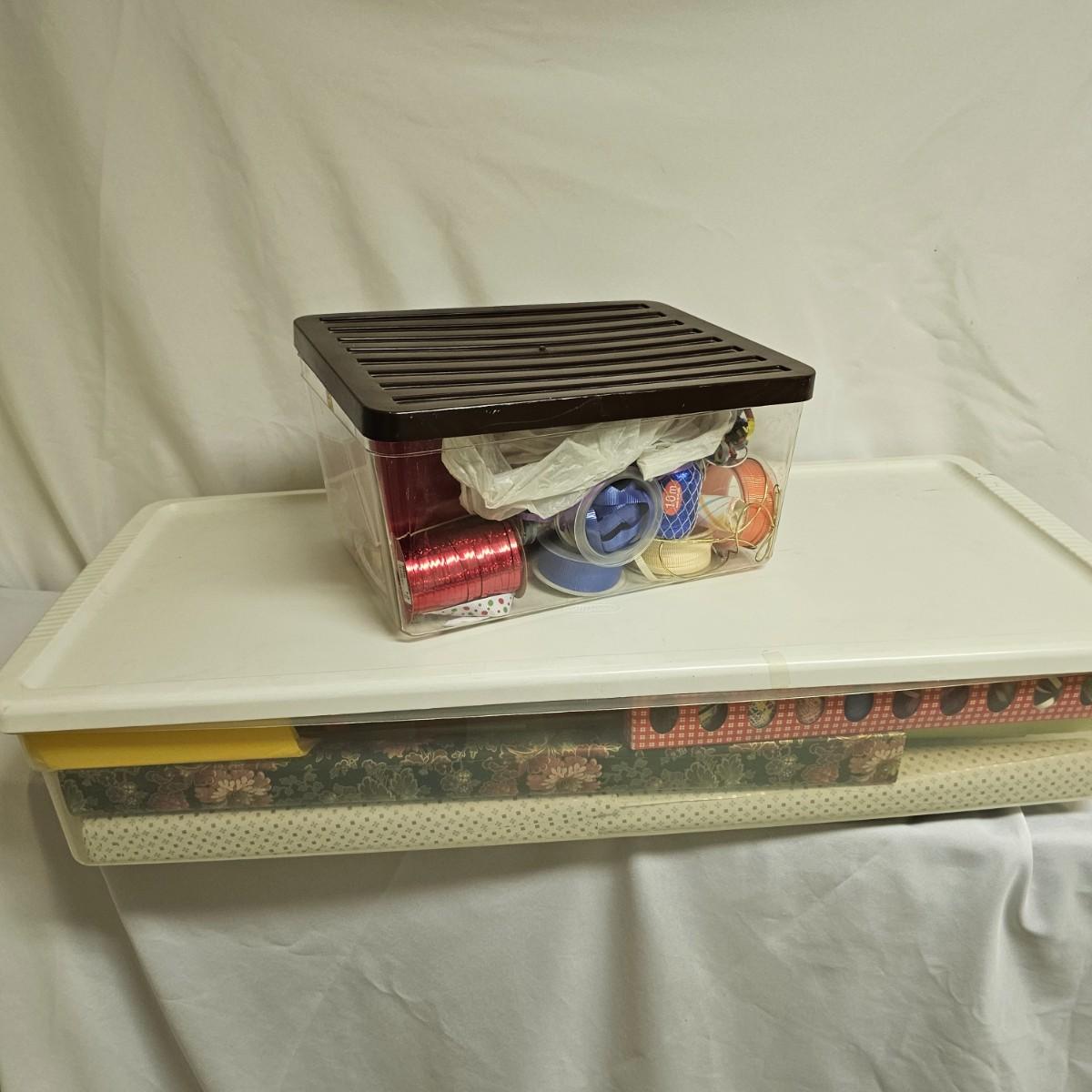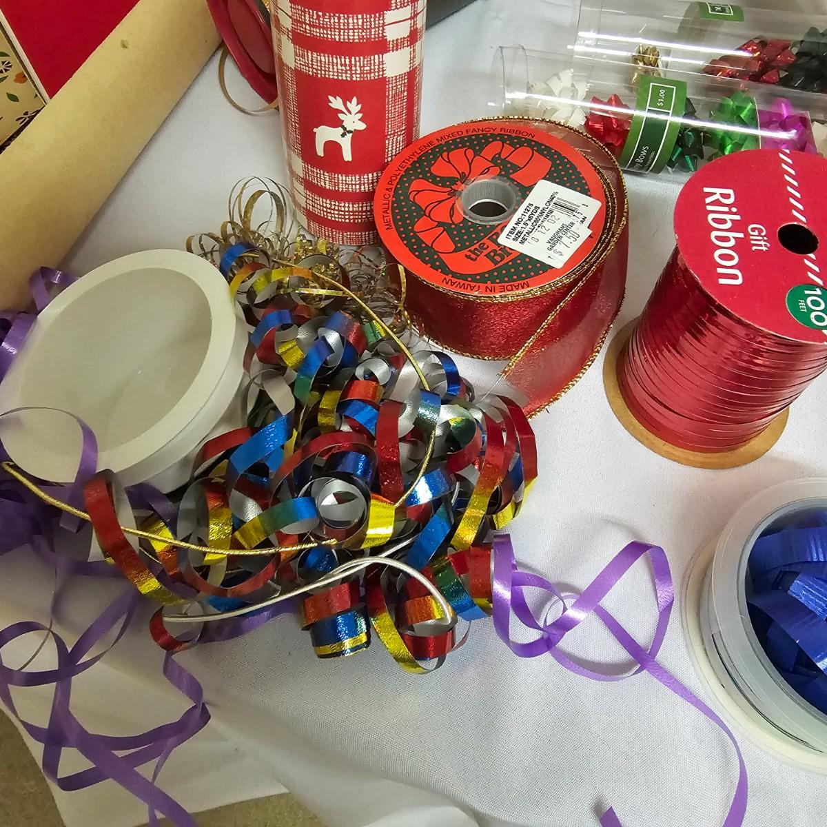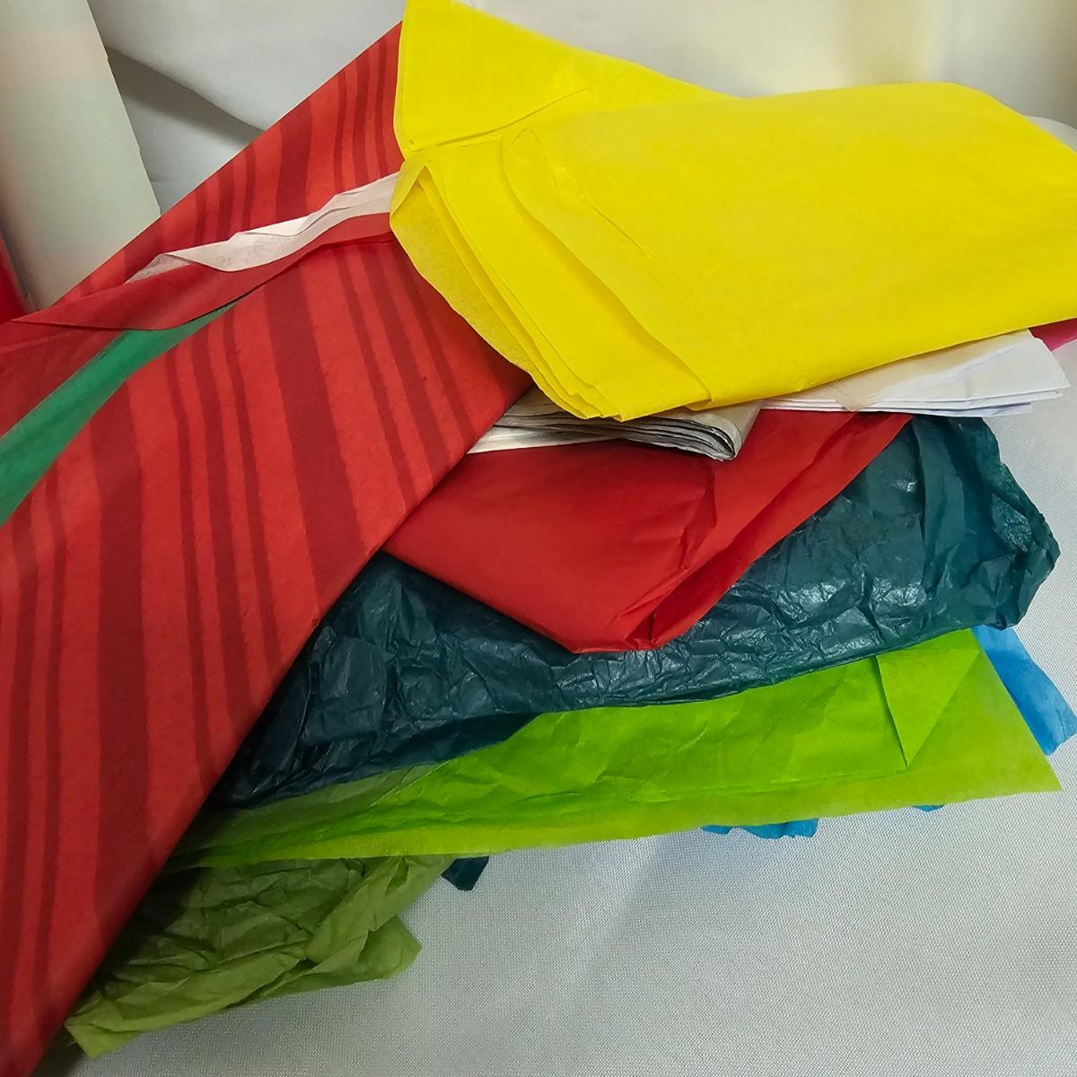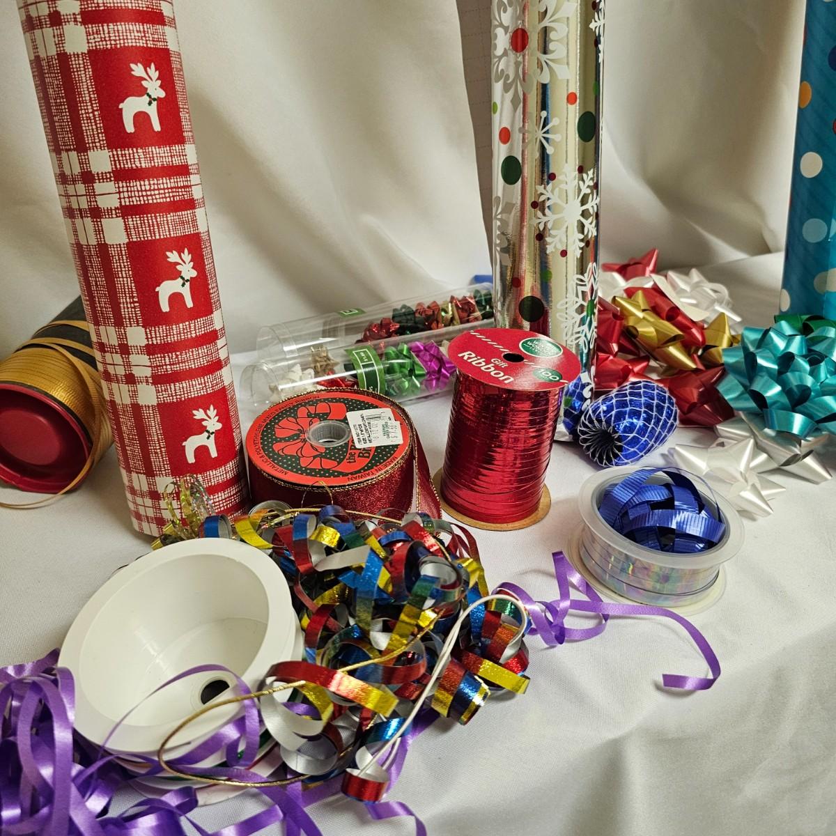 A mixture of Christmas and all occasions wrap, bows, ribbons and more. Includes several colors of tissue paper and also some vintage design kraft paper. Containers included. See photos for details. Local pickup only.