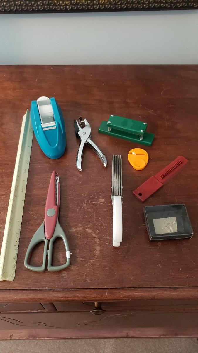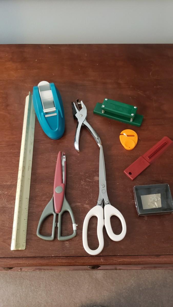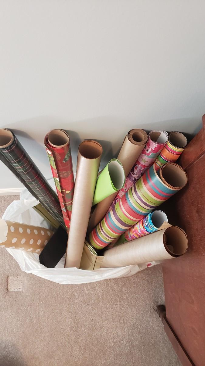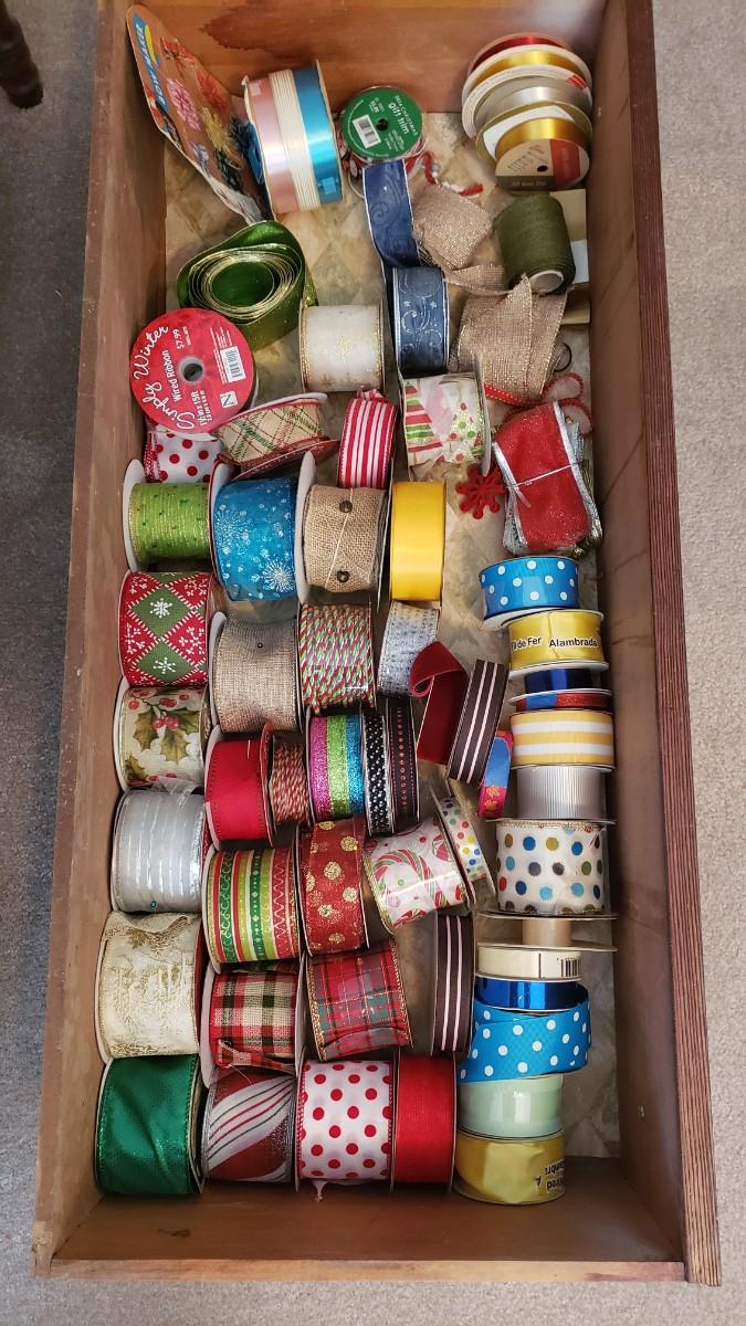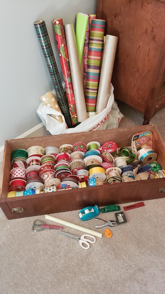 This lot features multiple rolls of wrapping paper and a huge amount of various ribbon in all sizes and material, see picture (drawer not included). This lot has bow making items, as well as different types of scissors. Local pickup only.