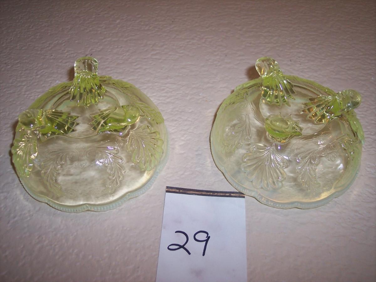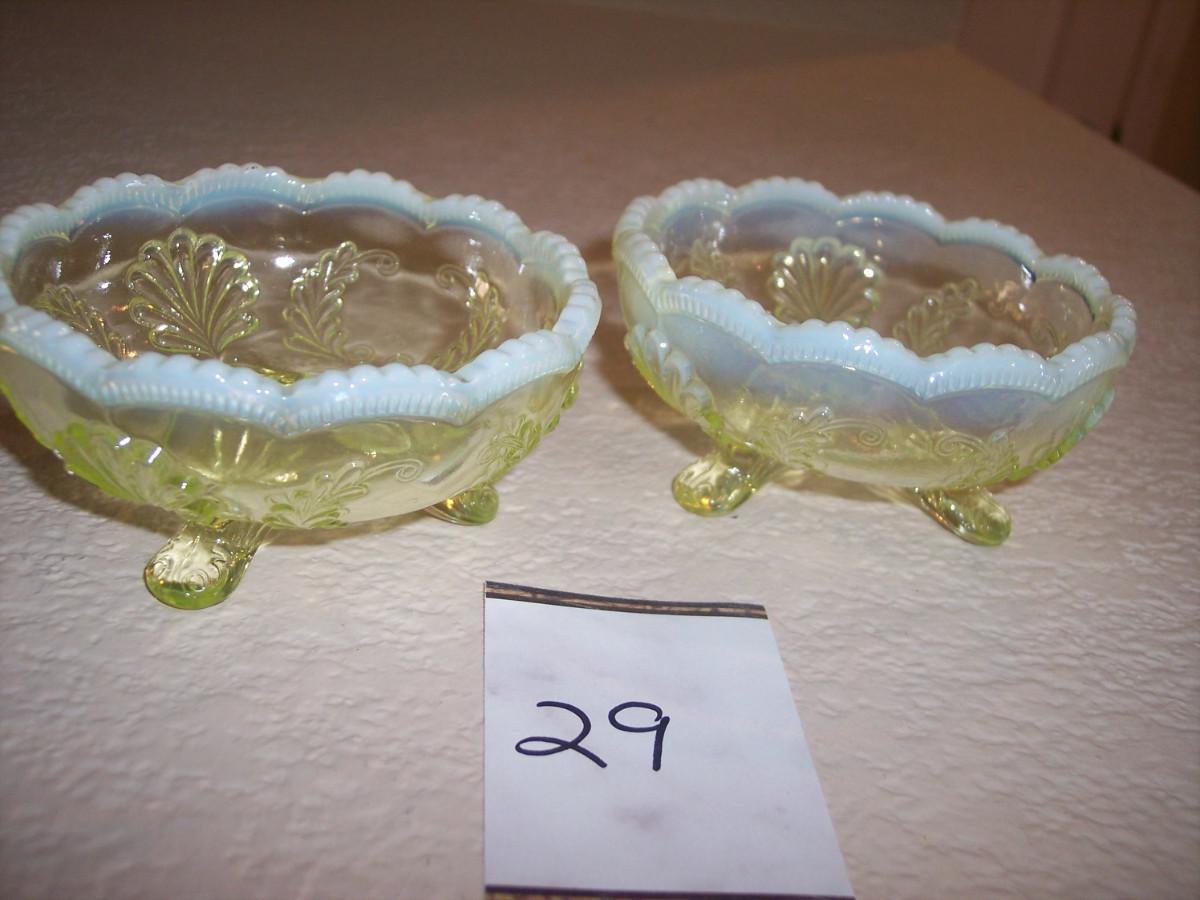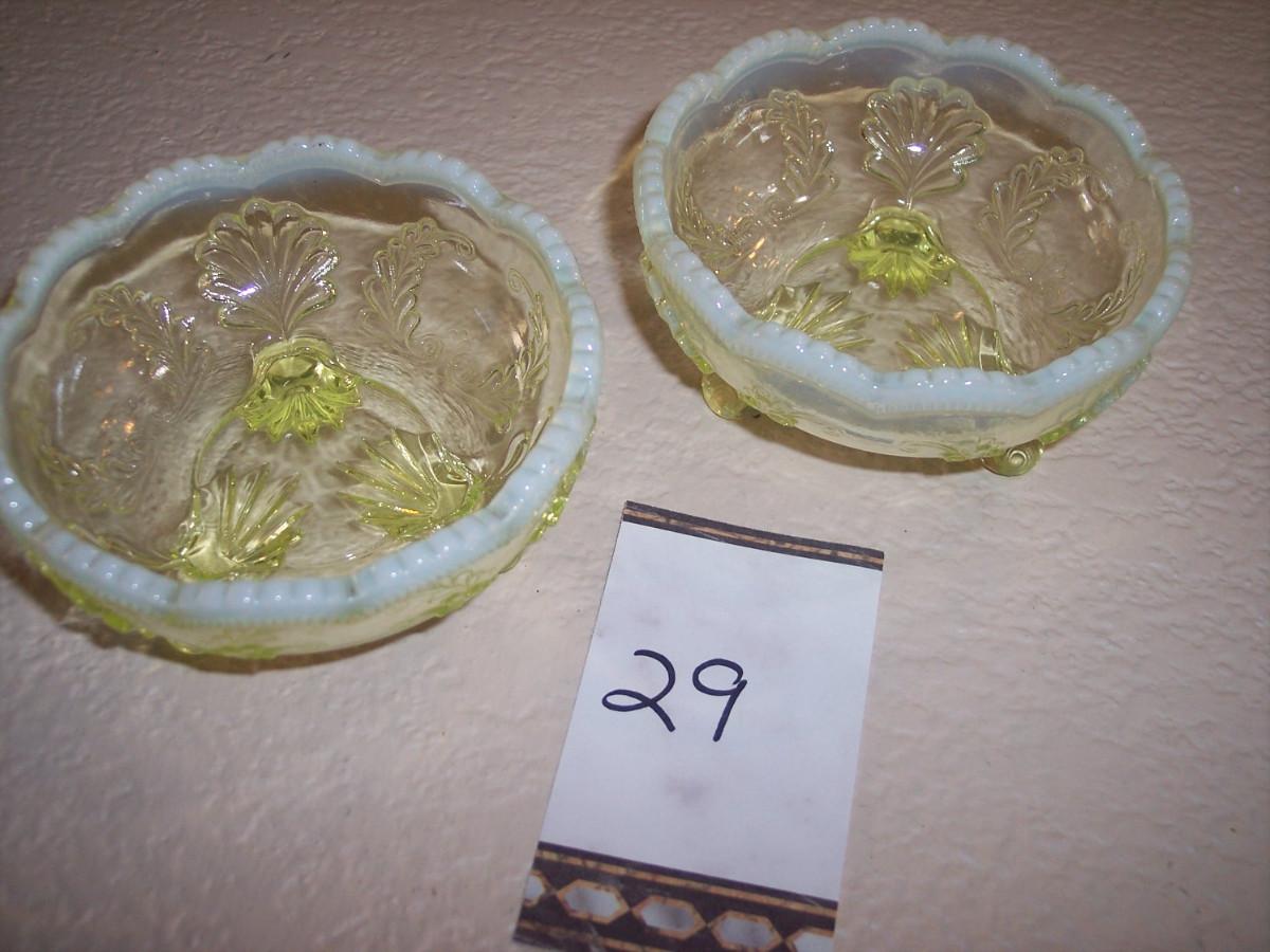 Wreath & Shell Vaseline Uranium Glass Footed Berry Bowls