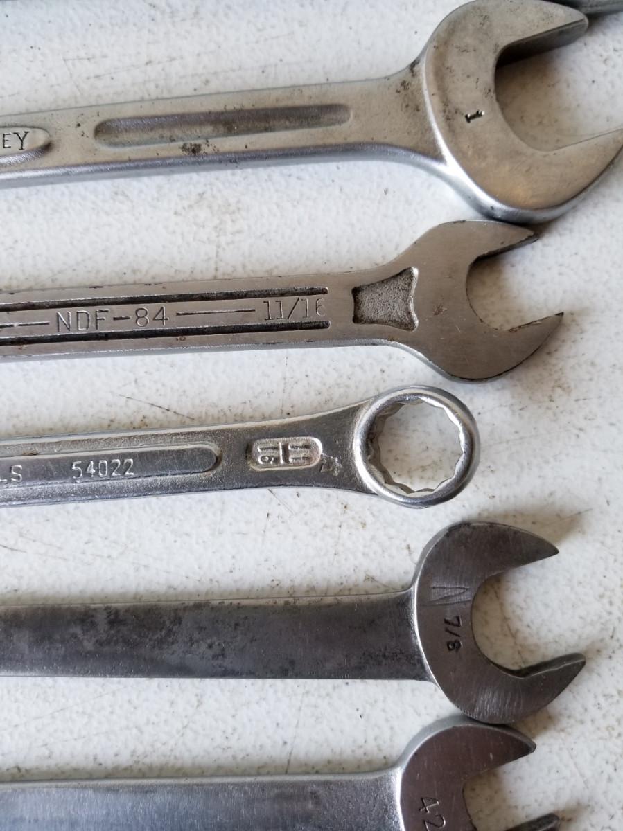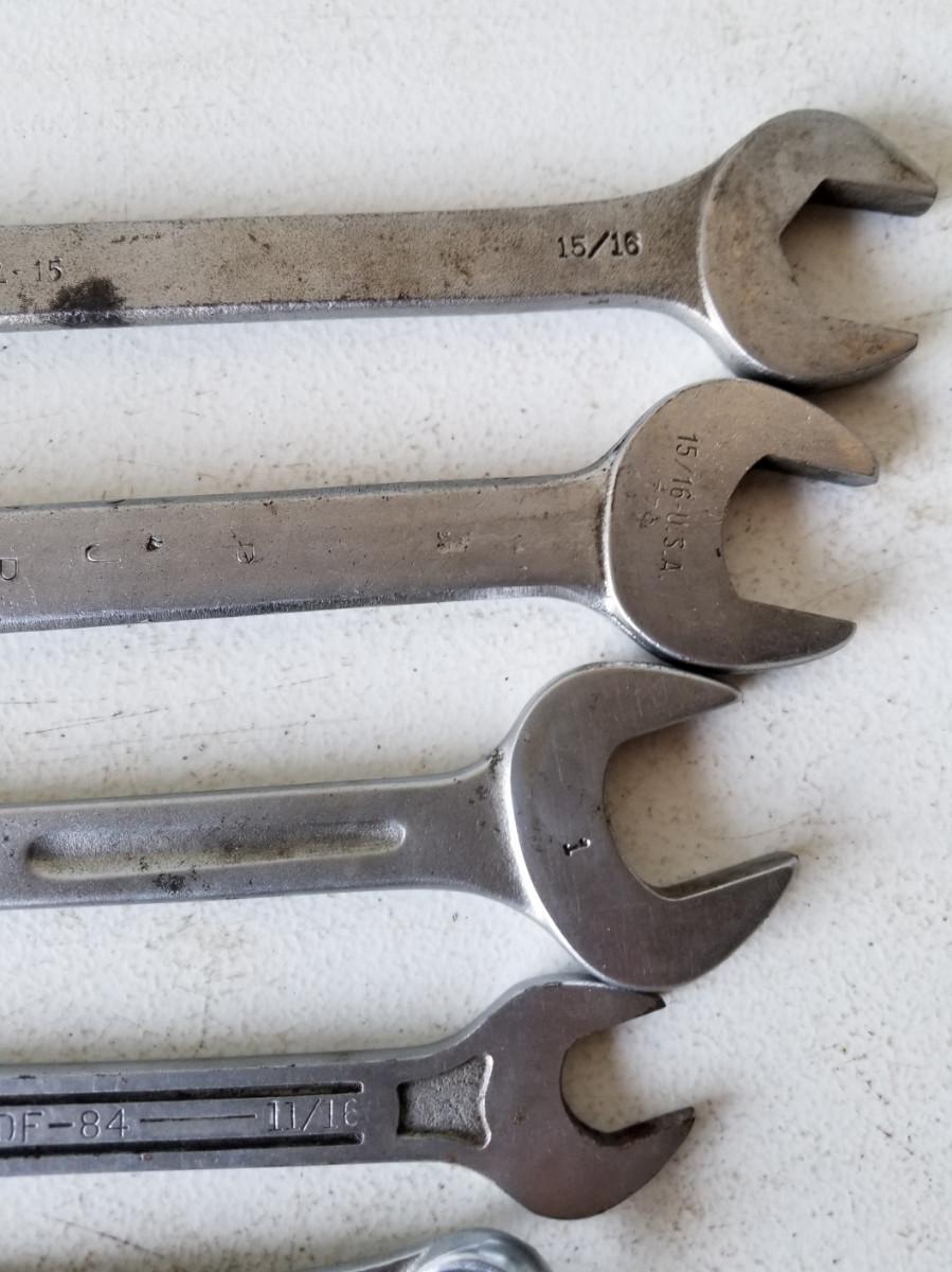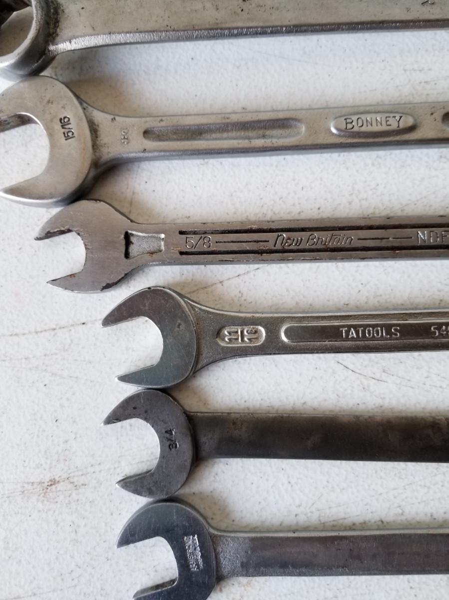 Wrenches are from various manufacturers. Combo wrenches are in sizes 2 @ 15/16", and one @ 11/16". Double open end wrenches in sizes 1" & 15/16", 5/8" & 11/16", 3/4" & 7/8", and what appears to be a Vintage Bonney-Bonaloy Tools wrench, possibly in 11/16 - 5/8" according to that manufacturer.