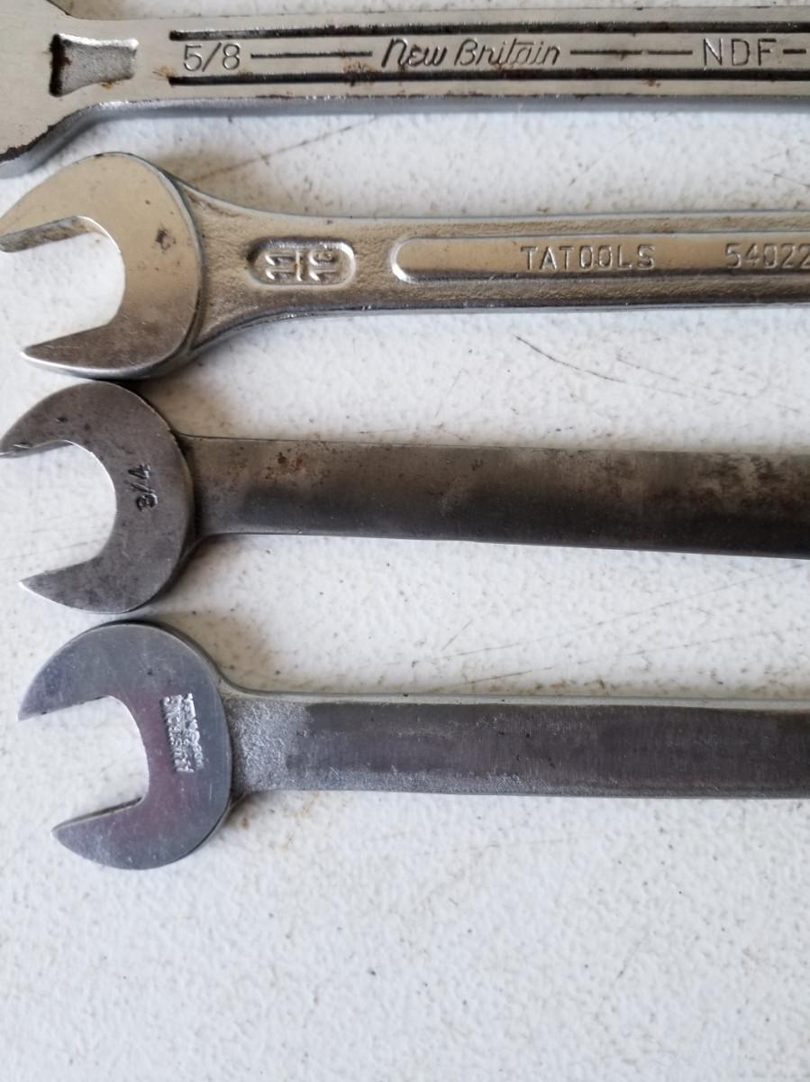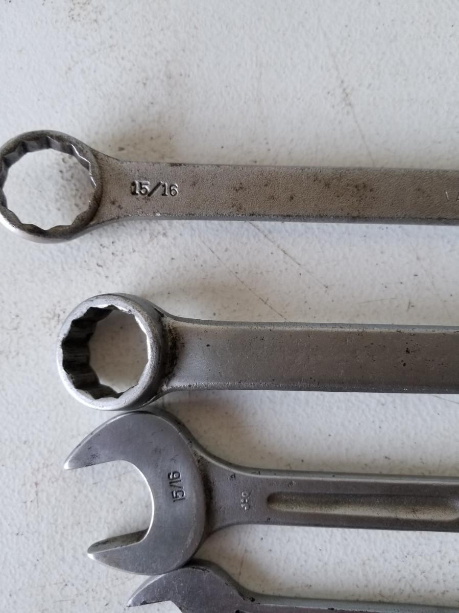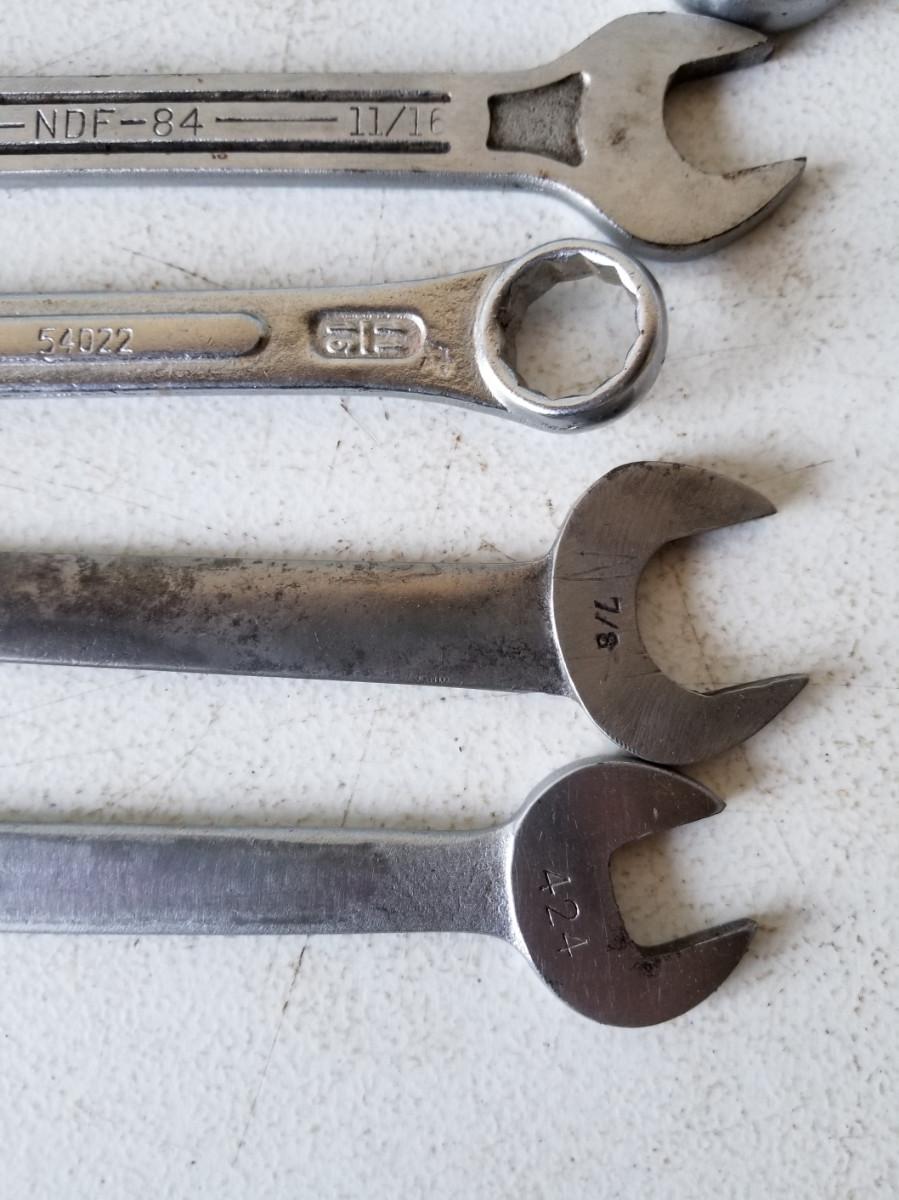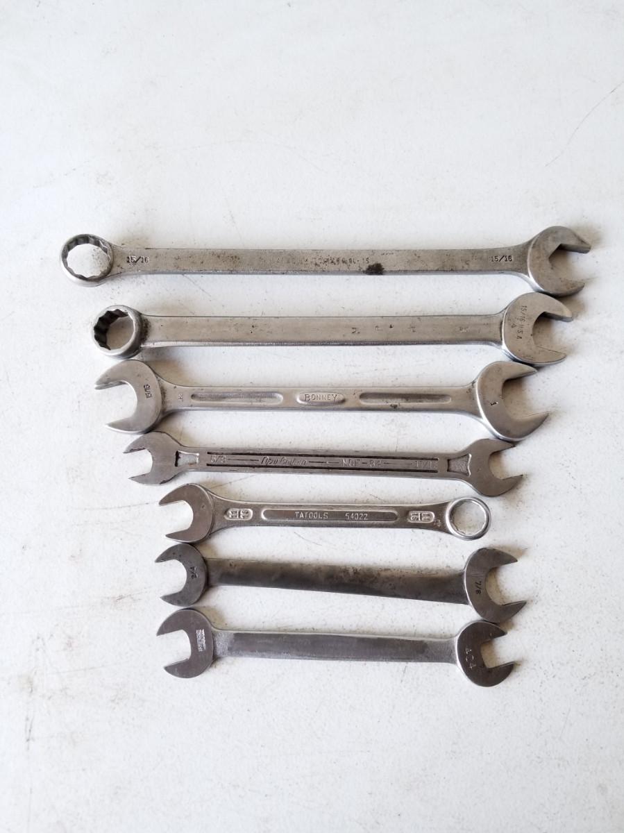 Wrenches are from various manufacturers. Combo wrenches are in sizes 2 @ 15/16", and one @ 11/16". Double open end wrenches in sizes 1" & 15/16", 5/8" & 11/16", 3/4" & 7/8", and what appears to be a Vintage Bonney-Bonaloy Tools wrench, possibly in 11/16 - 5/8" according to that manufacturer.