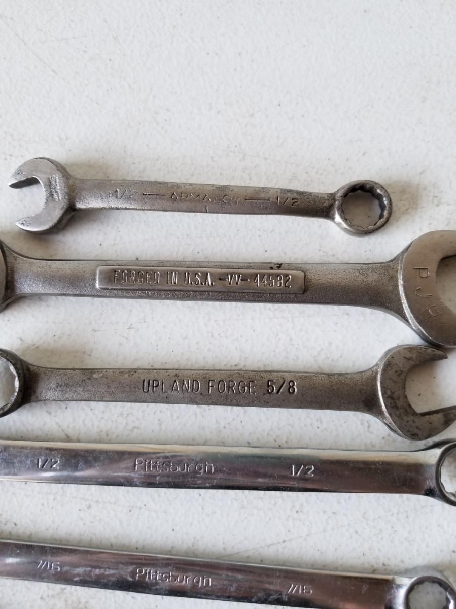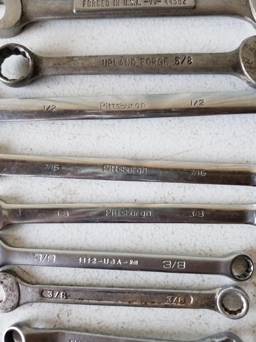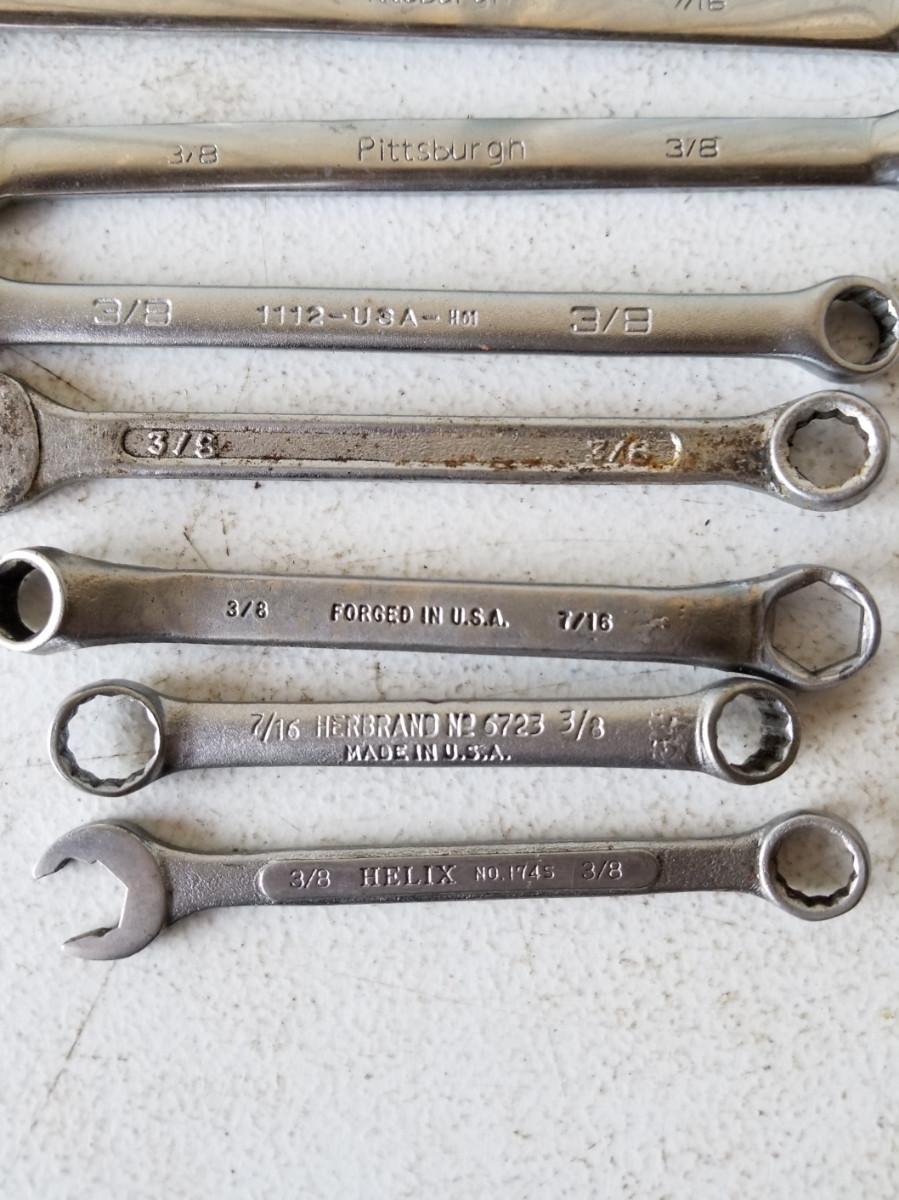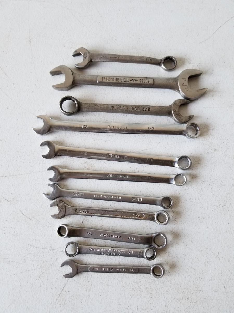 11 wrenches from a variety of manufacturers. The double open end wrench is a Craftsman 44582 model, which was found on various websites as being sizes 5/8" and 3/4". The two combo box wrenches are both in sizes 3/8" and 7/16". The combo wrenches are in sizes 5/8", 1/2" 7/16", and four 3/8" inch wrenches.