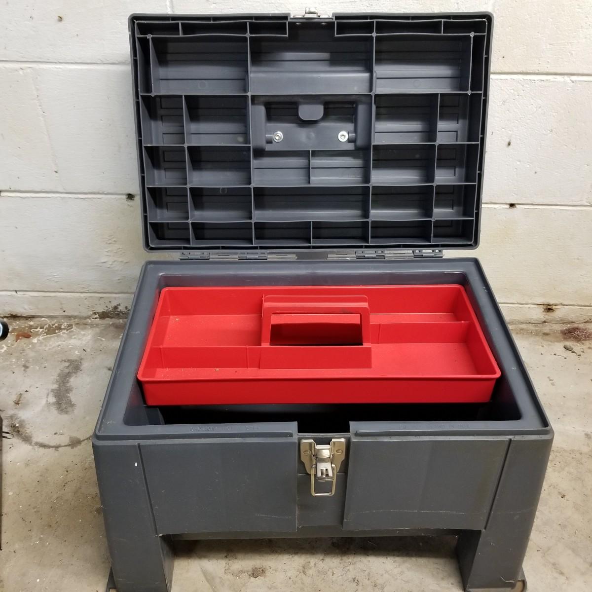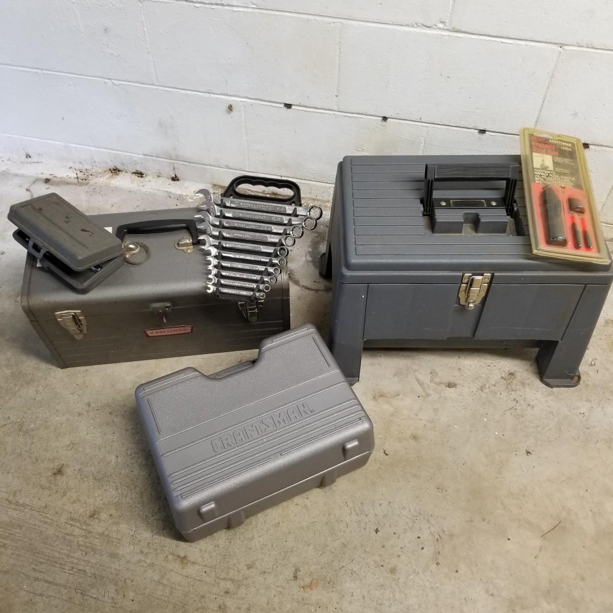 Handyman's special. One Craftsman metal toolbox,  18"x9"9", one tool/storage step with tray,  20"x13"x13".  One Craftsman impact tool set, a 1/4" socket set, one set of open end/box end SAE Craftsman wrenches. And one Craftsman socket multi chest with 1/4", 3/8" and 1/2" sockets. Note, lid on multichest does not latch. All items in fair to good condition.  See photos for detail.  Local pickup only.