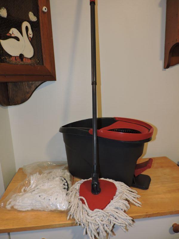 Wring mop with extra head. **Please read Terms and Conditions before placing a bid. Pick up is Thursday, August 15, 2019 from 4pm to 7pm or Sunday, August 18 from 11am-2pm in Mullica Hill. All sales are final. All sales are as is, where is. Please review all photos. Any props included in photos are not included in listing. All measurements are approximate.