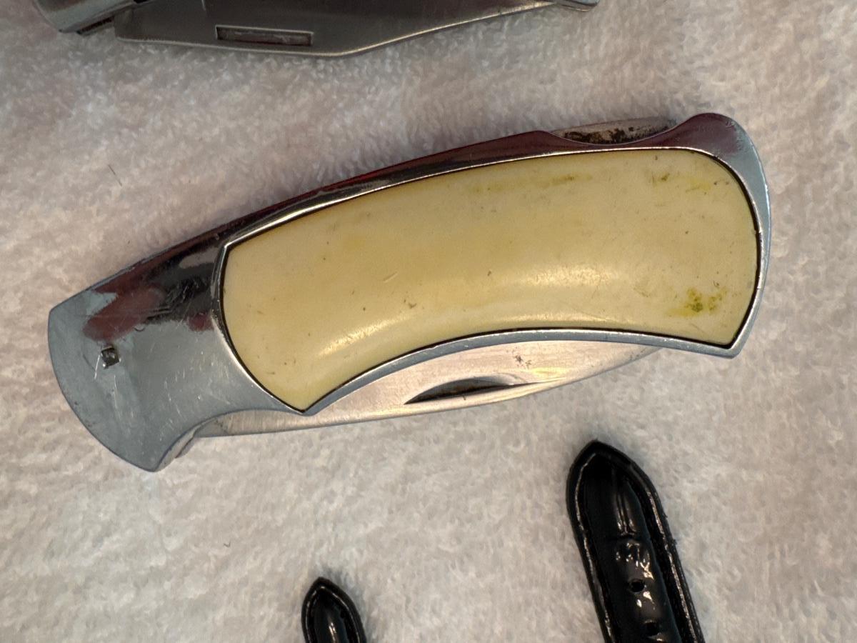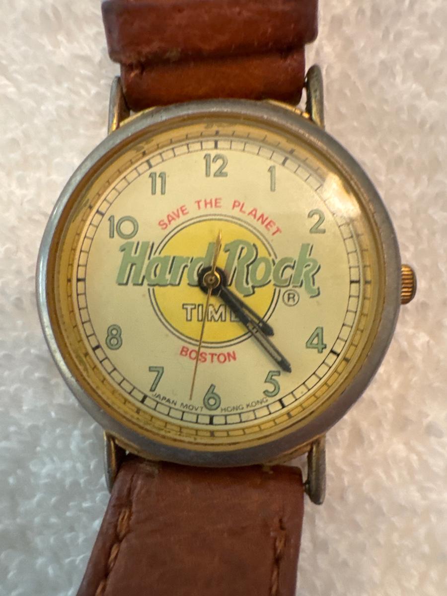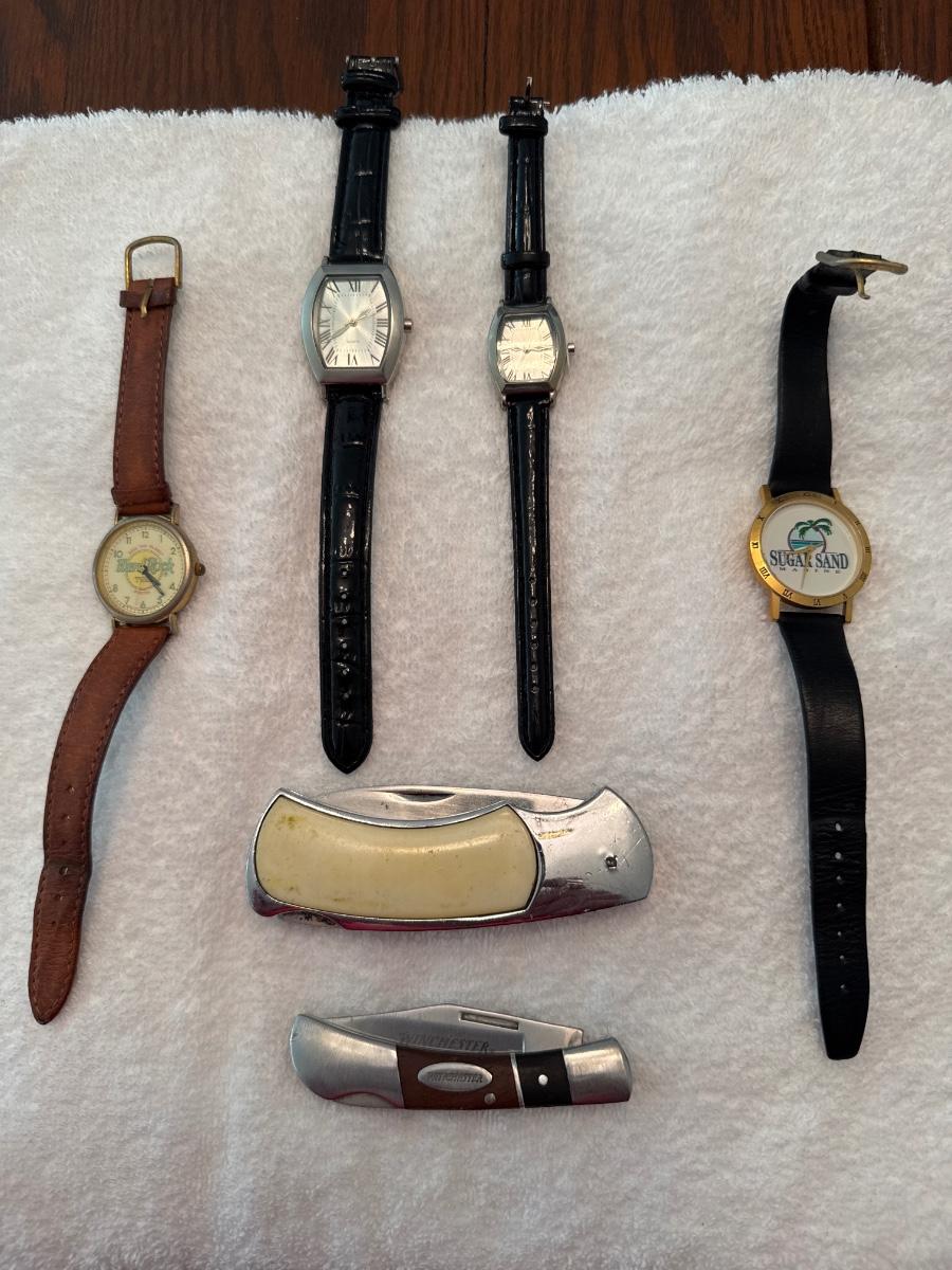 Wrist watches and pocket knives includes Winchester pocket knife, hard rock, hotel, watch Sugar Island, Marine, watch and 2 quartz watches his and hers.