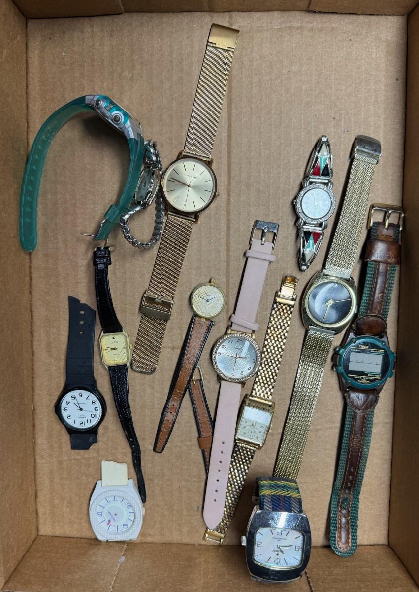 Makers include Clinton, Timex, Collezio, Croton, Casio, Gucci, Hannah Martin, and more. Total of 13 pieces. Age related wear. Not tested. [JL]