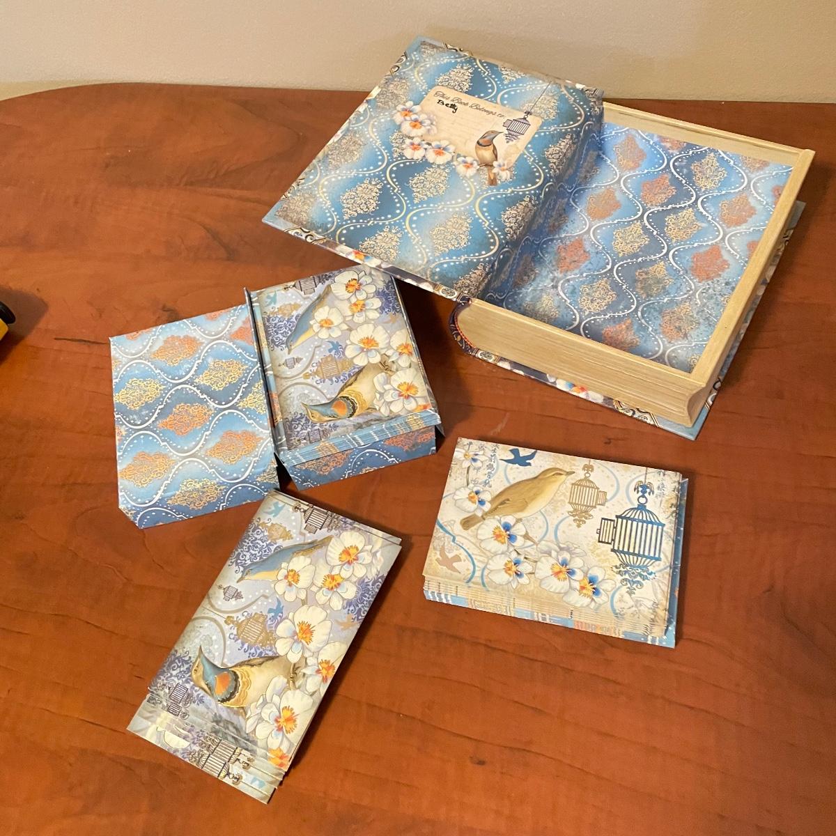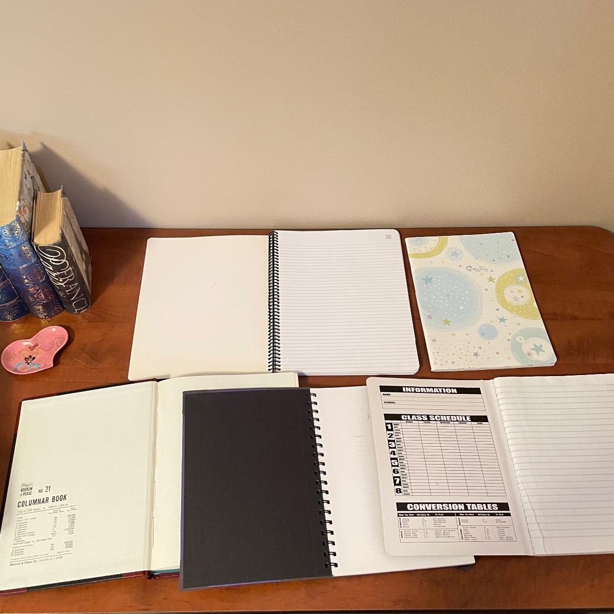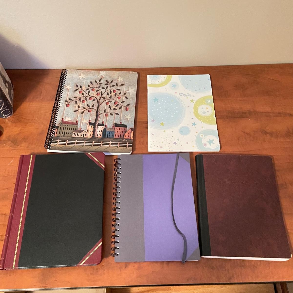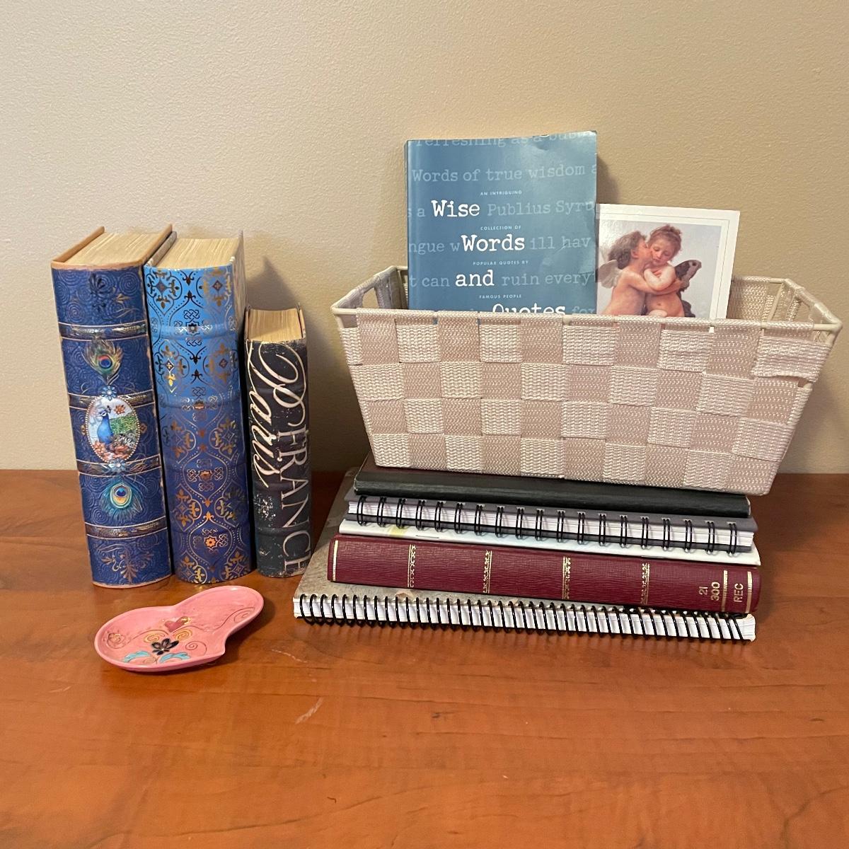 In this lot are five journals waiting for words along with, “Wise Words and Quotes” by Vern McLellan. This Lot also includes a charming ceramic 4.5” x 2.5” heart plate that appears to be hand painted. Lastly there are three storage box/faux books, one filled with black note cards and envelopes. See images. Local pick up only.