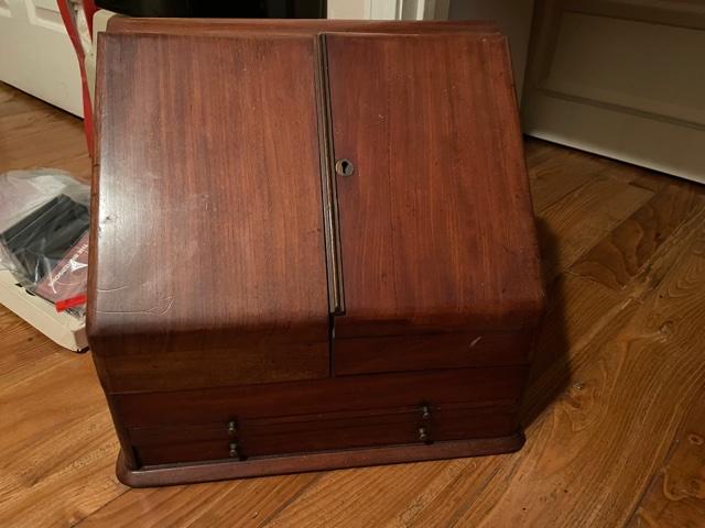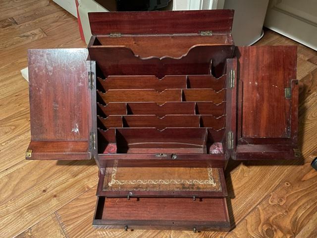 Writing Secretary has drawer, writing surface, and multiple cubby holes for everything from paper and envelopes to stamps to pens.