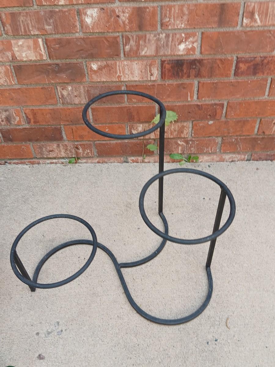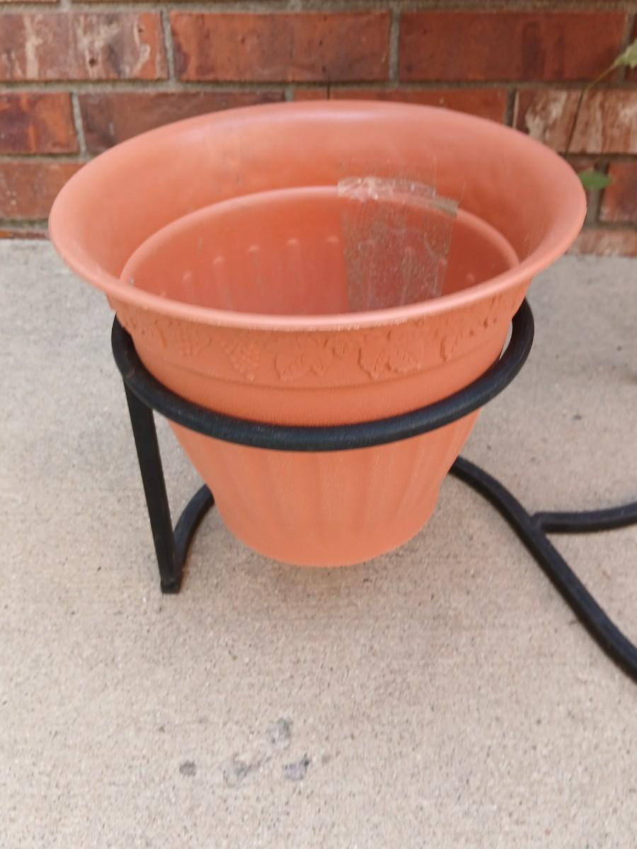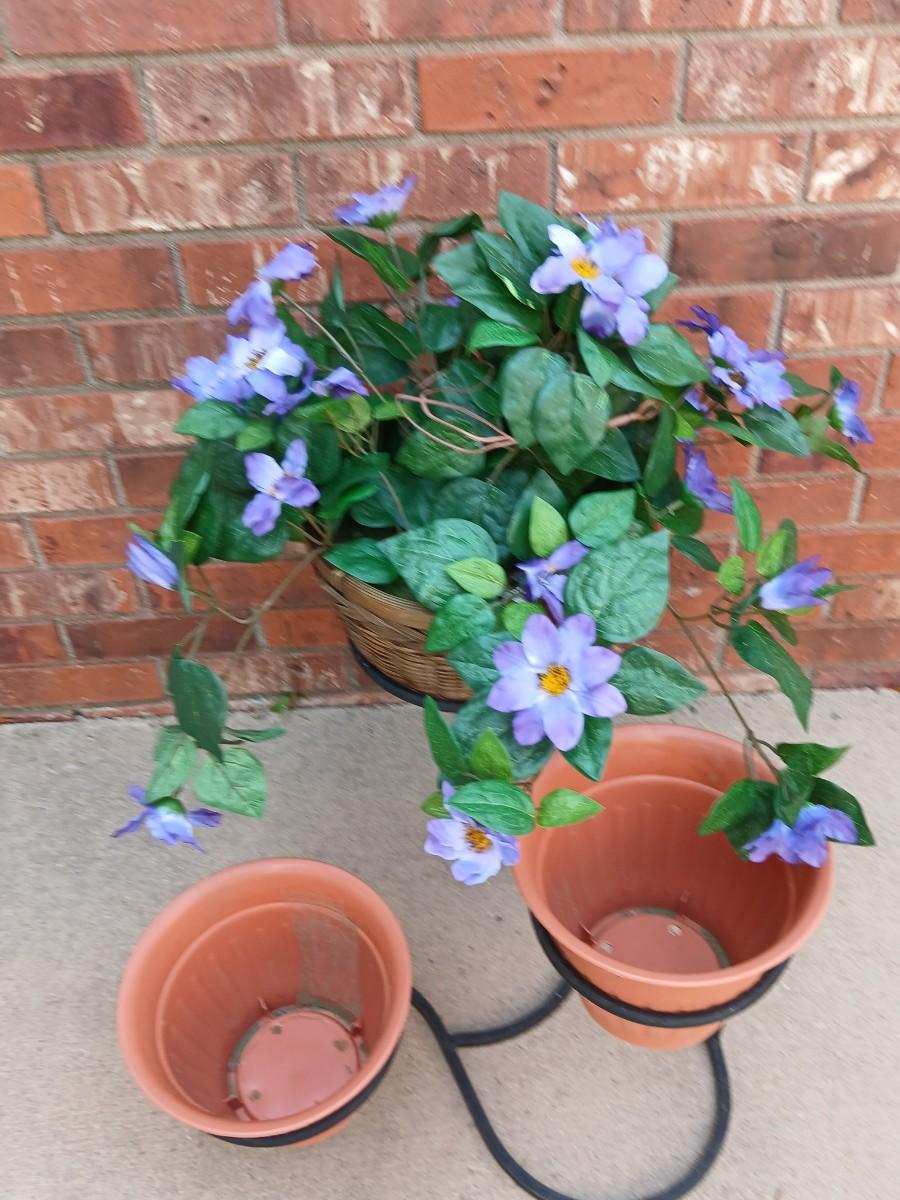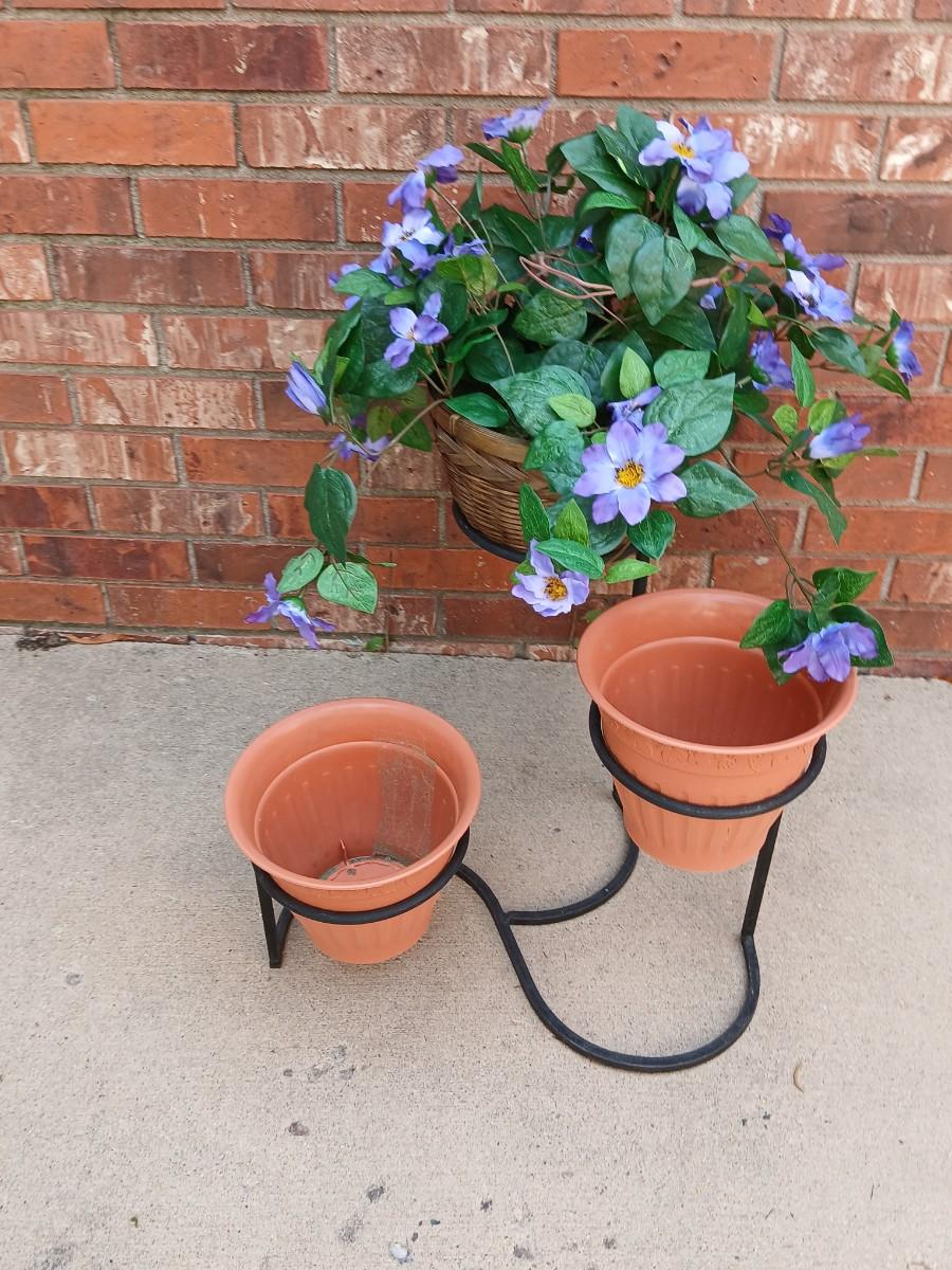 Wrought Iron plant stand with faux purple flowers and two pots