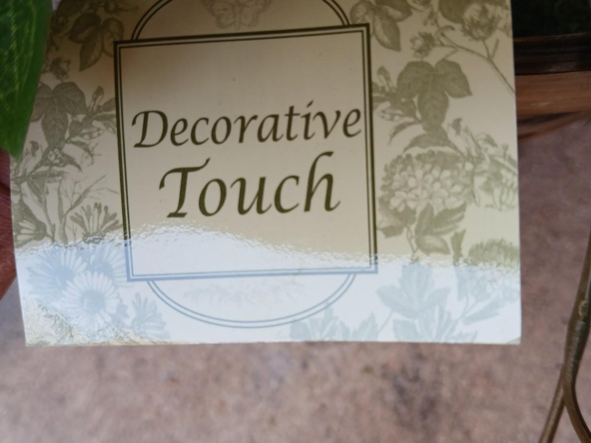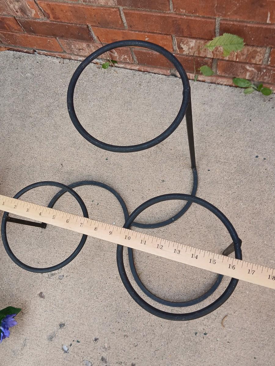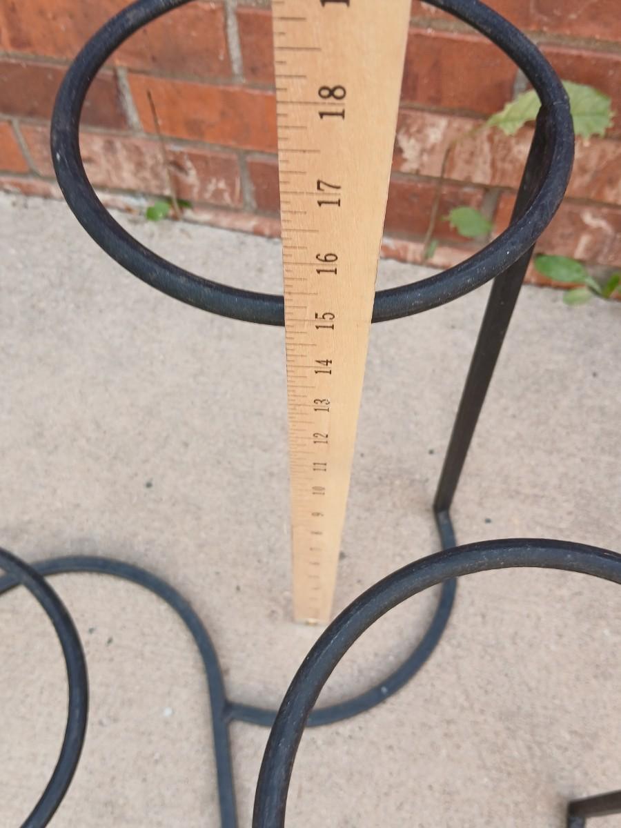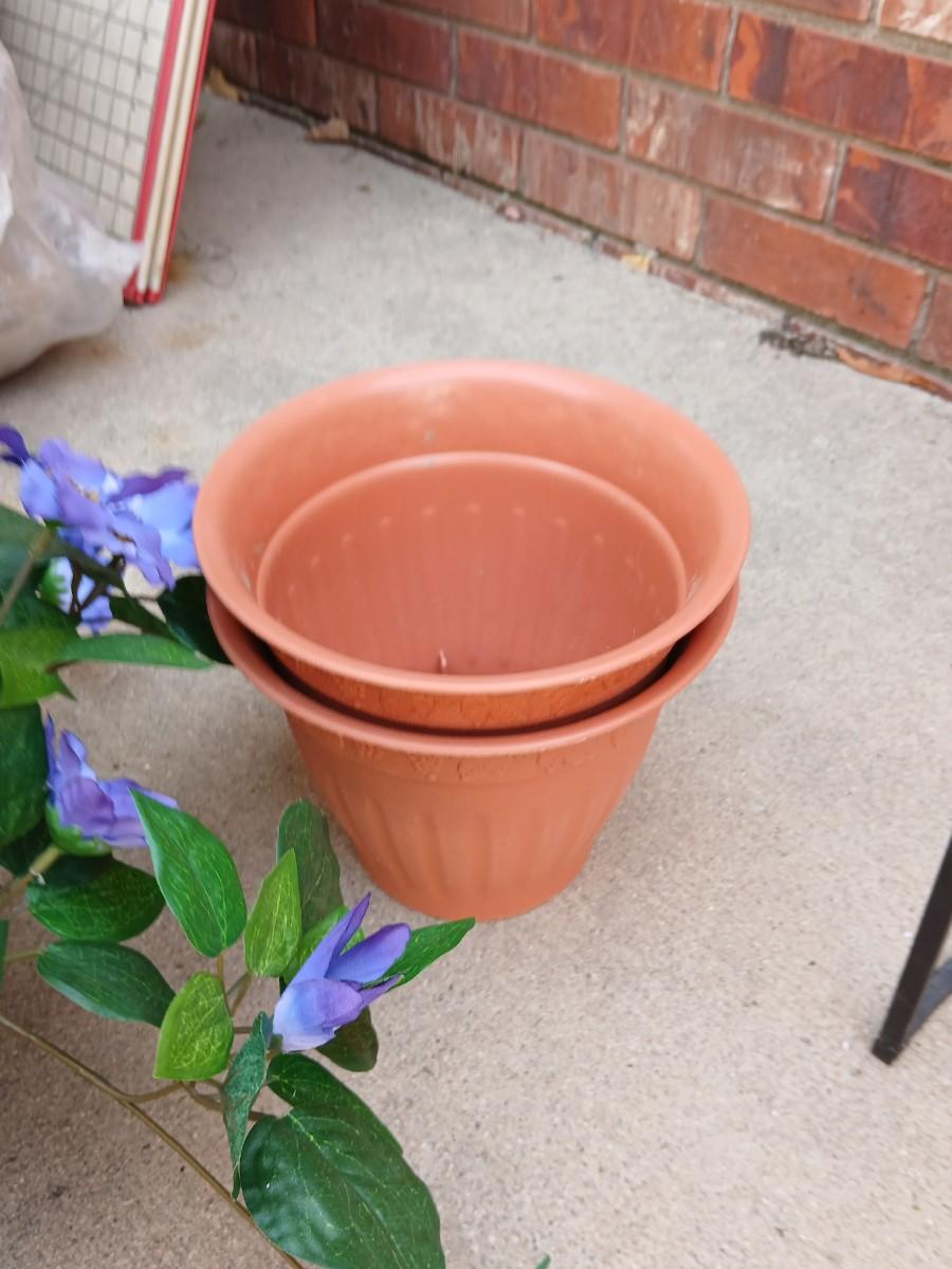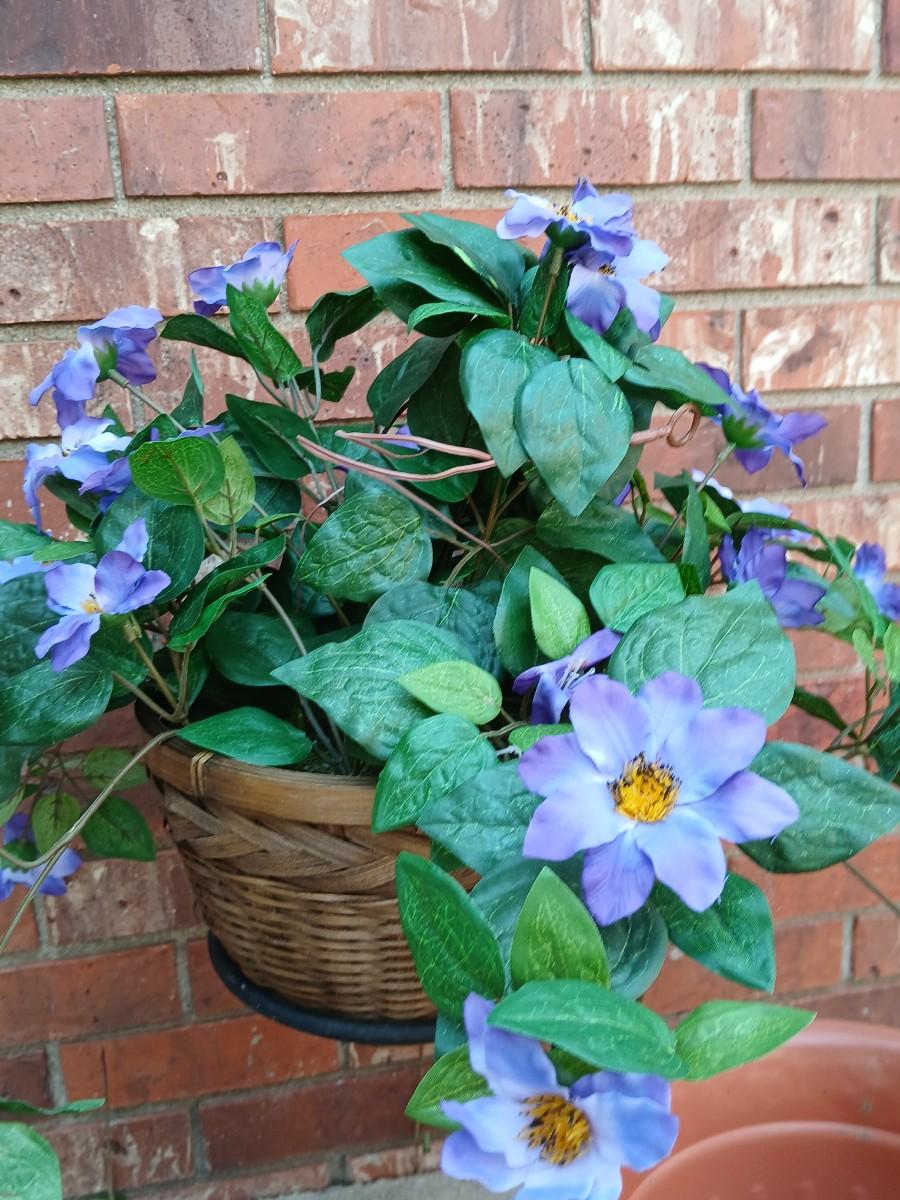 Wrought Iron plant stand with faux purple flowers and two pots